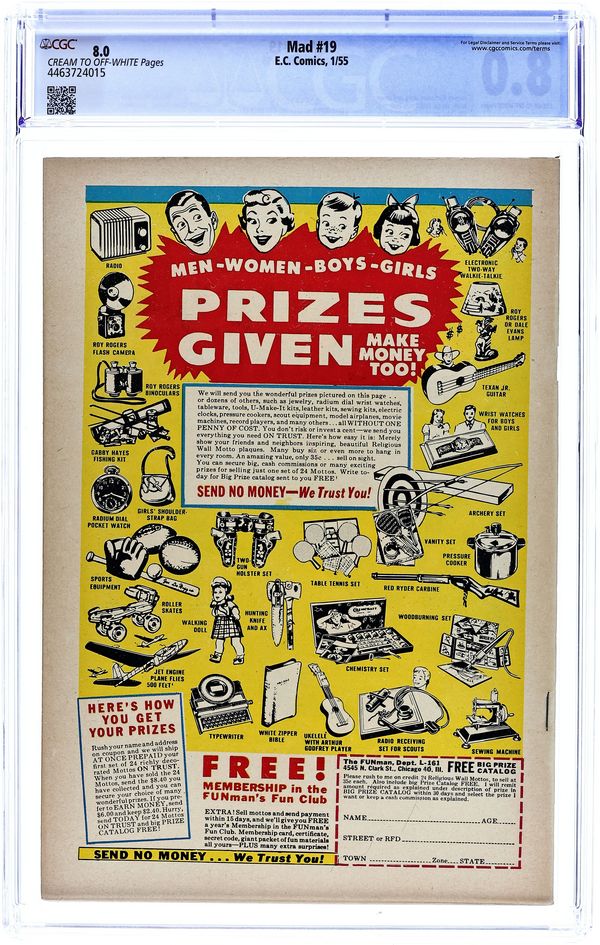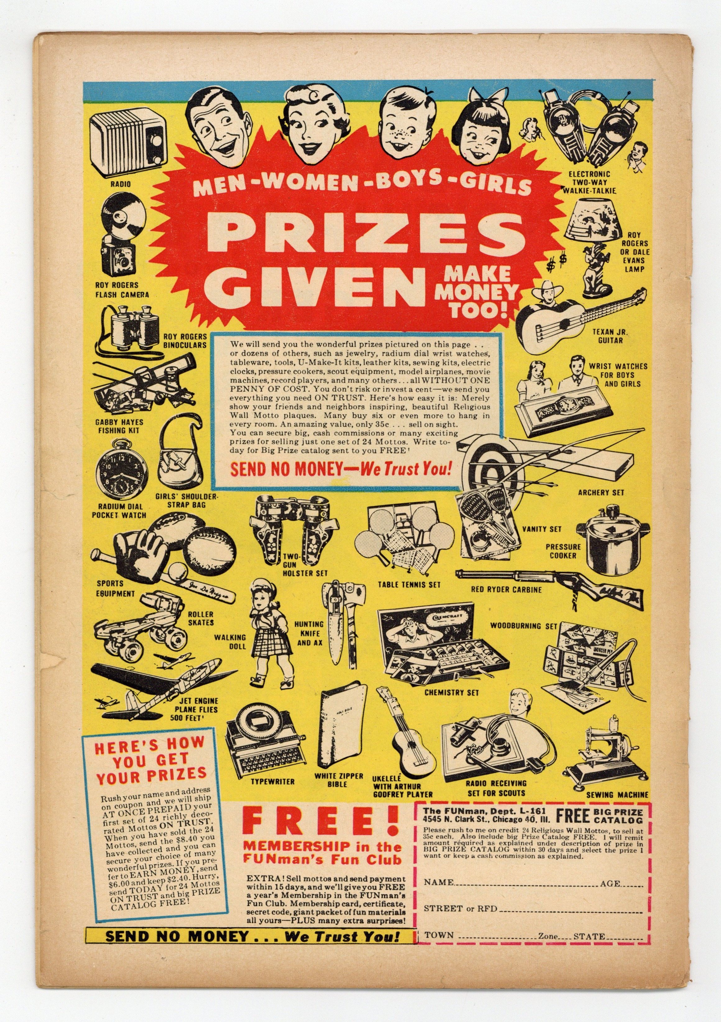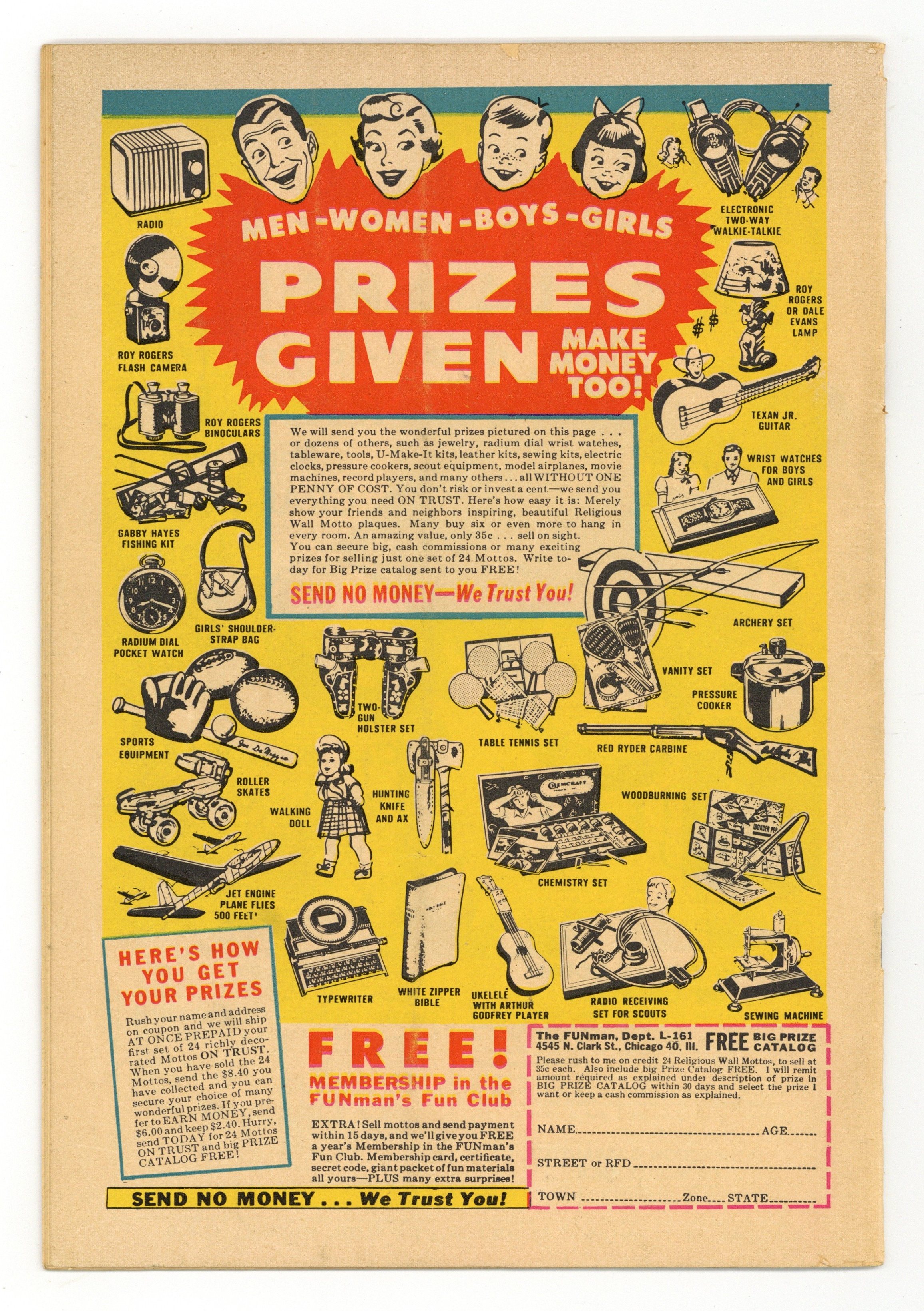 Ad for Panic comic book. "Mickey Rodent!", script by Harvey Kurtzman, art by Will Elder; Mickey tricks Darnold into a zoo to get rid of him; Parody of Walt Disney animated cartoons. "Supermarkets!", script by Harvey Kurtzman, art by Jack Davis; A look at America's obsession with supermarkets, as the Sturdley's survive the rigors of shopping. "Puzzle Pages!", script by Harvey Kurtzman, art by Will Elder; Parody of comic book activity pages. Ad for Piracy comic book. "The Cane Mutiny!", script by Harvey Kurtzman, art by Wally Wood; Parody of the movie "The Caine Mutiny." 36 pgs., full color. $0.10. Cover price $0.10.