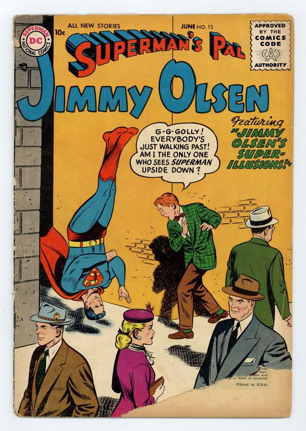 Cover pencils by Curt Swan, inks by Stan Kaye. The Six Jimmy Olsens; six boys named "Jimmy Olsen" try to solve a riddle posed by Mr. X. The Stolen Superman Signal; "Labs" Logan changes the signal frequency on Jimmy's watch so that Superman won't come to Jimmy's rescue when called. Jimmy Olsen's Super Illusions; Jimmy accidentally takes a picture of Clark turning into Superman. Scripts by Otto Binder, pencils by Curt Swan, inks by Ray Burnley. Jack the Giant-Wrecker text story by Joe Maxwell. 36 Pages, Full Color. Cover price $0.10.
