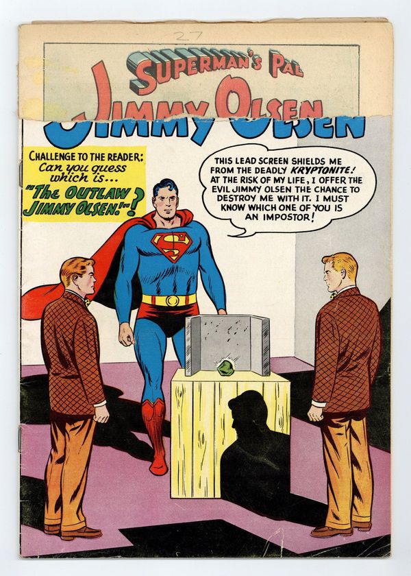 Cover pencils by Curt Swan, inks by Stan Kaye. The Boy from Mars; Jimmy tells everyone at the Daily Planet that he's from Mars. A Date with Miss Metropolis; Miss Metropolis wants to date Jimmy, but he's disappointed to discover she's unattractive. The Outlaw Jimmy Olsen. Scripts by Otto Binder, pencils by Curt Swan, inks by Ray Burnley. Little Pete humor page by Henry Boltinoff. Varsity Vic humor page by Henry Boltinoff. Jerry Jitterbug humor page by Henry Boltinoff. Do You Know What's Behind a Law? public service announcement, script by Jack Schiff, art by Bob Brown. 36 Pages, Full Color. Cover price $0.10.