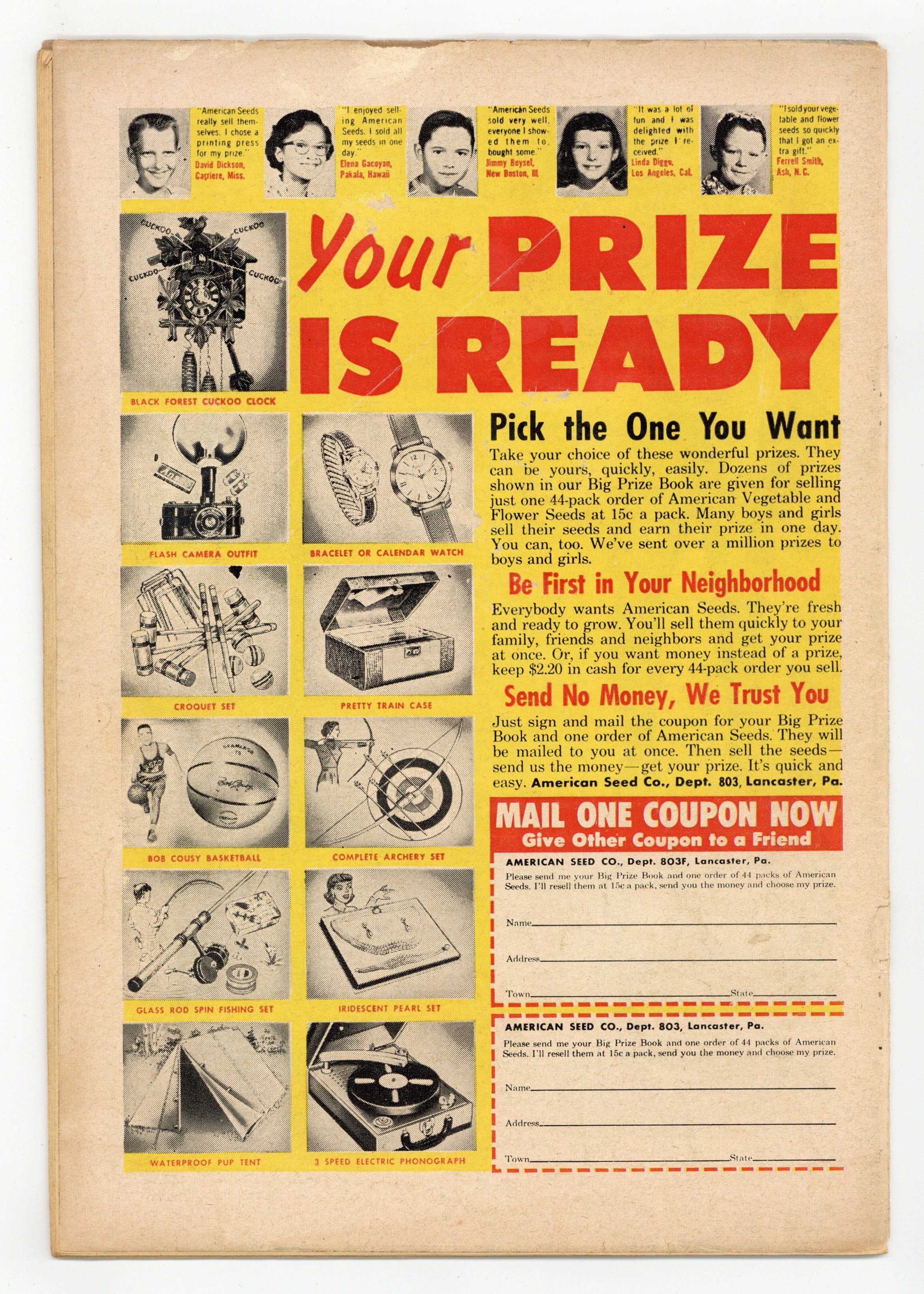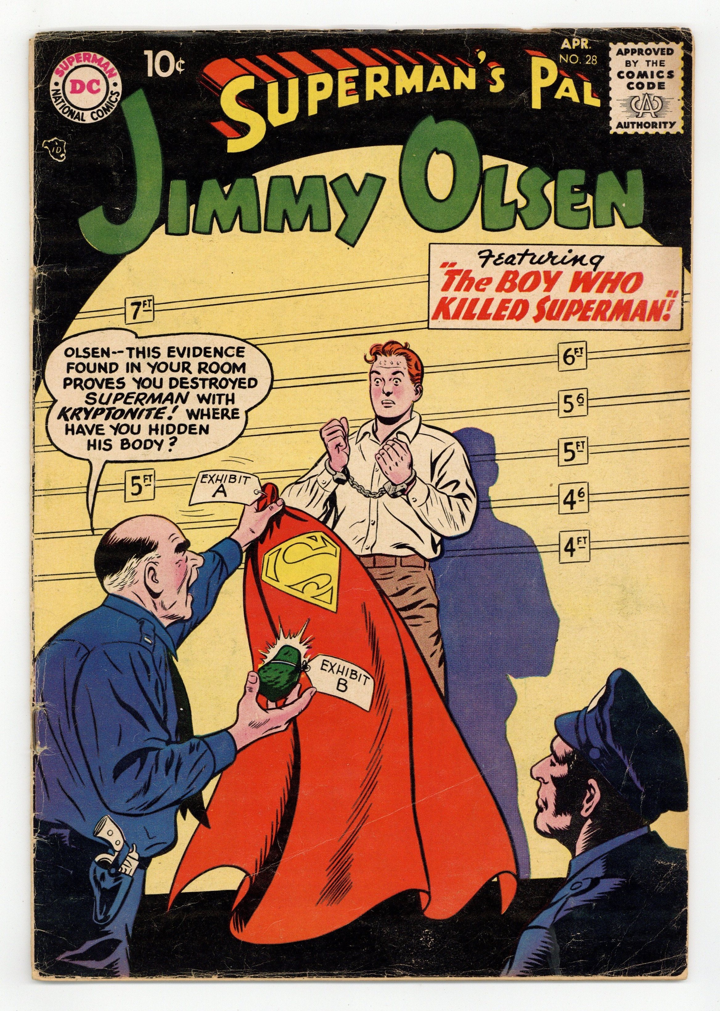 Cover pencils by Curt Swan, inks by Stan Kaye. The Spendthrift and the Miser; two scam artists convince Jimmy to waste his money. Tricksy humor page by Henry Boltinoff. The Boy Who Killed Superman; Jimmy is transported to the 60th century, where he's seen as a villain. The Human Skyscraper; When Prof. Potter gives Jimmy the wrong pill for a toothache, Jimmy ends up several stories tall, with the mind of a child. Scripts by Otto Binder, pencils by Curt Swan, inks by Ray Burnley. The Secret of the Happy Pig! public service announcement starring Peter Porkchops, script by Jack Schiff, art by Rube Grossman. Varsity Vic humor page by Henry Boltinoff. 36 Pages, Full Color. Cover price $0.10.