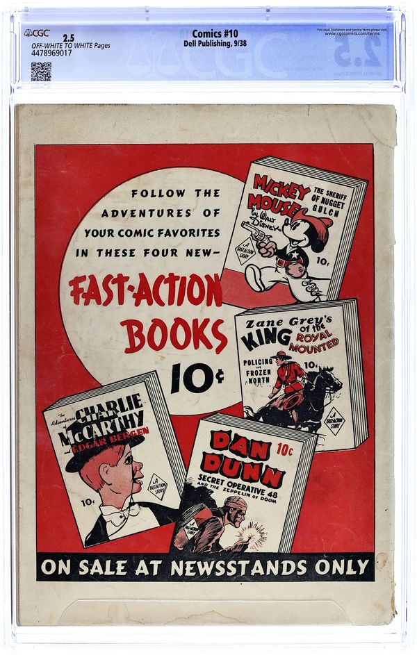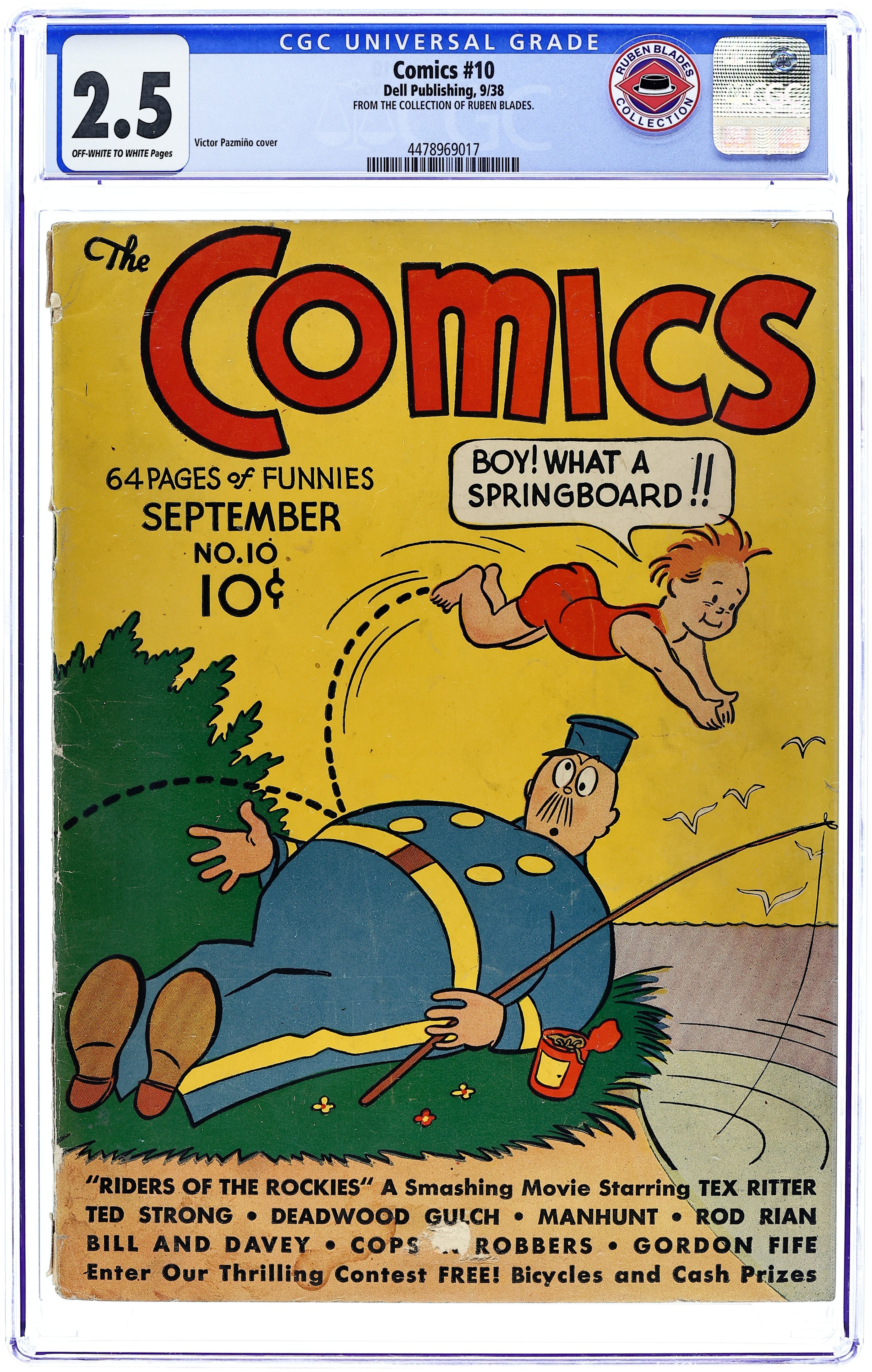 Cover by Victor Pazmiño. Stories and art by Sheldon Mayer, Boody Rogers, Charles Payne, J.R. Williams, C. D. Small, Al Carreño, Victor Pazmiño, A. W. Nugent, Stookie Allen, Augustus Robinson, James McCague, Tack Knight, Paul Jepsen, Norman Fallon, Courtney Dunkel, Adolphe Barreaux, Tex O'Reilly, Jack A. Warren, Walter Galli, Robert Weinstein, Ed Cronin, Bob Moore, and Carl Pfeufer. Edited by comics pioneers M.C. Gaines and Sheldon Mayer, The Comics presented original stories, art reprinted from Dell's Big Little Books, and reprints of classic newspaper strips. Arizona Ranger Tex Ritter and his pals Doc and Pee Wee track rustlers to the Mexican border and get framed for their trouble, in an adaptation of the 1937 Western movie Riders of the Rockies. A Deadwood Gulch story by Sparky Watts creator Boody Rogers. Space Policeman Rod and Unicor Warrior Taro discover why their prison is called the Island of the Living Dead. S'Matter, Pop?; Salesman Sam; Ted Strong; Tex Ritter: Riders of the Rockies; Gags and Giggles; Out Our Way; Stop Look and Laff; Cowboy and Indian Lore; My Big Brudder; How to Make the "Balsa Bullet"; Little Artists; Decks Awash; Sailor's Knots and Seaman's Ways; Deadwood Gulch; Bill and Davey; Crossword Puzzle Page; Rod Rian of the Sky Police; Manhunt: A True F.B.I. Story; The Enchanted Stone of Time; Pecos Bill; It's the Truth!; Victorious Valor; Cap'n Cloud; Comic Puzzles; Clancy the Cop; Gordon Fife and the Boy King; Headliners; Thrill-Hunters; Bachelor Bowers; Be a Big Leaguer: Catcher. 64 pages, Full Color. Cover price $0.10.