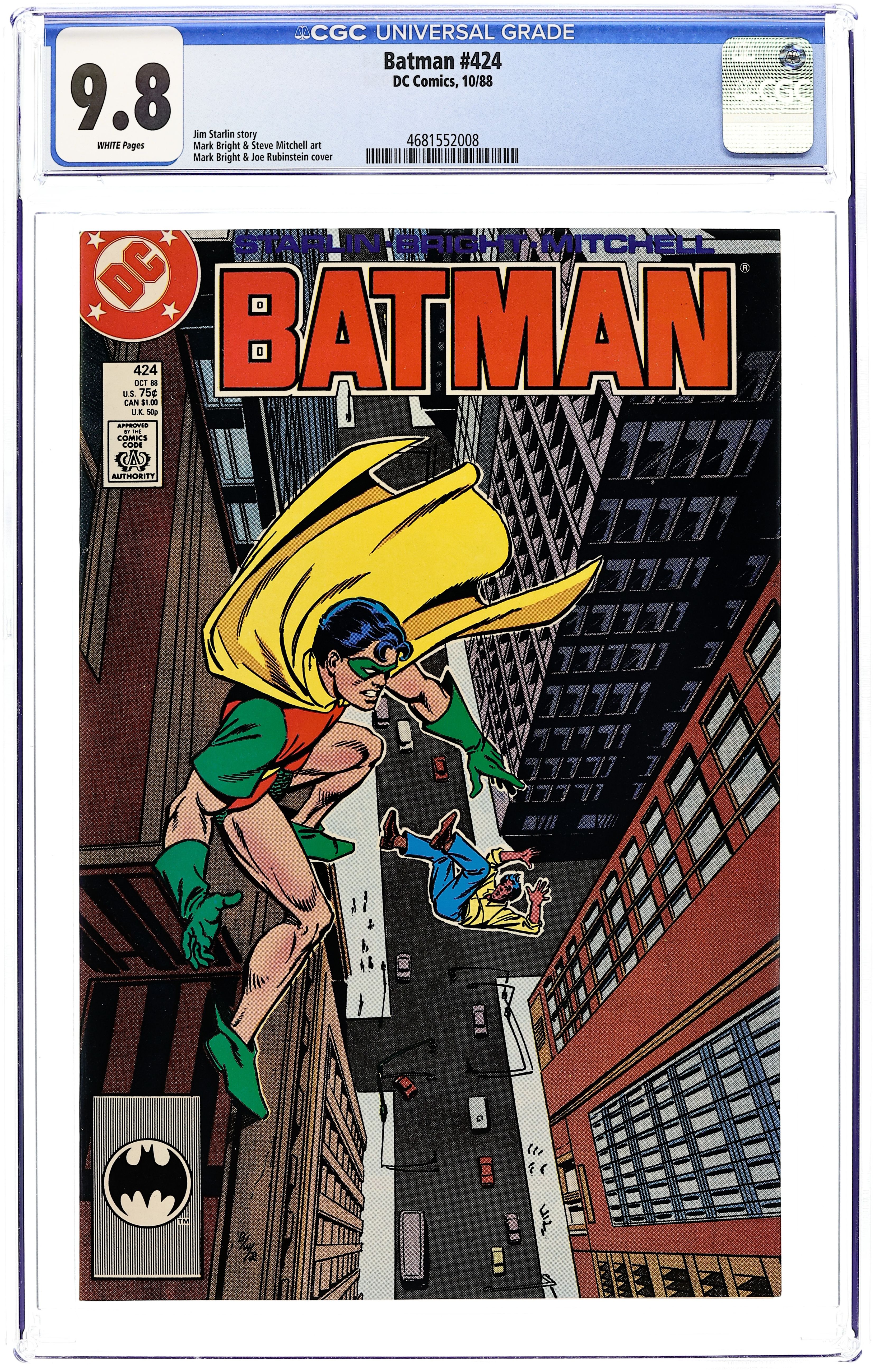 1st printing. Direct Edition. Robin vows to take down Felipe Garzonas for his crimes, no matter the cost, in "The Diplomat's Son". Part 1 of 2, continued next issue. Script by Jim Starlin, pencils by Mark Bright, inks by Steve Mitchell. 1st printing. NOTE: Most issues from 397-432 were reprinted in 1989 and sold in multipacks. These 2nd and 3rd prints have back cover ads dated 1989. 36 Pages, Full Color. Cover price $0.75.