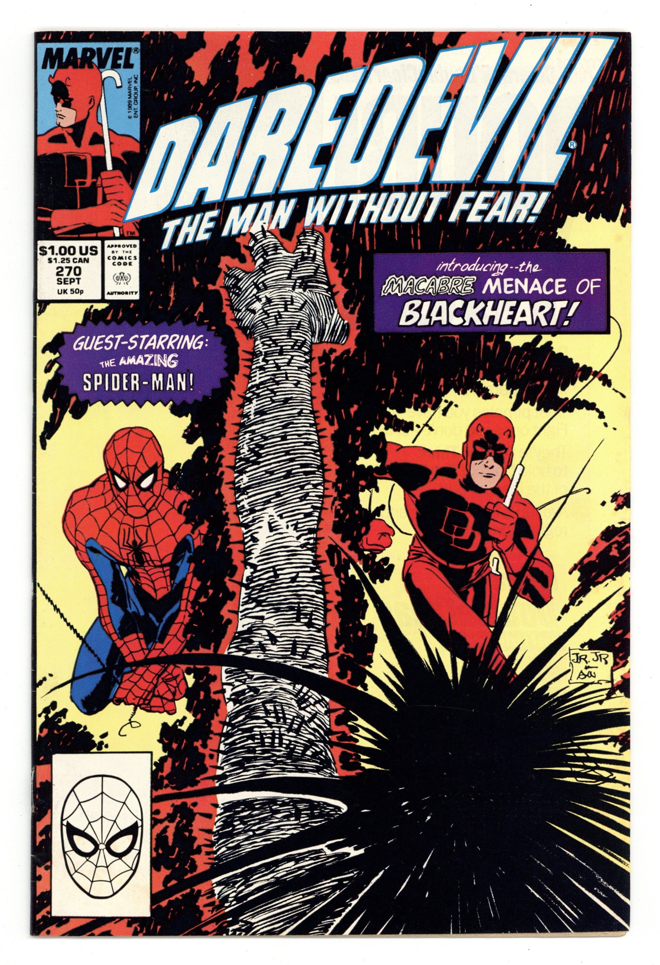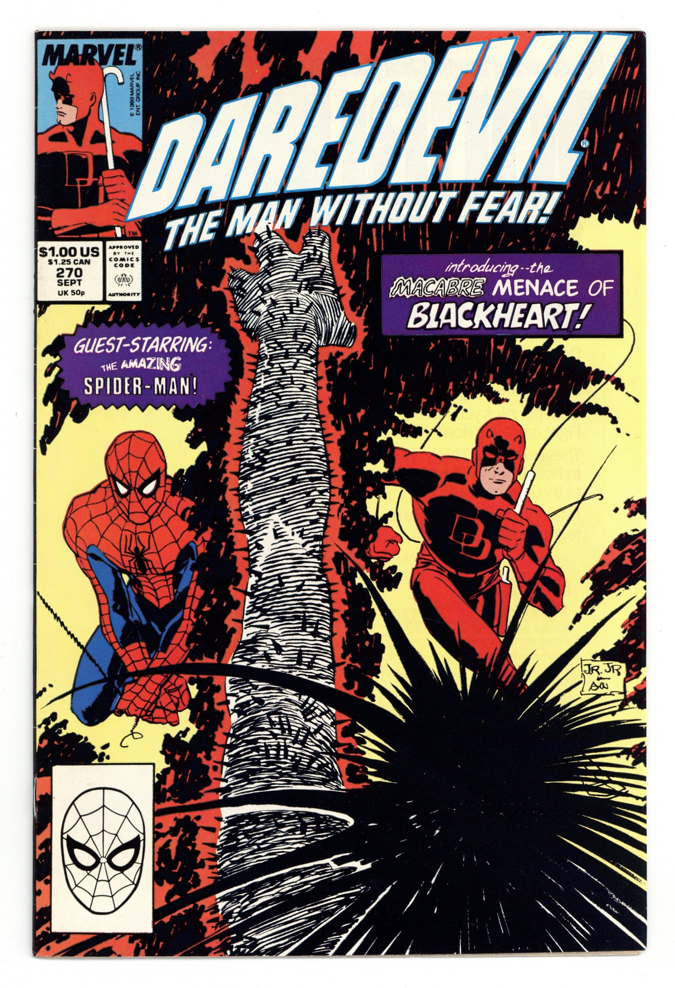 Direct Edition. Cover pencils by John Romita, Jr., inks by Al Williamson. 1st appearance of Blackheart (the son of Mephisto) in Blackheart!, script by Ann Nocenti, pencils by John Romita, Jr., inks by Al Williamson; On a hill of humanity's evil, Blackheart is born and DD and Spider-Man have to fight like the devil to take him down; Mephisto appearance. First $1.00 cover price. 36 pgs. Cover price $1.00. Cover price $1.00.