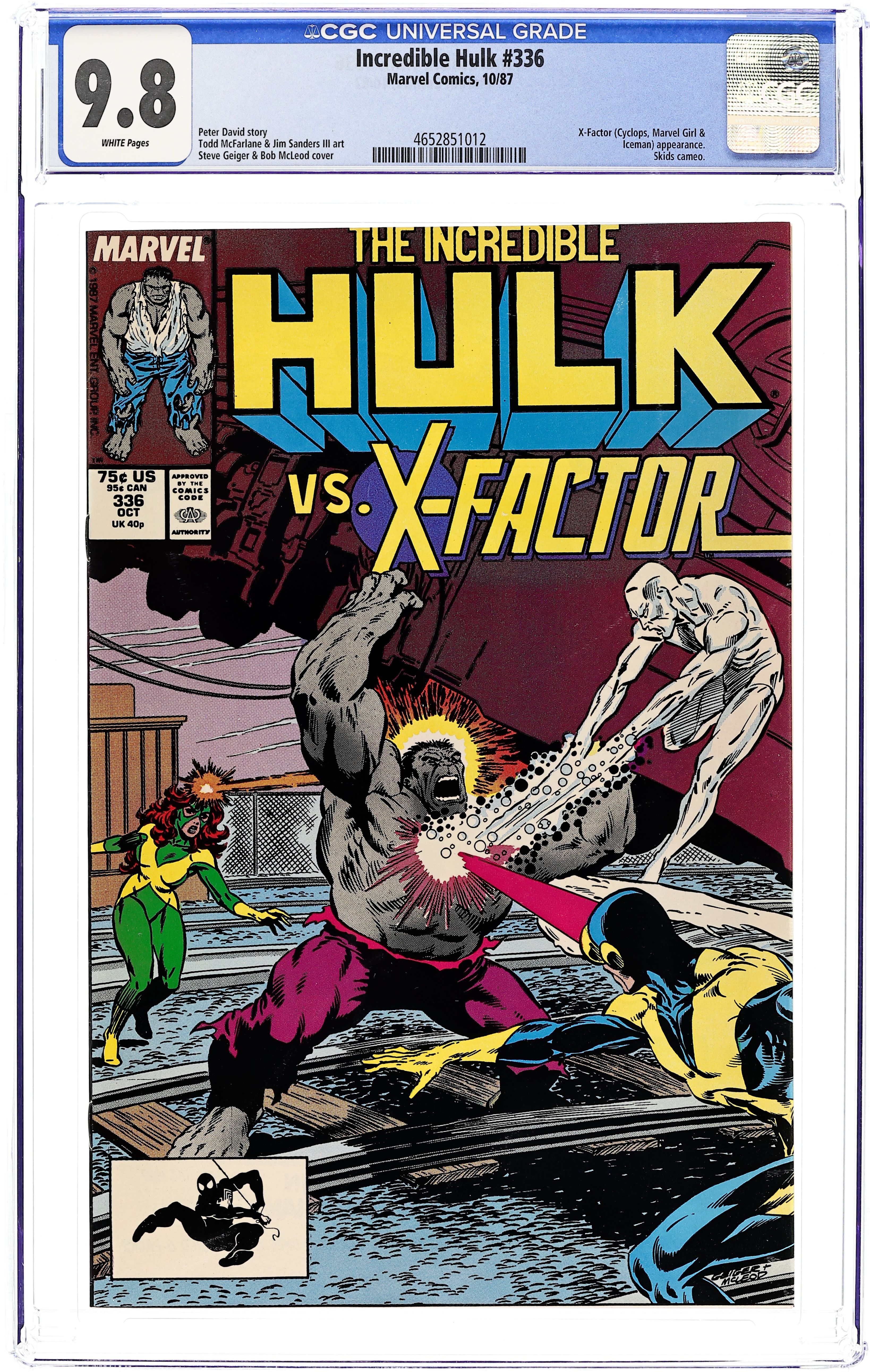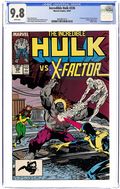 Direct Edition. "X-Tremes!" Guest-starring X-Factor (Cyclops, Jean Grey, and Ice Man). Story by Peter David. Art by Todd McFarlane and Jim Sanders III. The Incredible Hulk vs. X-Factor! Seen as the Hulk, Bruce Banner is thought to be a mutant, so the mutant hunting X-Terminators are called in to handle this menace. Little does the mutant fearing public realize but the X-Terminators are in fact the original X-Men. Cyclops, Jean Grey, Ice Man, Beast, and the high flying Angel, now known as X-Factor, use the mutant hysteria as a cover to find and help mutants. The Hulk could care less, he just wants to smash something. 36 pages. Cover price $0.75.