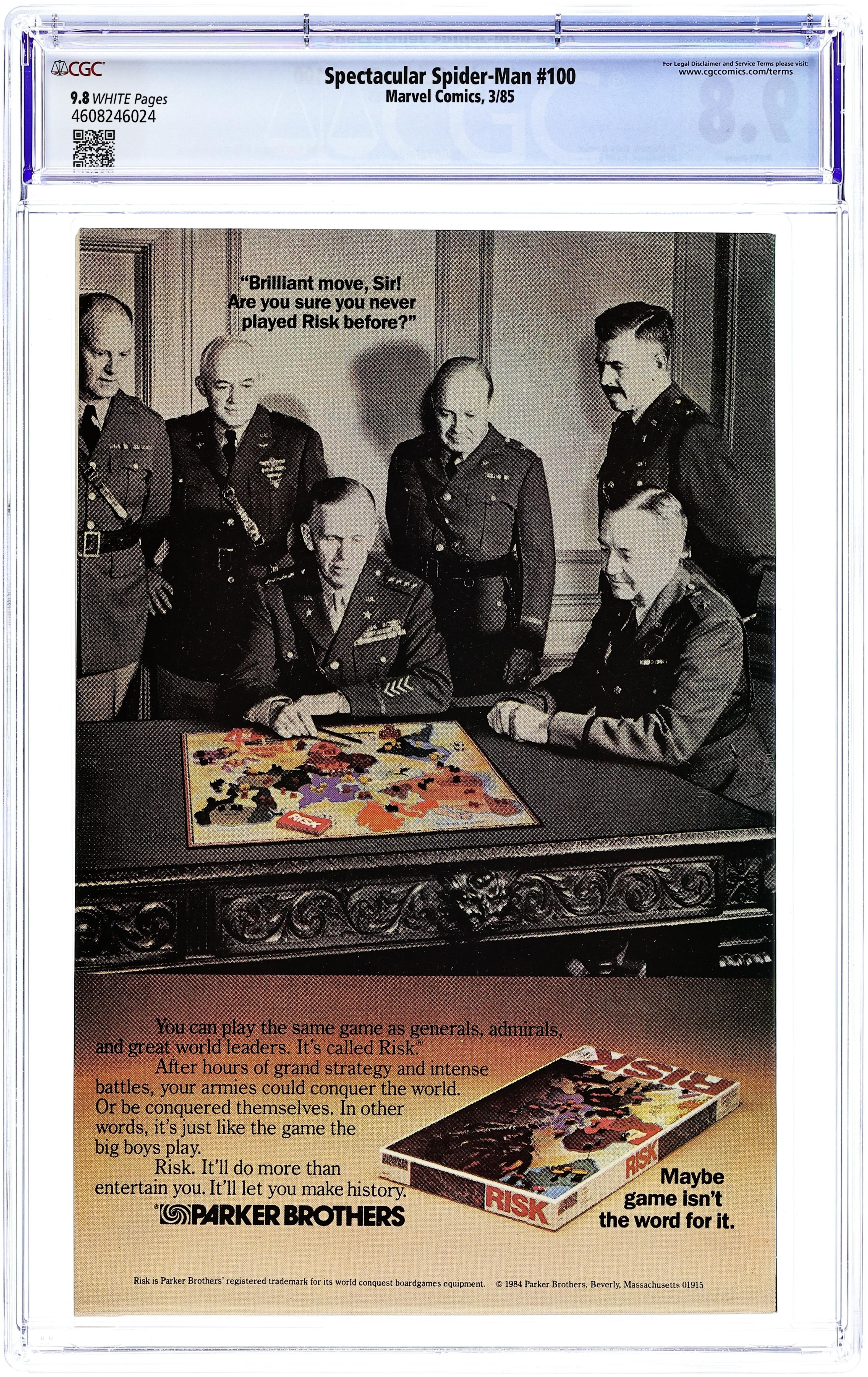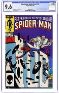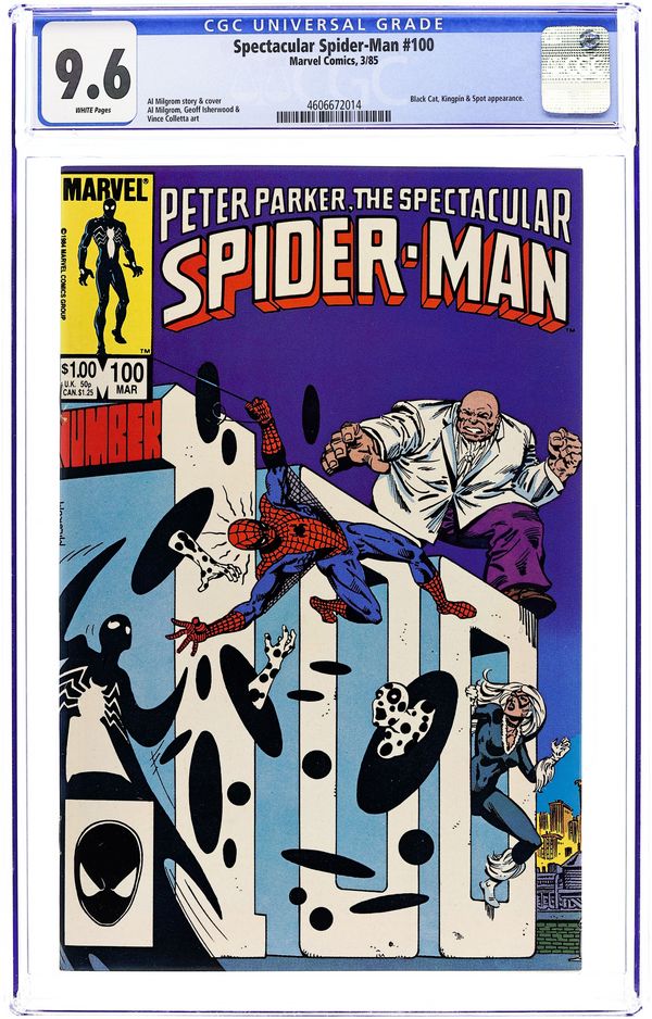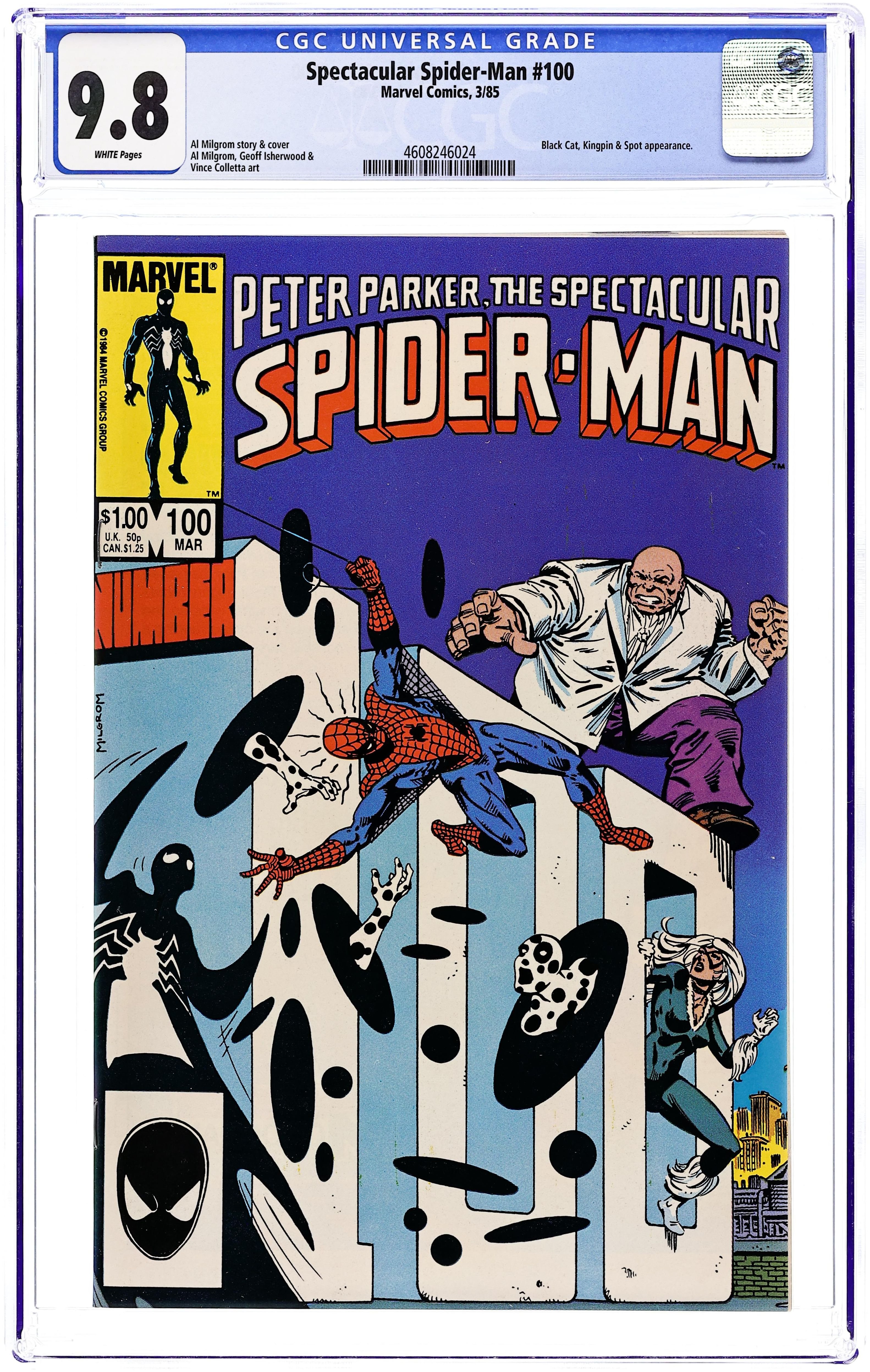 Direct Edition. "Breakin'!" Double-sized issue. Script and Pencils by Al Milgrom. Inks by Vince Colletta and Geof Isherwood. Cover by Al Milgrom. The wall-crawler returns to the Kingpin's skyscraper, but again runs into the pesky Spot! While Spider-Man fights the Spot, the Black Cat confronts the Kingpin and learns the tragic secret of her bad luck powers. A dejected Felicia elects not to attack the massive crime boss, but a few minutes later...the Spectacular Spider-Man does! It's a great slugfest between the Kingpin and the web-slinger! Meanwhile, as the battle is raging at the Kingpin's tower, the alien symbiote slips into Peter Parker's closet...and waits! (Note: The alien symbiote plot line continues in Web of Spider-Man 1.) 48 pages Cover price $1.00.