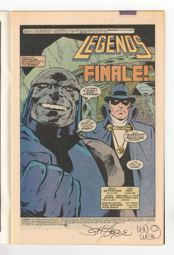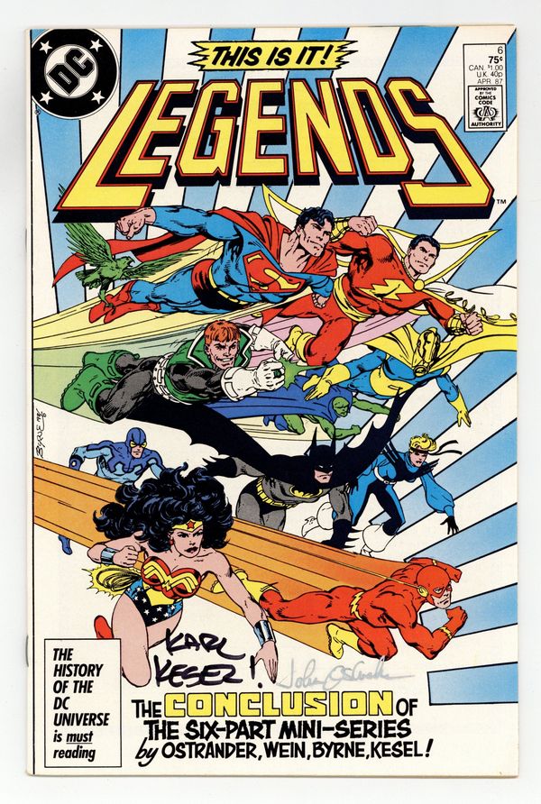 Tags: Legends (DC) (part 21.1)$99.99- Signed by John Ostrander and Karl Kesel on cover and John Byrne and Len Wein on first page. No autograph certification is included.