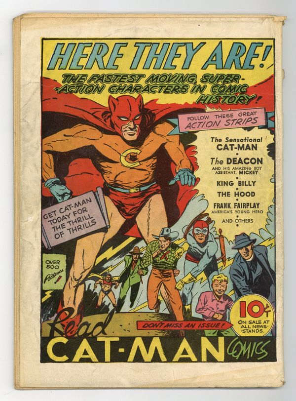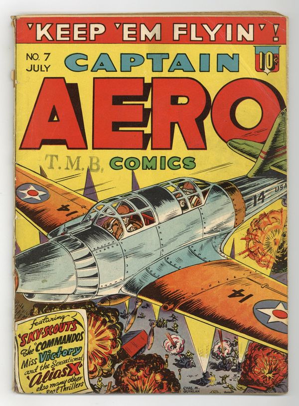 Cover by Charles Quinlan. Stories and art by Sol Brodsky, Allen Ulmer, Saul Rosen, Louis Golden, Ed Murphy, Charles Quinlan and Alan Mandel. Sometimes listed as Captain Aero Comics Vol. 2 #1. A patriotic WWII aviator hero whose motto is "Keep 'Em Flyin'!" Captain Aero's Sky Scouts face the sinister stranger known as the Charmer. In her civilian identity, Miss Victory visits her old hometown and finds trouble amid the defense industry. Alias X tracks the Phantom of the Opera-like Dr. Barbon through subterranean tunnels to rescue Barbon's captive, the woman who rejected him. Captain Aero; Alias X; Commandos of the Devil Dogs; Al Addin and the Magic Hour Glass: Cleopatra; Paradise Island; P.T. Patrol; Captain Aero's Sky Scouts: The Charmer; They Will Live Forever: Scarsdale Jack; Miss Victory; The Enchanted Woods; Flagman. 68 pages, Full Color. Cover price $0.10.