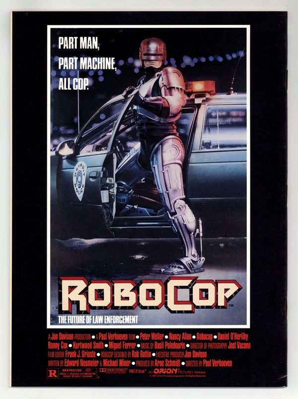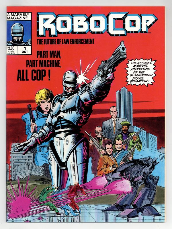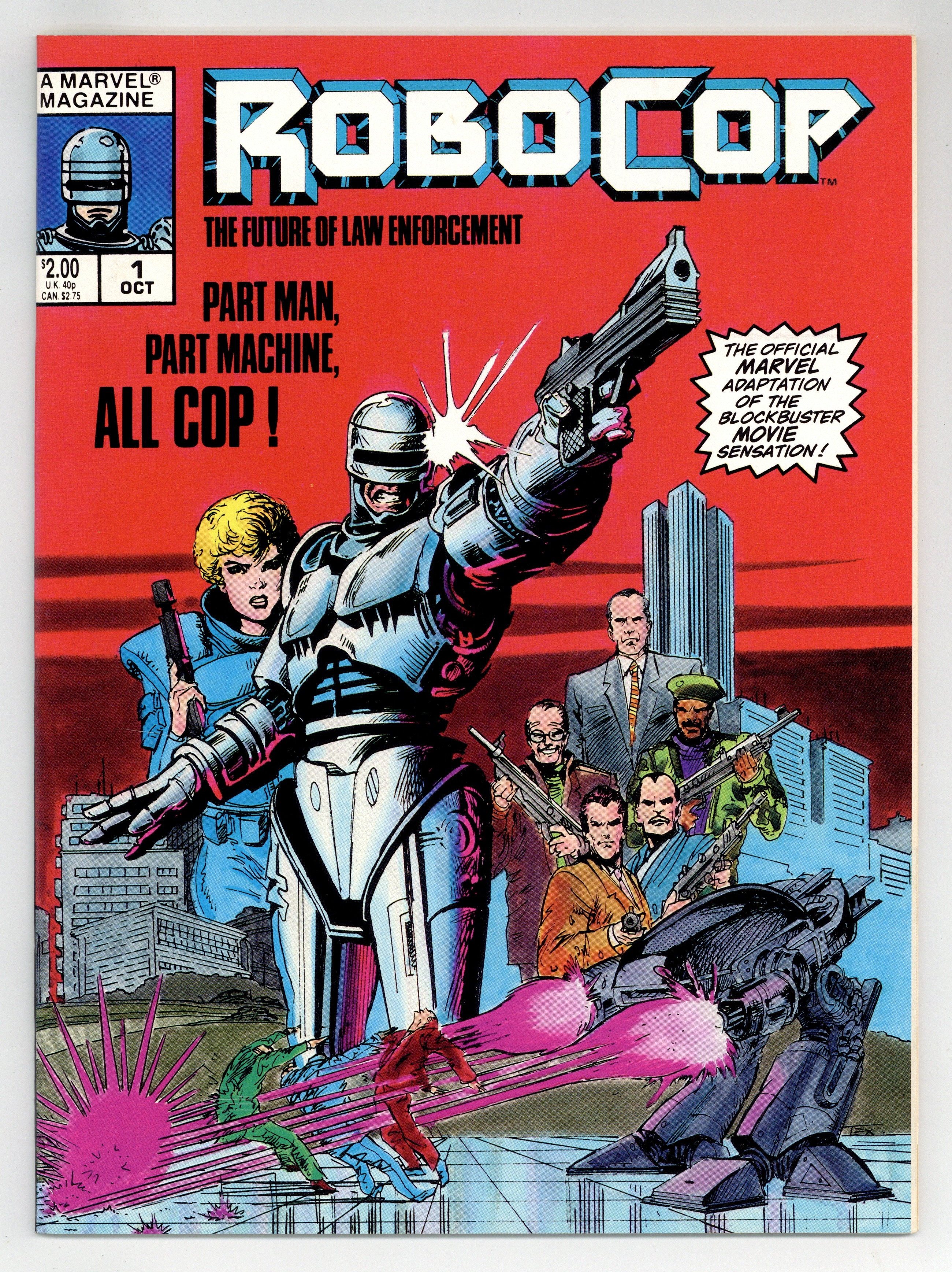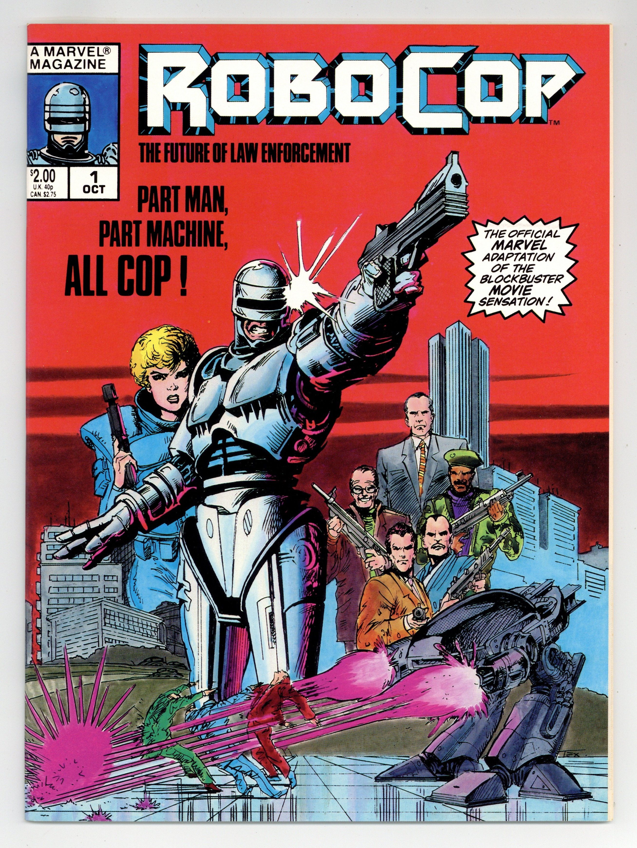 Official Marvel adaptation of the blockbuster movie sensation! Written by Bob Harras. Art by Javier Saltares, Alan Kupperberg and Tony DeZuniga. Cover by Mark Texeira. Part man, part machine, all cop! Step into the future and meet RoboCop, the half-man, half-machine cyborg policeman. But while many things may be different in the future, criminals are still as dangerous as ever! A Marvel Magazine. NOTE: While Direct Editions have a OCT cover date and Newsstand Editions have a NOV cover date, they are treated and sold as the same. 48 pages, B&W. Cover price $2.00.