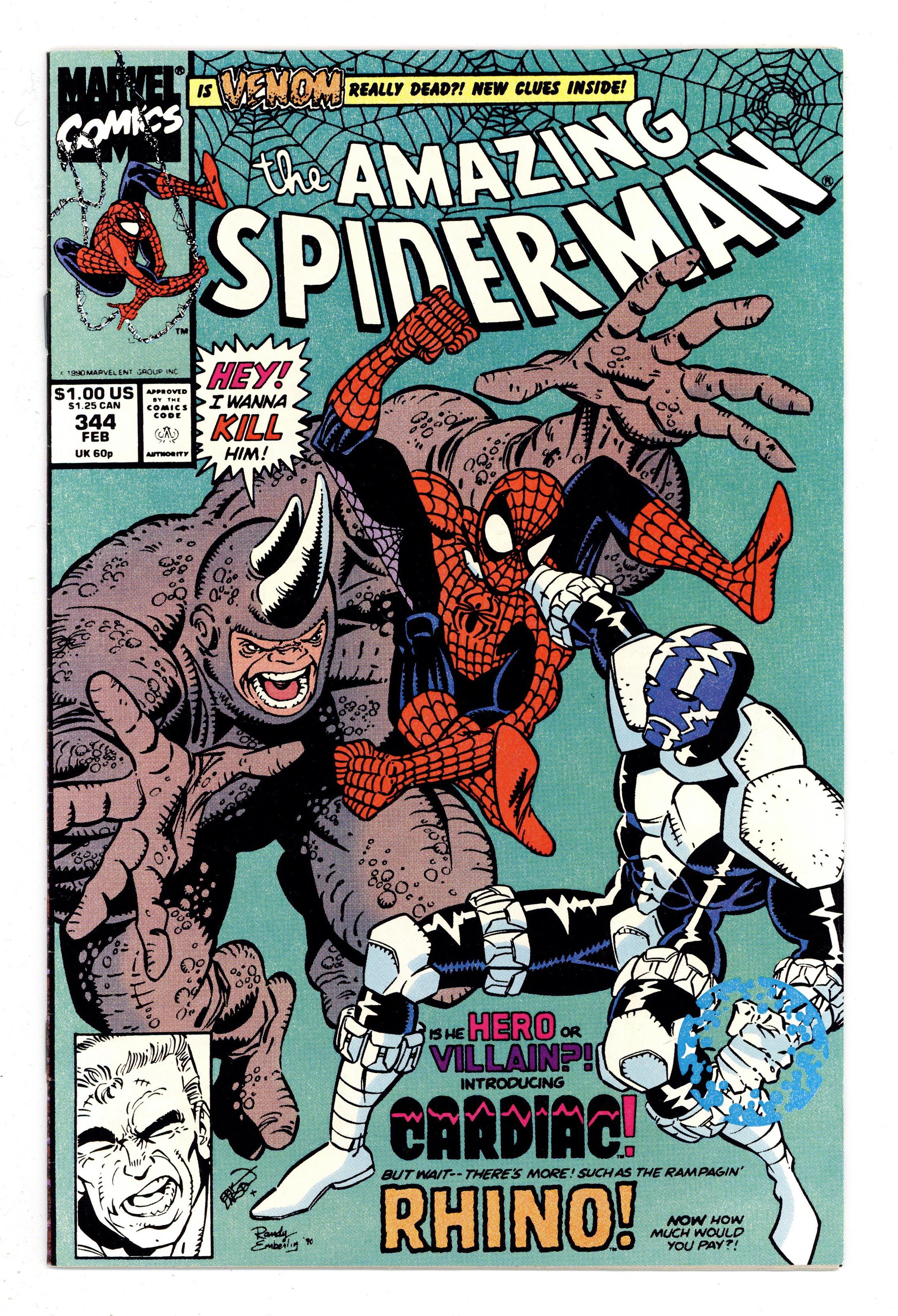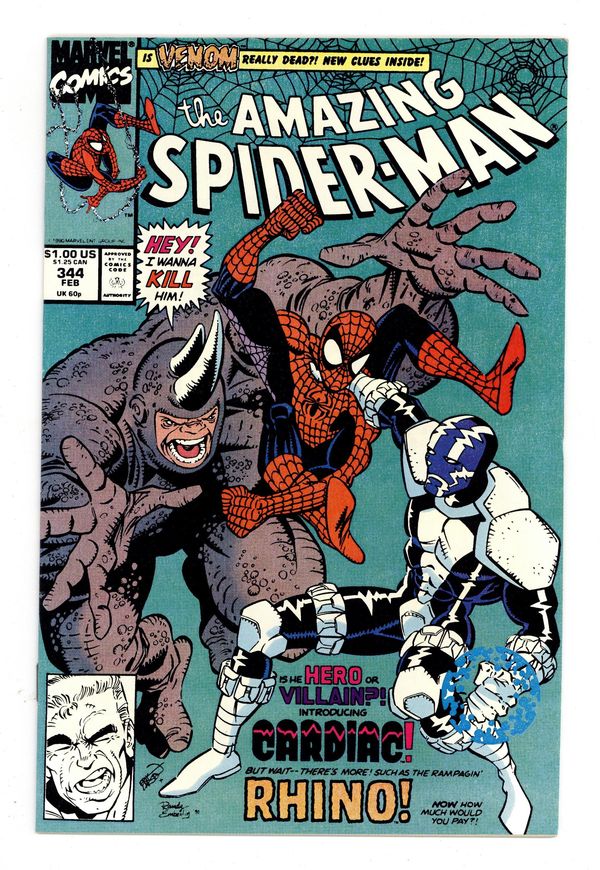 Tags: Marvel Legacy Numbering: Amazing Spider-Man (part 344), Spider-Man$14.50Direct Edition. First appearance of Cletus Kasady aka Carnage in "Hearts and Powers." Script by David Michelinie. Pencils by Erik Larsen. Inks by Randy Emberlin. Cover by Erik Larsen and Randy Emberlin. In a warehouse on the waterfront, the Spectacular Spider-Man runs into a new costumed crusader...Cardiac! Is he a hero or villain or vigilante or all of the above? After a brief confrontation, the web-slinger isn't quite sure! But later on, at a chemical plant in the Bronx, Cardiac and the wall-crawler are forced to team up to tackle the rampaging Rhino! So, Spidey will consider Cardiac a friend...for now! Meanwhile, in Ryker's Island, Eddie Brock gets to know his new cellmate: Cletus Kasady...the future Carnage! Cameo appearances by Justin Hammer and Mary Jane Watson. 36 pages. $1.00 cover price. Cover price $1.00.