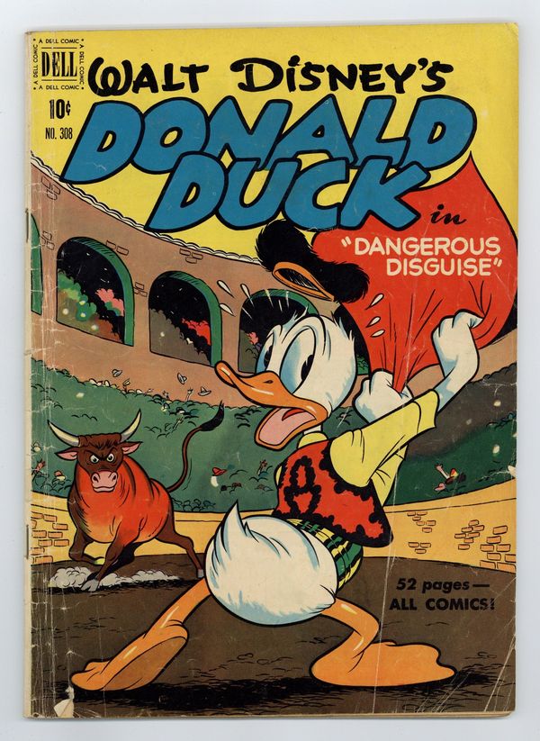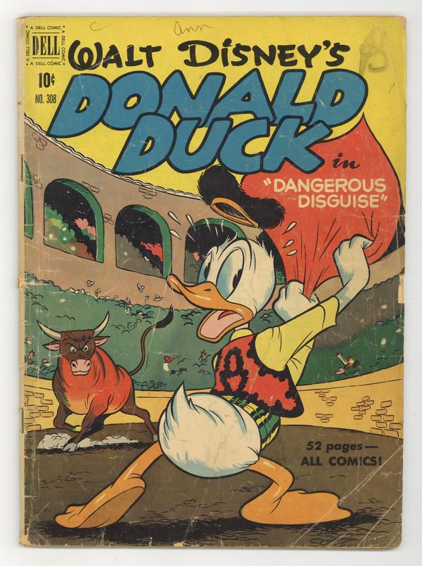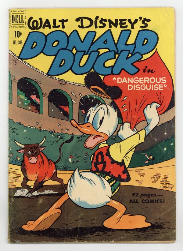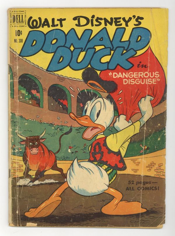 Cover art possibly by Carl Buettner. Dangerous Disguise, script and art by Carl Barks; The ducks intercept a message to Madame Triple-X, a beautiful spy, and try to beat her to Chiliburgeria, where she is to deliver the plans for a stolen American bomb to another secret agent; in Chiliburgeria, after a hectic train ride, Donald impersonates the other agent, a bullfighter named Donaldo el Quacko. The Little Stranger starring Donald Duck, art by Frank McSavage. 52 pages, full color. Cover price $0.10.