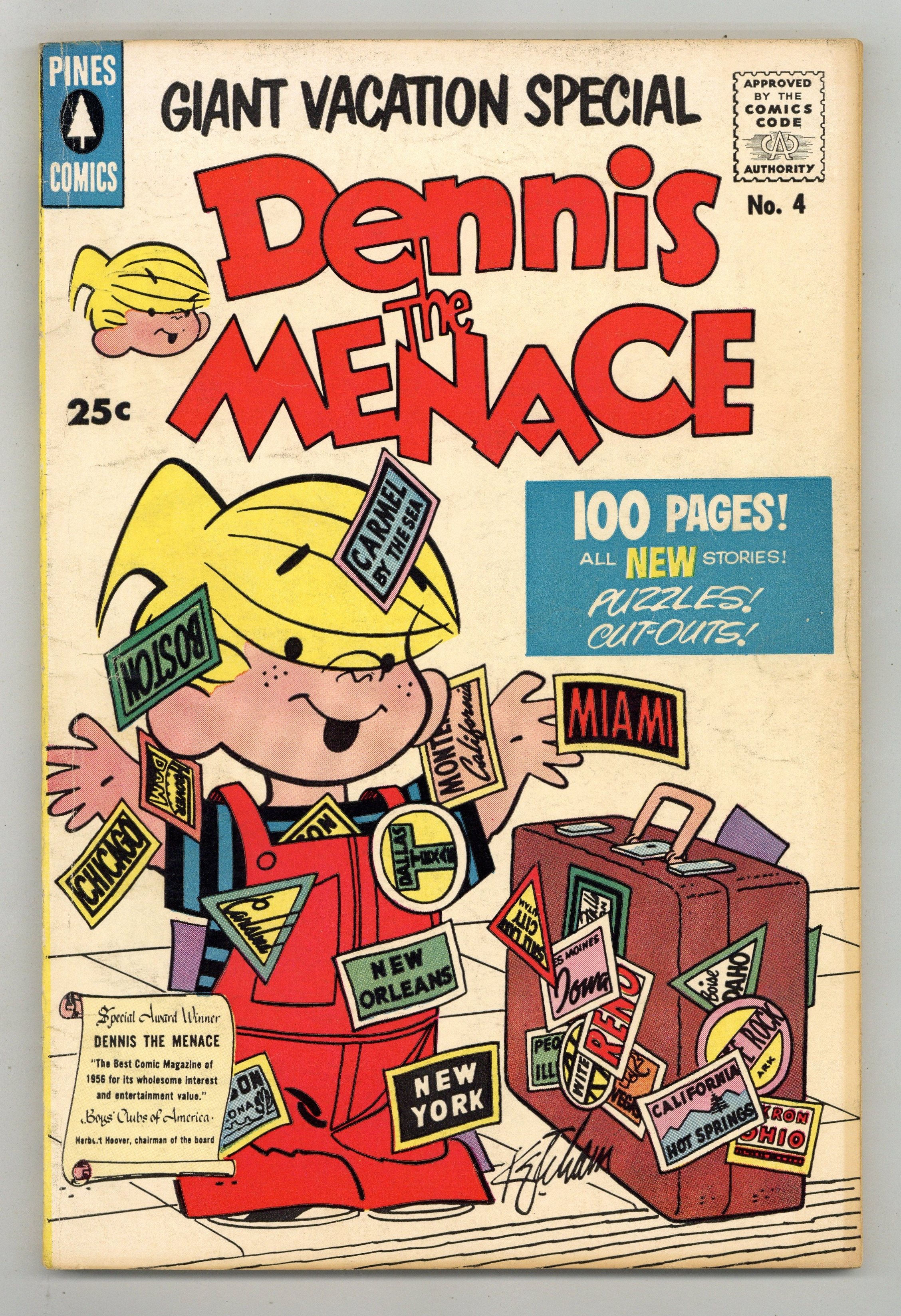 Cover by Hank Ketcham. Stories and art by Hank Ketcham, Fred Toole and Al Wiseman. A double-sized dose of Dennis the Menace, as he makes mischief in the neighborhood and all around the world. The Mitchells rent a travel trailer for a cross-country trip to California. But they didn't reckon with the idea of spending all day in the car with a rambunctious Dennis. Plus an article about the real-life "Dennis the Menace Playground" in Monterey, California, designed by Dennis the Menace cartoonist Hank Ketcham. Happy Holidaze; California Here We Come; Let's Make Dennis' Trailer and His Folks' Car!; Ruffled Feelings; Are You a Little Cut-Up?; Let's Get the Show on the Road!; Dennis and Harry Zona; Coloring Time!; It Happened in Monterey; Kid Stuff; The Real Dennis the Menace Playground; The Big Surprize! 96 pages, Full Color. Cover price $0.25.