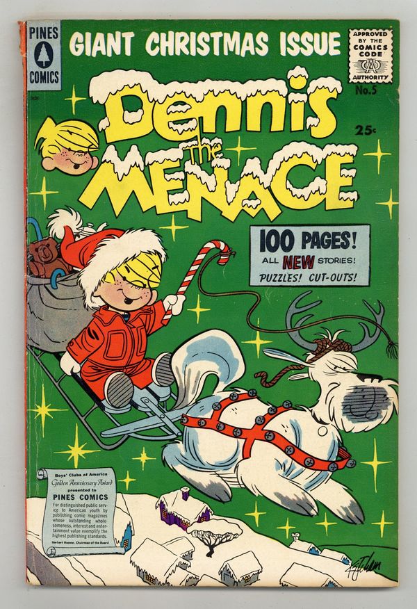 Cover by Al Wiseman (signed as Hank Ketcham). Stories and art by Hank Ketcham, Fred Toole and Al Wiseman. A double-sized dose of Dennis the Menace, as he makes mischief in the neighborhood and all around the world. Dennis decides to phone Santa with his Christmas list this year. Dennis tries to get his parents to wake him when Santa arrives. On Christmas morning, Dennis learns he hasn't been as good as he thought, because everyone is mad at him. I Want a Bike, an a Space Ship, an a Real Pony; Whiskery Trickery!; A Christmas Carol; Let's Decorate Your Windows!; Trees a Crowd; How ^Not to Decorate a Tree; Here's How Margaret's Tree Looks; Hi Mom! I'm Makin' My Own Christmas Cards!; Color Santa 'an Me!; Santa vs The Sandman; C'mon Kids... Let's Color!; Look What Ruff Got for Christmas!; It's Christmas!; Here's My House, Santa! 96 pages, Full Color. Cover price $0.25.