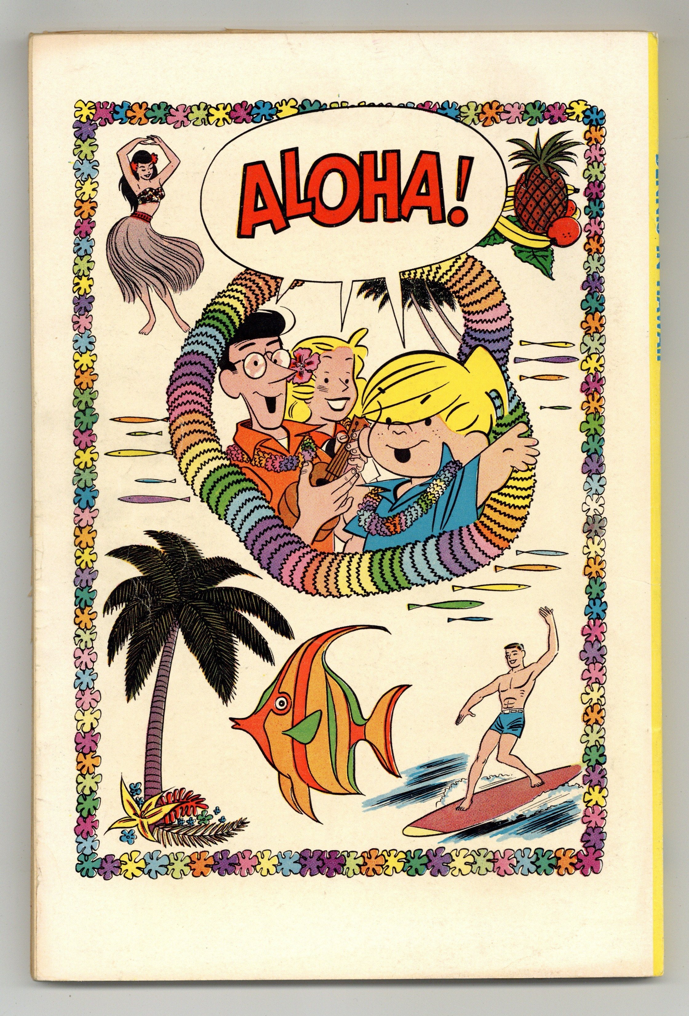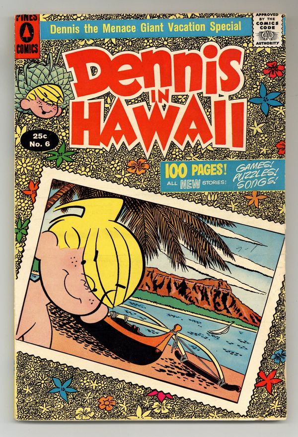Cover by Al Wiseman. Stories and art by Fred Toole and Al Wiseman. The first and second printings are indistinguishable. A double-sized dose of Dennis the Menace, as he makes mischief in the neighborhood and all around the world. Dennis and his family tour Hawaii, including Honolulu, Oahu, a catamaran ride, the Kilauea Volcano, the Naha Stone, and Rainbow Falls. The Mitchells visit Pearl Harbor, where history feels very present. Plus an article about the research that cartoonists Fred Toole and Al Wiseman did for this comic. Aloha!; Were Going to Honey-Lulu!; Dennis on Wahoo - Oops! Sorry! Dennis Means Oahu (O-Ah-Hoo); Holy Cats!; Whats Your Name in Hawaiian?; Pearl Harbor; The Garden Island; Now You Do the Hula!; Big Island by Dennis; Finally, a Maikai Luau…Kau Kau Nui…and the Hauoli Trip is Pau! 96 pages, Full Color. Cover price $0.25.