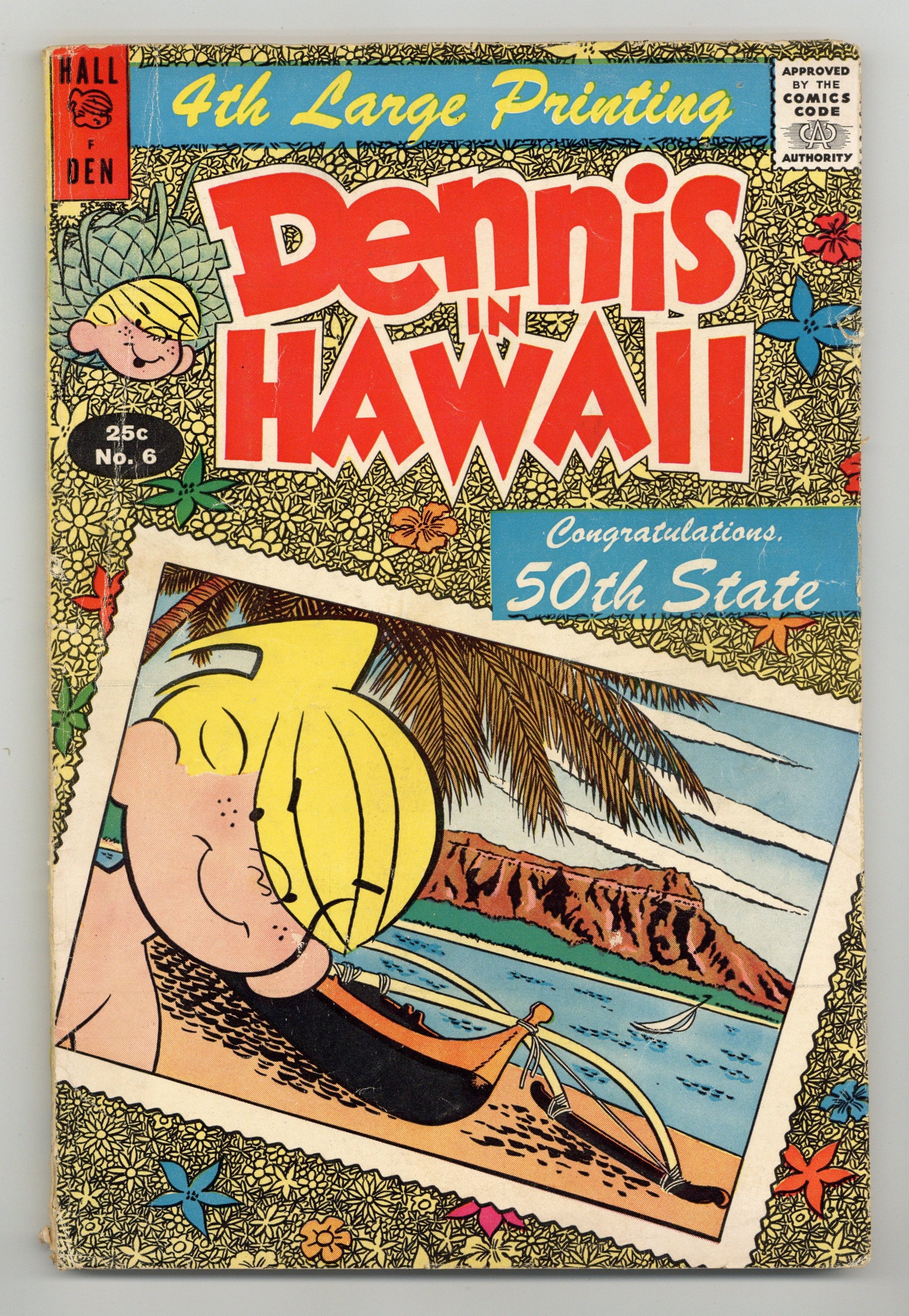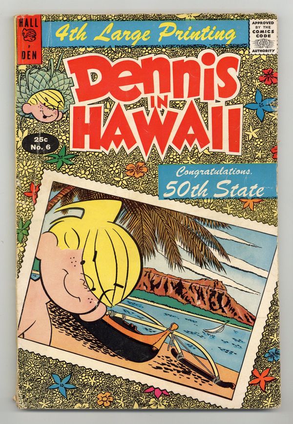 Cover by Al Wiseman. Stories and art by Fred Toole and Al Wiseman.- "4th Large Printing" on cover. A double-sized dose of Dennis the Menace, as he makes mischief in the neighborhood and all around the world. Dennis and his family tour Hawaii, including Honolulu, Oahu, a catamaran ride, the Kilauea Volcano, the Naha Stone, and Rainbow Falls. The Mitchells visit Pearl Harbor, where history feels very present. Plus an article about the research that cartoonists Fred Toole and Al Wiseman did for this comic. Aloha!; Were Going to Honey-Lulu!; Dennis on Wahoo - Oops! Sorry! Dennis Means Oahu (O-Ah-Hoo); Holy Cats!; Whats Your Name in Hawaiian?; Pearl Harbor; The Garden Island; Now You Do the Hula!; Big Island by Dennis; Finally, a Maikai Luau…Kau Kau Nui…and the Hauoli Trip is Pau! 96 pages, Full Color. Cover price $0.25.