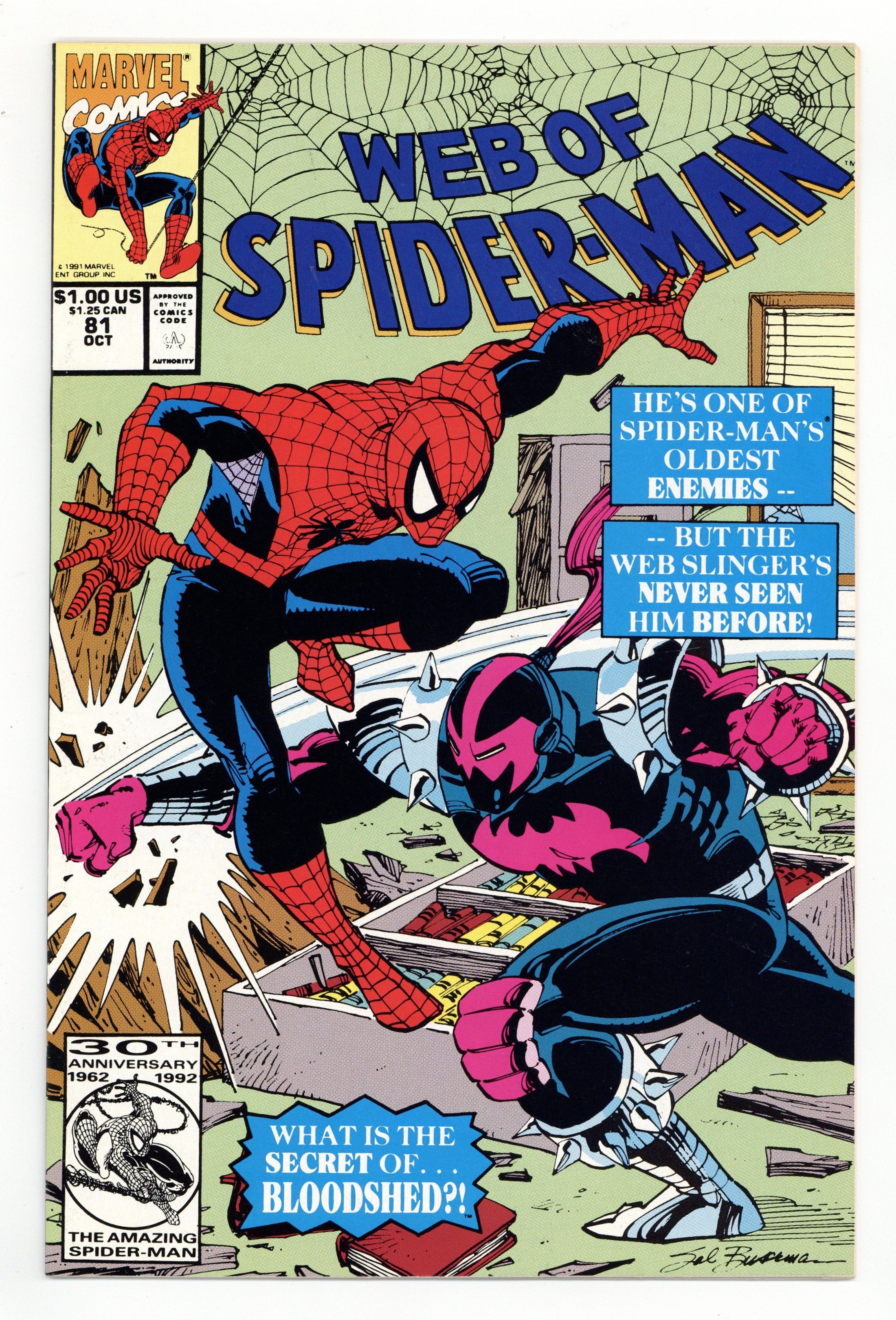 $2.501992 reprint available only through JC Penney. "Living in Fear" Story by Kurt Busiek. Art by Steve Butler, Don Hudson, and Chris Ivy. Cover by Sal Buscema. Spider-Man battles a new villain called Bloodshed who is attempting to blackmail his younger brother, Ricky, into stealing negotiable securities from Ricky's brokerage company. First appearance of Bloodshed. 32 pages. NOTE: Has low print run. Can be identified by 30th Anniversary Spider-Man in UPC BOX Cover price $1.00.