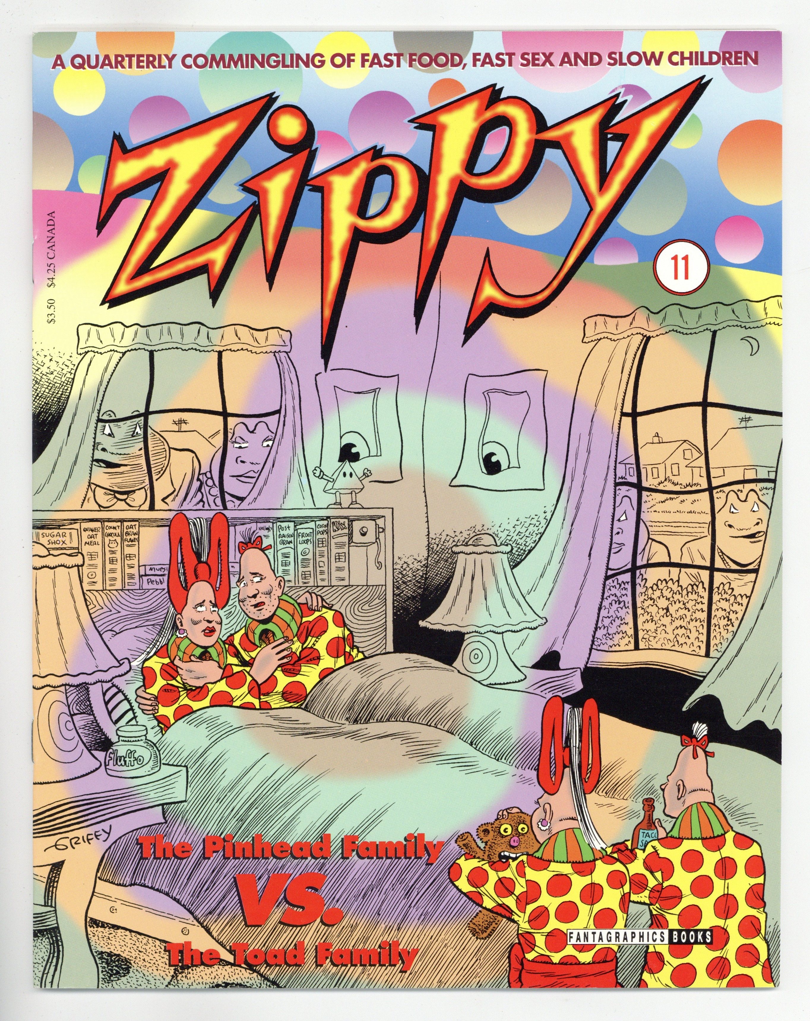 Published Sep 1995 by Fantagraphics.$12.00The Pinhead Family Vs. The Toad Family. Stories, art and cover by Bill Griffith. Reprints of the daily strip featuring Griffiths existentialist hero, Zippy the Pinhead, including a handful of Sunday strips in full color, plus a new Zippy story. Soap operas have never been weirder than the family intrigue that develops between the Pinheads and the Toads. 8 1/2 in. x 11 in. 32 pages, PC/PB&W. Cover price $3.50.