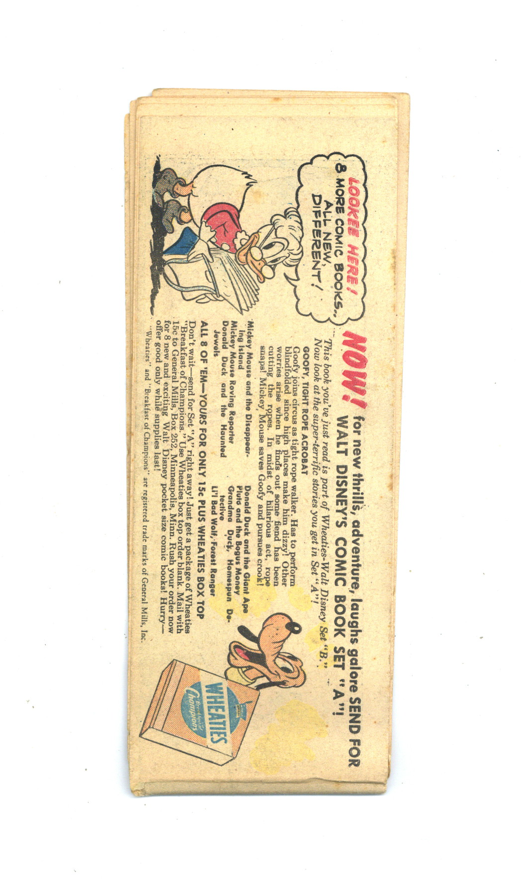 Tags: Wheaties Mini Comics (part B02), Disney Ducks & Mice$18.50Pluto Canine Cowpoke Mini Comic. Wheaties 1950-51 32-page promotional comic, 6-7/8 x 3-1/8, Issue #B-2. An original set of 8 mini comics cost 15c plus one Wheaties box top. Four sets of 8 were made, Series A, B, C and D.