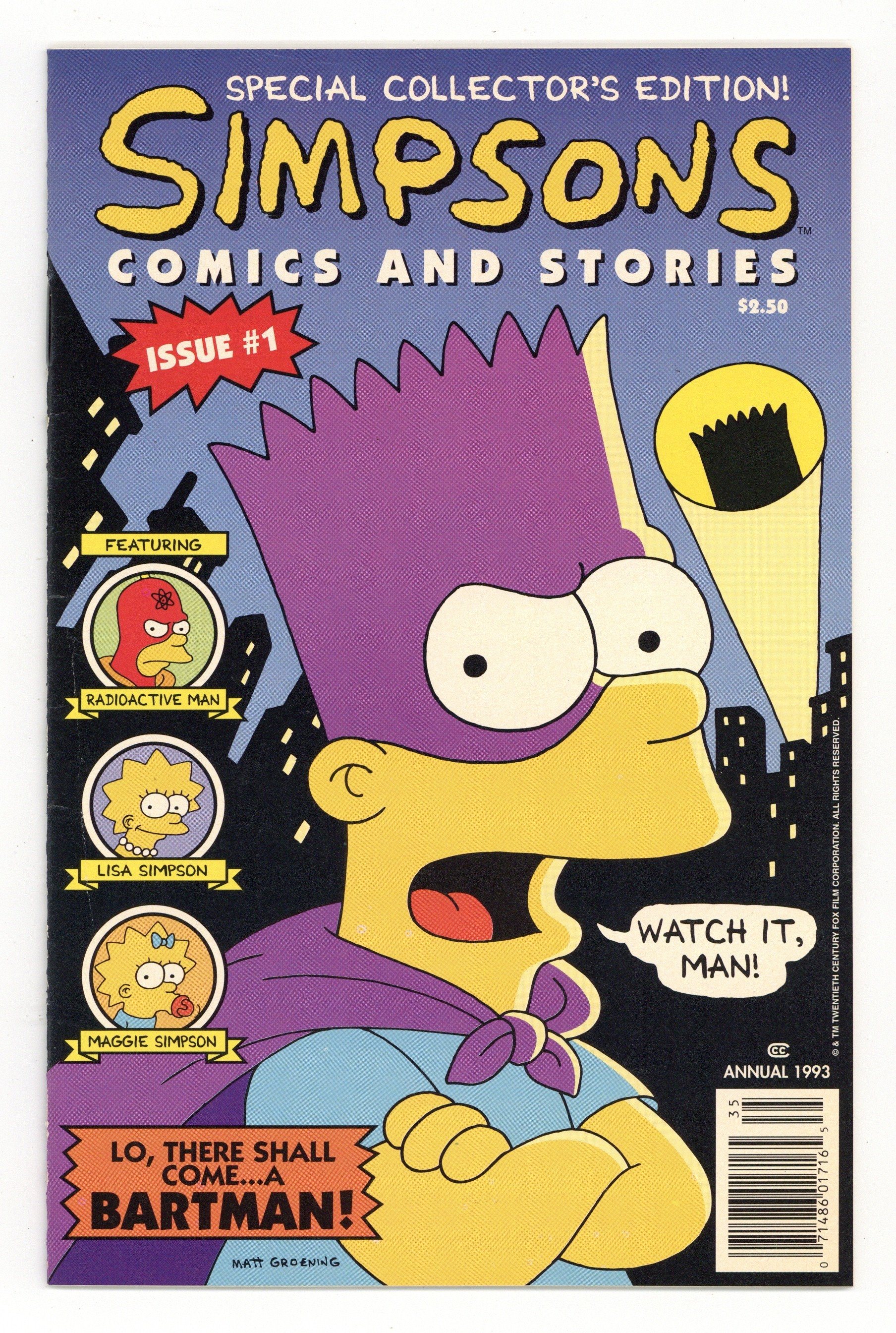Simpsons Comics and Stories Butterfinger Mini Comic Edition (1993) is a giveaway (despite the $2.50 cover price) variant of the full-size comic, with all the stories and ads that appear in the regular edition. The cool thing about this small-sized No. 1 is that it was found only in packages of Butterfinger candy bars. That's why it's so small. It may have come out BEFORE the actual No. 1 issue hit the stands, which would make this mini comic edition the first appearance of the Simpsons. As with the full-sized edition, stories include "Lo, There Shall Come a Bartman" (co-plot by Cindy Vance, script, layouts, and inks by Steve Vance, inks by Bill Morrison and Mike Anderson), "Bring Me the Head of El Barto" (script and art by Morrison), and "Maggie's Excellent Adventure" (co-story and layouts by Steve Vance, co-story by Cindy Vance, finished art by Ray Supreme). Cover price $2.50.