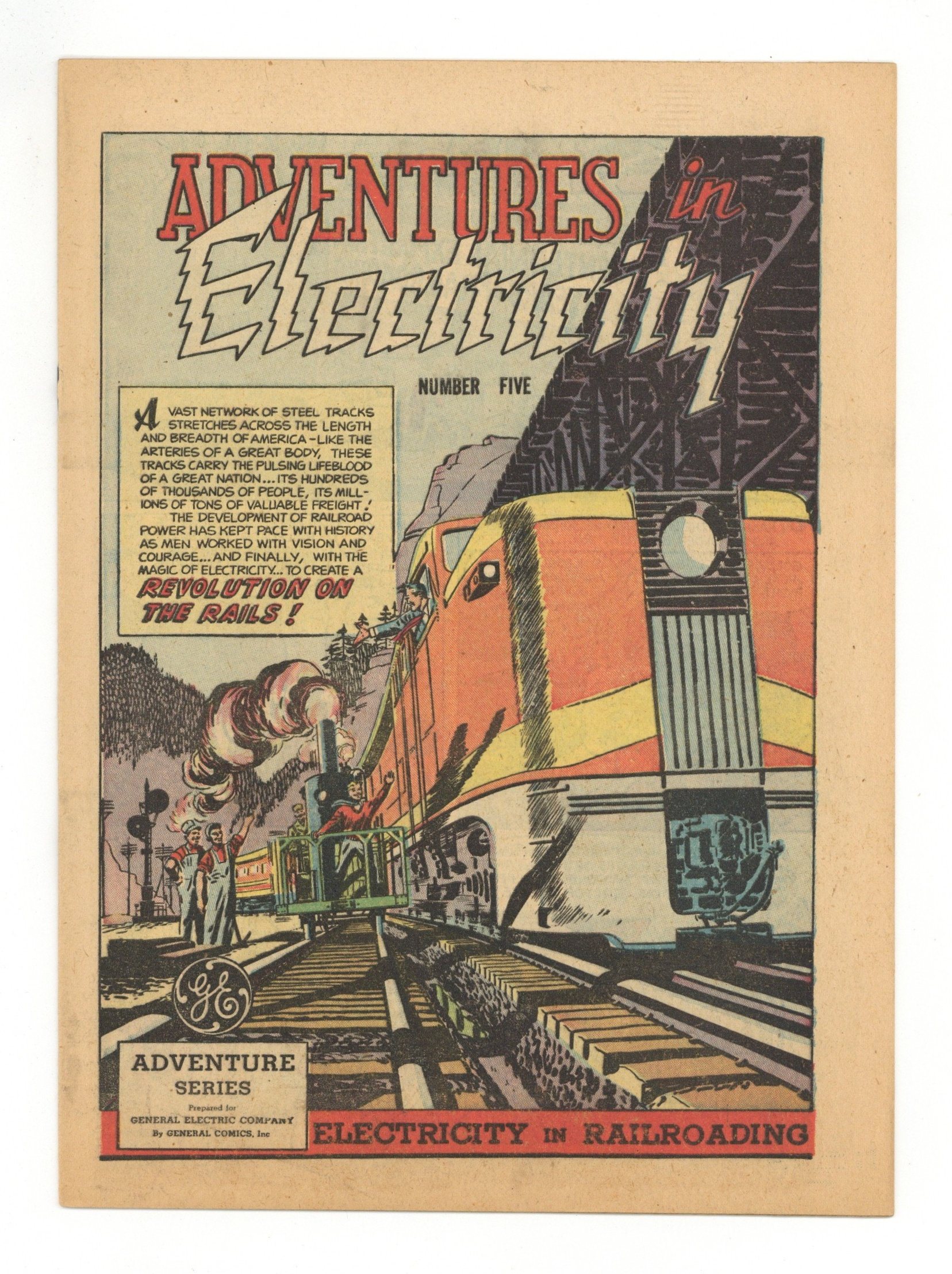 APG 17-4 Adventure Series. "Electricity in Railroading". Promotional comic published by General Comics for General Electric as part of their Adventure Series. Illustrated by George "Inky" Roussos, who is also known for his work on Batman. Conventional 7x10 comic size 16-page full color all newsprint comic with a 1948 copyright.