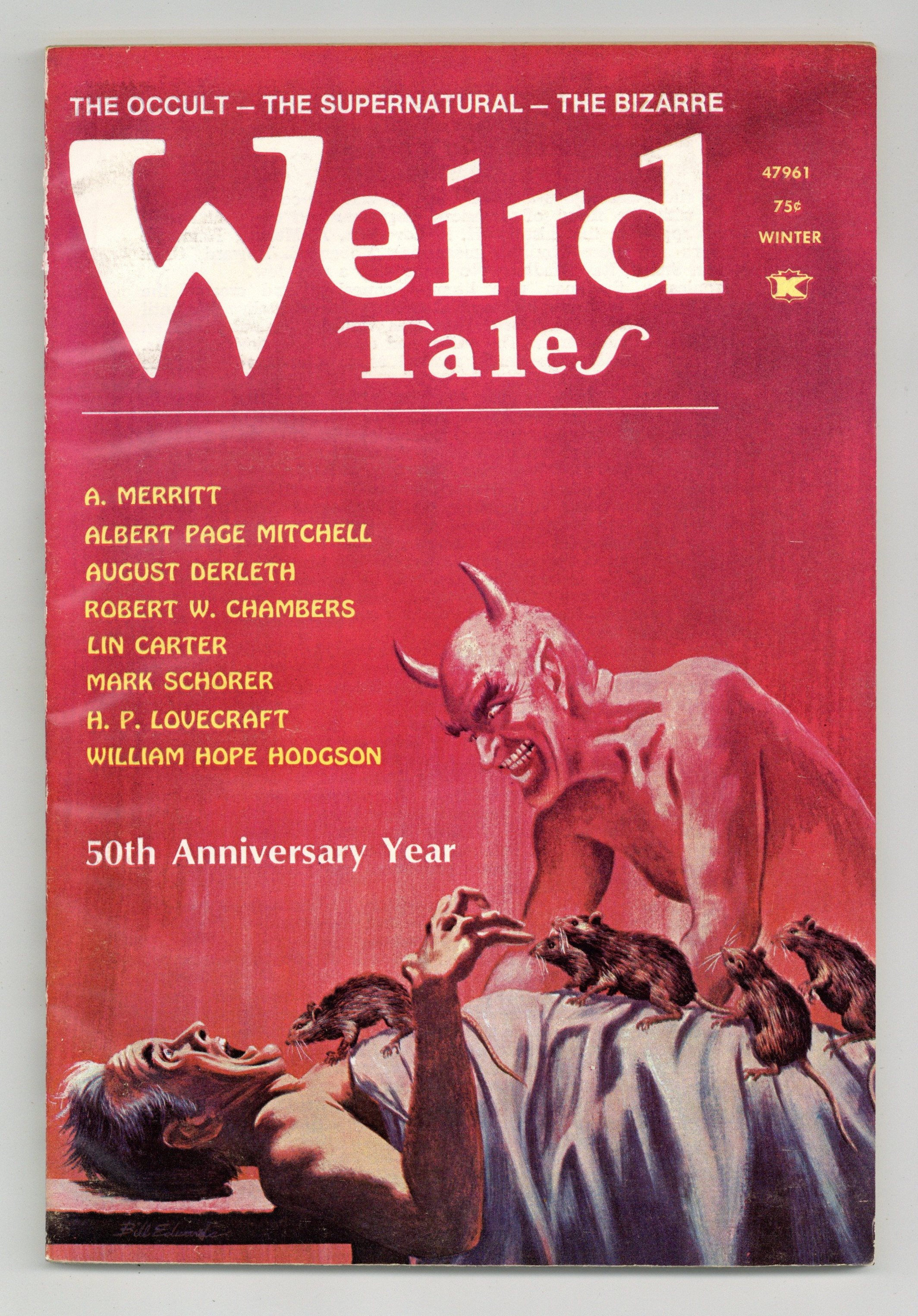 Published Dec 1973 by Weird Tales.$20.00Volume 47 - #3 - 1st printing. Winter 1973 - Featuring spine-tingling tales of terror by Robert E. Howard, H.P. Lovecraft, and others. Poem by Virgil Finlay Softcover, 6-in. x 9-in., 96 pages, Text (with B&W Chapter Illustrations by Don Rico). Cover price $0.75.