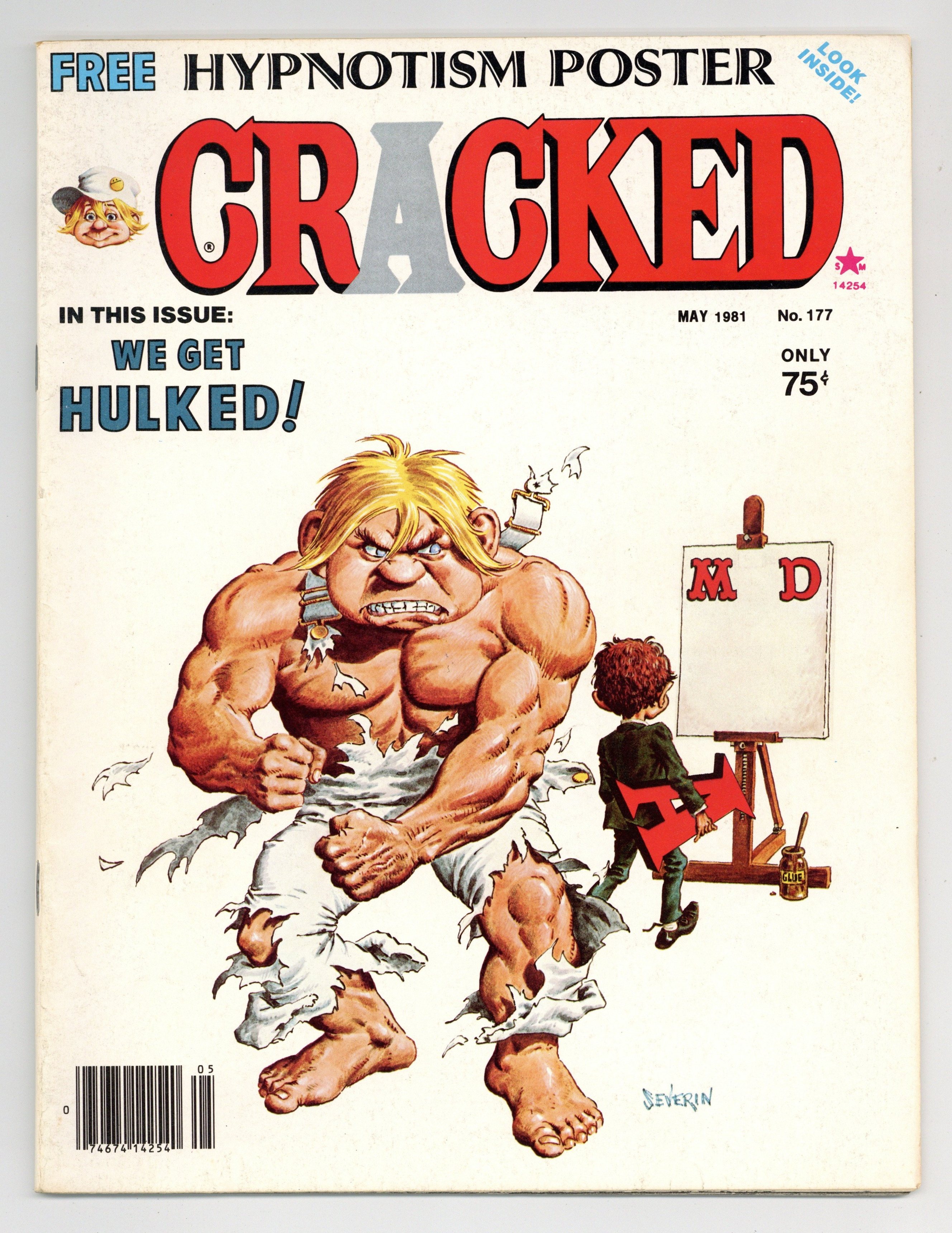 Published May 1981 by Major Magazines.$9.00Cover art by John Severin. Cracked Poster #177: Hypnotism Poster. The Incredible Hunk, art by John Severin [as Sigbjorn]; A satire of the television show The Incredible Hulk. The Leonard Limestone Studio presents "Memorable Moments from Presidential History" Figurine Collection. Absolutely, Unquestionably, Positively, Undeniably, the Very, Very, Last of the Cracked Lens Part II photos with captions. Never Rent the Apartment If... How to Interpret All Those Professional School Ads, art by Samuel Whitehead. If Professional Sports Were Played the Same Way as When We Were Kids. How to Get a Job, art by Bill Ward. How to Meet the Opposite Sex, art by John Langton. Those Little Things That Do Go Right, art by Warren Sattler. My Buddyguard, art by John Severin; a satire of the movie My Bodyguard. 52 pgs. $0.75. Cover price $0.75.
