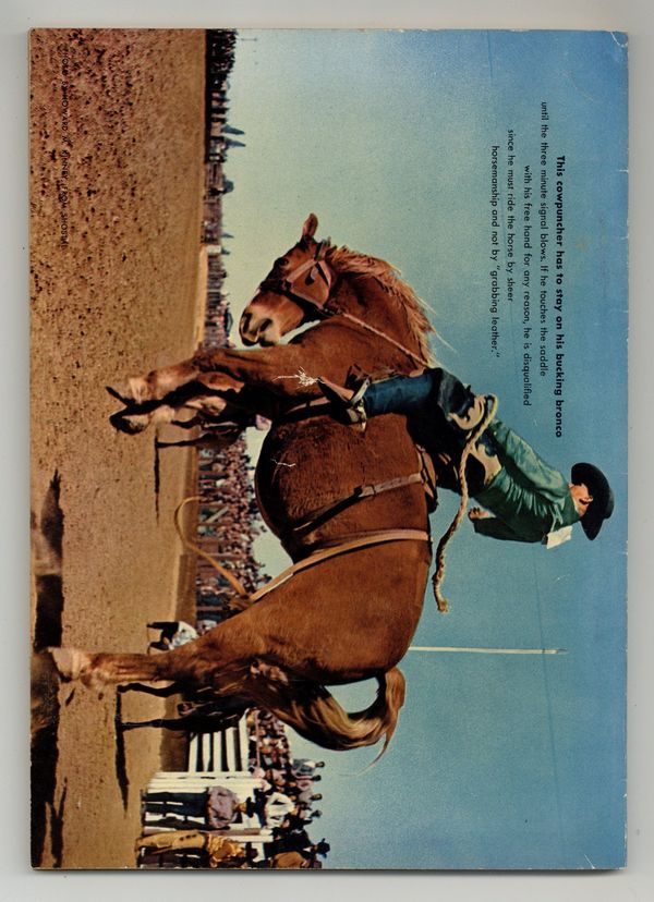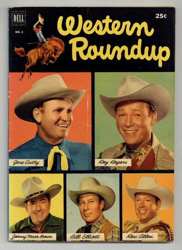 Tags: Dell Giant$50.00American Edition 25ยข cover price. Photo cover with Gene Autry, Roy Rogers, Johnny Mack Brown, Bill Elliott, and Rex Allen. Gene astride a sitting Champion photo. Gunfighter's Retreat starring Roy Rogers, art by Peter Alvarado; Roy encounters a "retirement" home for old gunfighters. Dictionary of Western Terms. The Mustangers starring Trigger, art by Till Goodan. Short article about various breeds of horses. Nickel Plated Pay-Off starring Gene Autry, art by John Ushler. Words and music to the song Red River Valley. Killer Trouble starring Champion, art by Nicholas Firfires. Articles on rodeo. The Phantom Stage starring Johnny Mack Brown. The Pay-Off Bandit starring Wild Bill Elliott. Double Deception starring Rex Allen, art by Peter Alvarado. 100 Pages, Full Color. Cover price $0.25.