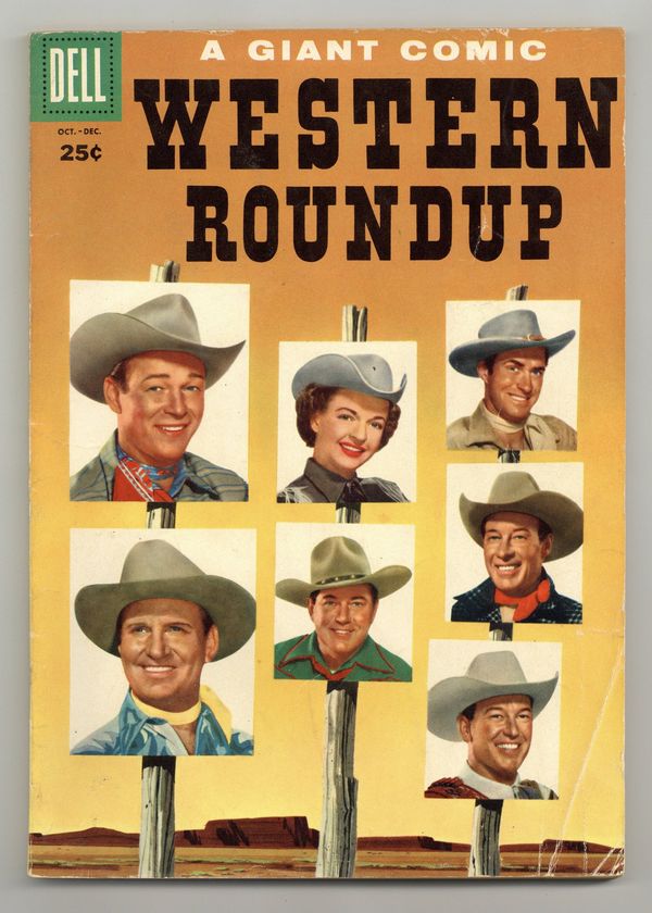 Tags: Dell Giant$18.00Photo cover with Gene Autry, Roy Rogers, Johnny Mack Brown, Bill Elliott, Dale Evans, and Rex Allen. Roy Rogers and Bullet photo. The Killer Gang starring Gene Autry, art by Nicholas Firfires; Gene foils a gang when they attempt to rescue a convicted bank robber; When the convicted robber is found dead in his jail cell, Gene has to track down the killers. The Boom-Town Mystery starring Roy Rogers. Trigger and Bullet Meet Crooked Horse, pencils by Sparky Moore. Guilt Rides the Trail starring Flying A's Range Rider, pencils by Nat Edson. Johnny on the Spot starring Johnny Mack Brown. Luke Sherman's Fortune text story, art by Tom Cooke. Troubled Waters starring Wild Bill Elliott, pencils by Tom Cooke. The Fugitive starring Dale Evans, art by Russ Manning. Gene Autry and Champion photo. 100 Pages, Full Color. Cover price $0.25.
