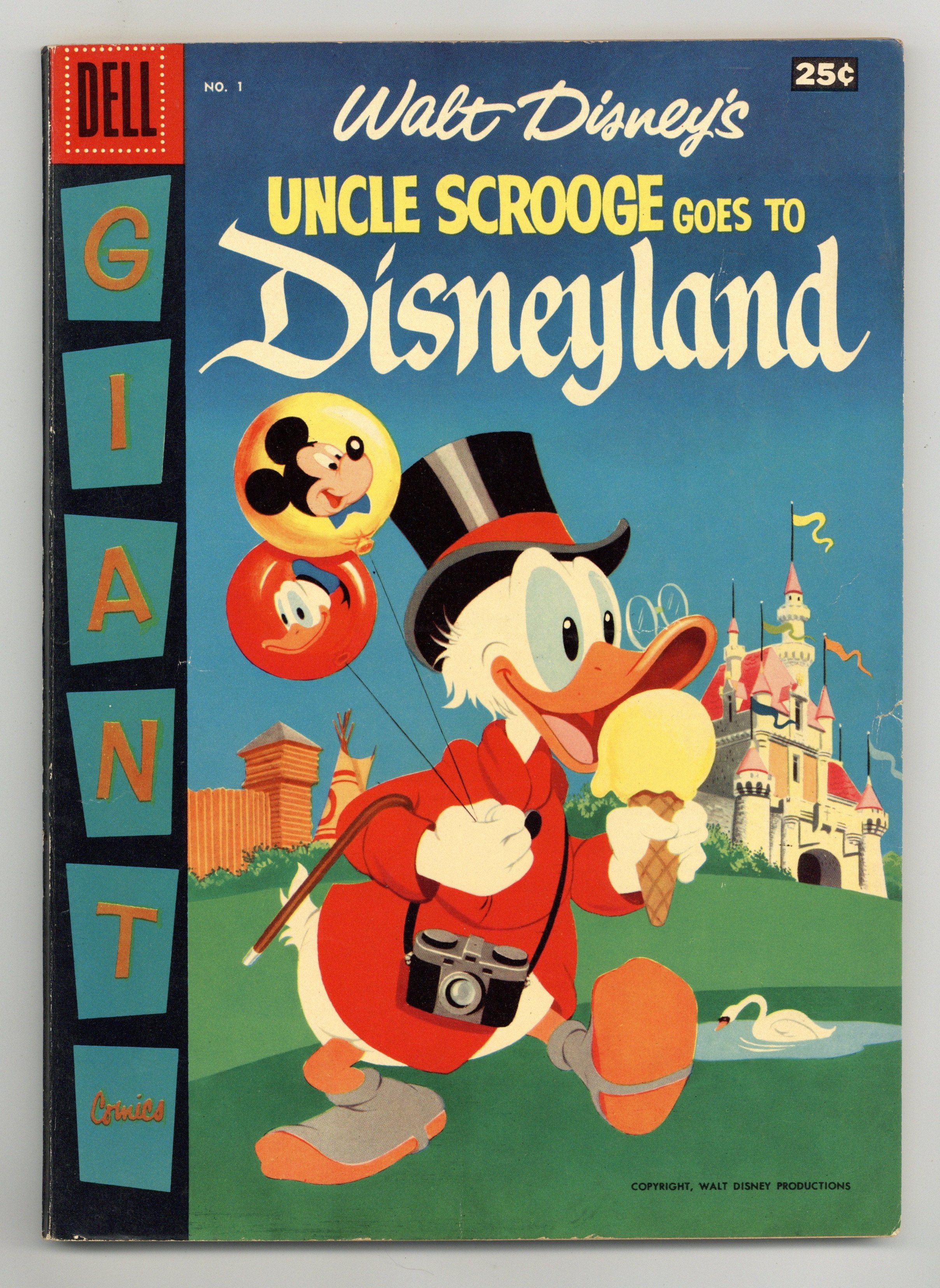 $45.00Cover by Tony Strobl. Stories by Carl Barks, Carl Fallberg and unknown. Art by Tony Strobl, Carl Barks, Paul Murry and John Liggera. In this issue: "Uncle Scrooge Goes to Disneyland" framing story with art by Tony Strobl and John Liggera. Plus: In an untitled story by Carl Barks, Uncle Scrooge tells a tale of his days of being the captain of a riverboat; Morty, Ferdie, Pluto and Pinocchio are in Storybook Land in an untitled tale with art by Paul Murry; Alice (from Alice in Wonderland) and Daisy Duck are in Fantasy-land an untitled story with art by Paul Murry; Donald Duck, Huey, Dewey and Louie are in Tomorrowland in an untitled story by Carl Fallberg, Tony Strobl and John Liggera; and Mickey Mouse and Goofy are in Adventureland in an untitled story with art by Tony Strobl and John Liggera. 100 pages, full color. Cover price $0.25.