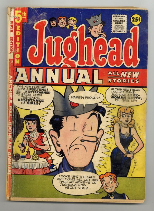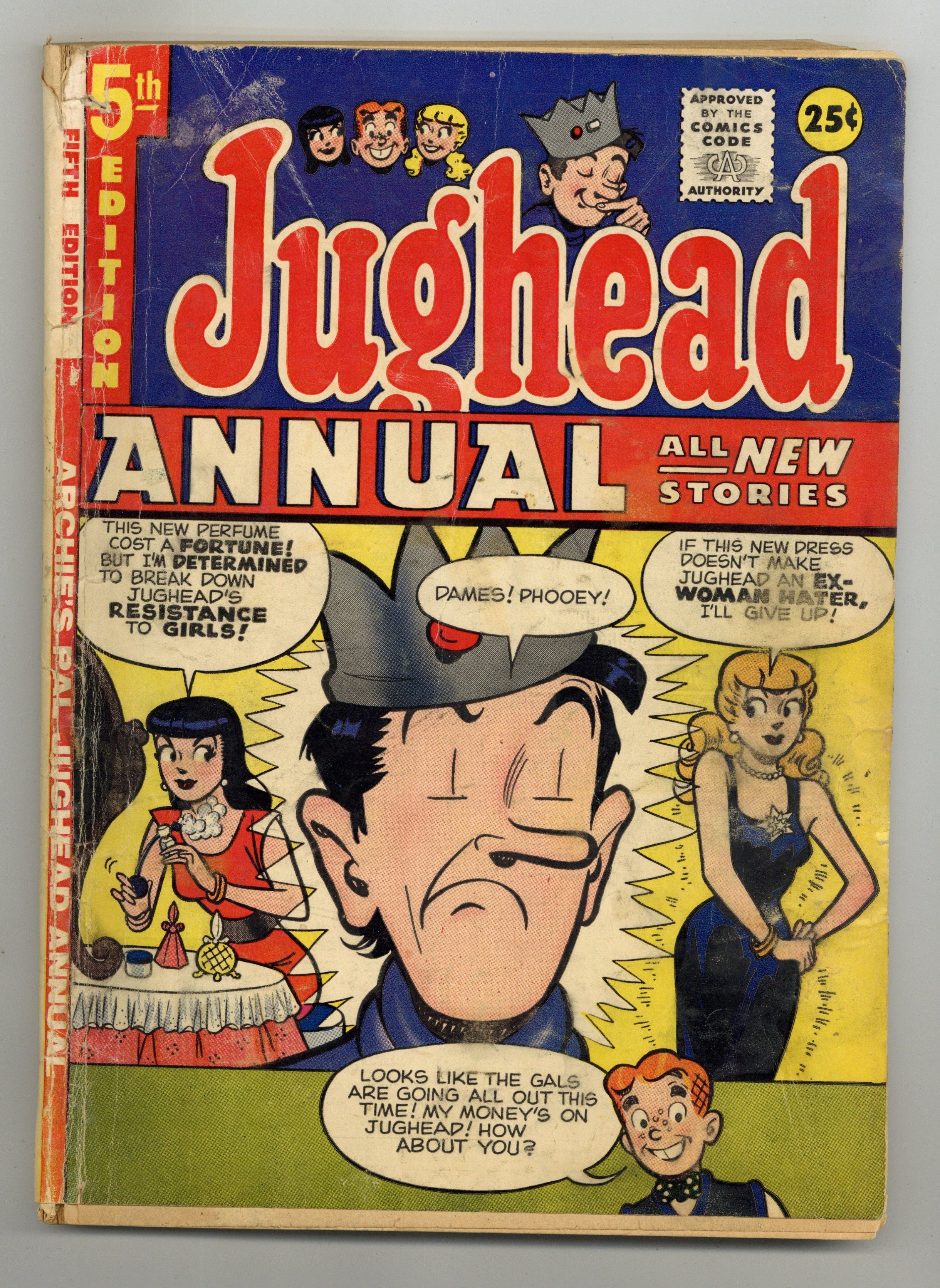 "Tele-Phonies!"; Archie and Reggie have been making prank phone calls to Jughead, but he gets even. "Hear No Evil," pencils by Samm Schwartz, inks by Terry Szenics; Midge tells Moose he must host a party for the gang; Jughead, Archie and Reggie take turns insulting Moose, who is too busy to understand what they are saying. "Voice of Doom," pencils by Samm Schwartz; Jughead uses ventriloquism to play jokes on Archie and Reggie. "Puddle Jumper!"; Reggie gallantly uses the coat he is wearing to cover a puddle, but it's a coat he borrowed from Archie. "Charm Chump!", script by George Gladir, pencils by Bill Vigoda, inks by Terry Szenics; Jughead is selling lucky horse shoes. "Paid in Fool!", art by Bill Vigoda; Jughead owes Reggie two dollars and offers to do his schoolwork for him to pay back the debt. "Grass Dismissed"; Jughead thinks he has invented a concentrated vitamin plant food. "Fowl Play"; Archie is in charge of the school play production of The Egg and I. "Just a Little Love Nest"; Jughead got Moose into bird-watching and now he doesn't notice when Midge is near other guys. "Short Shrift"; Jughead is wearing Bermuda shorts. "The Passing of the Buck"; Mr. Weatherbee asks Archie to clean out the storeroom. "Cap the Climax"; Archie doesn't want to be seen in the cap and bush jacket that Veronica gave him so he gives them to Jughead who then becomes attractive to all the girls. "Trance Form"; Reggie and Archie try to convince Jughead that he can actually hypnotize people, but lose a bet to Jughead when he turns the tables. "Labor of Love"; Reggie tries to find out what kind of job Jughead has. 100 pgs., full color. Cover price $0.25.