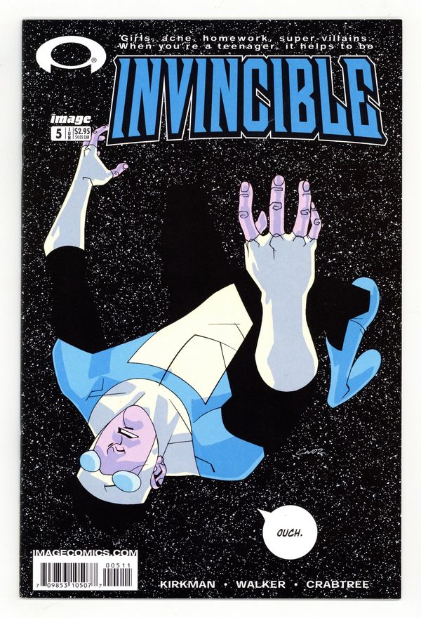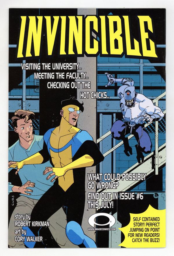(W) Robert Kirkman (A) Cory Walker (Cover) Cory Walker & Bill Crabtree. FC 32pp $2.95 Ongoing monthly series In stores the week of June 4th The Concept: Mark Grayson is just like most everyone else his age. He's a senior at a normal American high School. He has a crappy part time job after school and on weekends. He likes girls quite a bit... but doesn't quite understand them. He enjoys hanging out with his friends, and sleeping late on Saturdays... at least until the good cartoons come on. The only difference between Mark and everyone else is that his father is the most powerful superhero on the planet, and as of late, he seems to be inheriting his father's powers. Which sounds okay at first, but how do you follow in your father's footsteps when you know you will never live up to his standards? This Issue: IT CAME FROM OUTERSPACE... and it was ready to fight! Mark is sent out into space by his father to deal with an all too familiar villain. It seems his father is too busy saving the world with The Guardians of the Globe and he needs Mark to fill in for him. Mark's lazy Sunday afternoon is ruined when he's forced to face his most formidable foe so far! Lucky for him, though, his mother is cooking pork chops tonight... his favorite. Cover price $2.95.