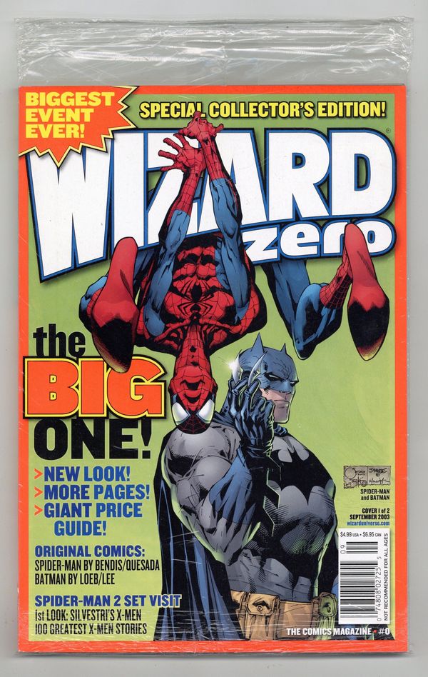 $26.00Cover 1 of 2: Batman and Spider-Man. From DC Comics, writer Jeph Loeb and artist Jim Lee create an all-new 6-page BATMAN story that takes place between issues #615 & #616! From Marvel Comics, writer Brian Michael Bendis joins Editor-In Chief Joe Quesada who returns to pencil an exclusive 6-page Ultimate Spider-Man tale! Joe's first new story since Marvel Knights Double Shot in May 2002. Jay Anacleto illo from Marvels: Eye of the Camera; Roberto Aguirre-Sacasa discusses Fantastic Four; Wizard lists 10 coolest super-hero-themed rides in the U.S.; Jim Lee and Brian Azzarello comment on Superman; Marc Silvestri comments on New X-Men; Q & A with Alan Moore. Spider-Man 2 set visit, with comments from Sam Raimi and Avi Arad; Q & A with Kevin Smith; George Perez reveals his JLA/Avengers diary; Neal Adams interview, with illo by Adams; report on the single greatest stories that define the icons of DC, with Gabriele Dell'Otto illo; report on the best artists in comics; report on the top X-Men comics; Q & A with Thomas Jane on Punisher film; Basic Training by Michael Turner; Book of the Month: Catwoman; Q & A with Neil Gaiman; Secret Stash: The Silencers; 11 things you didn't know about Alex Ross Cover price $4.99.