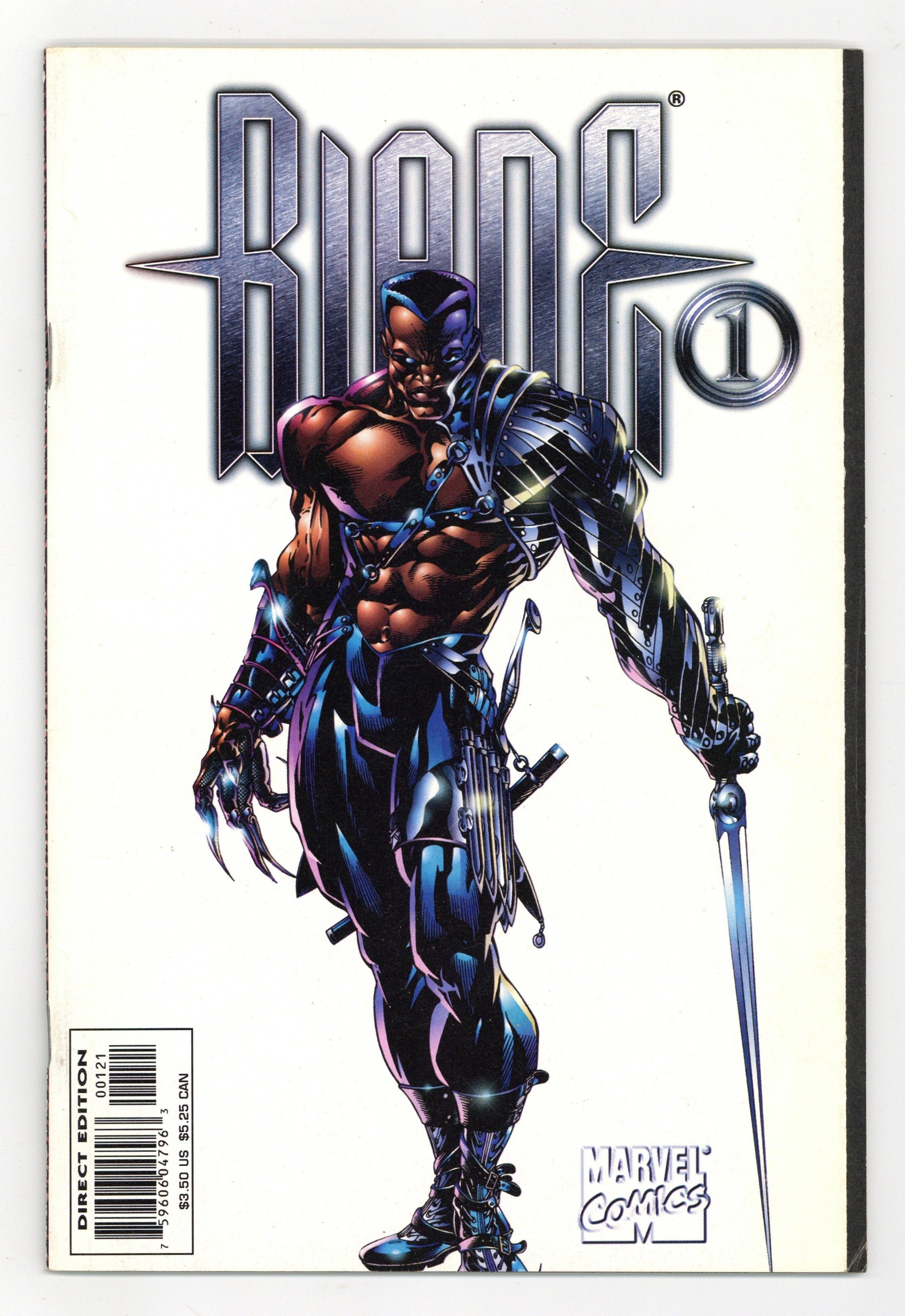 Cover by Bart Sears. THE SCOOP: The vampire hunter leaps from the silver screen to his own hard-hitting, hyper- kinetic ongoing series! * THE STORY: There is a dark movement creeping through the night--a gathering of the bloodsucking kind! And this vampiric convention heralds the coming of the most terrifying demonic entity ever-- the dreaded Daywalker! Only one man possesses the means to halt this unholy entrance, and that man is Blade, the half-vampire/half-human warrior! But what if the slayer himself is slain? And who are the mysterious agents of Silvereye that are watching all? It's X-Files meets The Lost Boys! It's the supernatural meets super heroics! It's cool new characters like the Reaper, Saracen the monk and Hrolf the hunter! It's demons, vampires, the undead and the barely living! It's a high adrenaline adventure that'll make the movie look like Polaroids! It's Blade like you've never seen him--but always wanted to! This isn't goofy goggles and splintering stakes--it's hi-tech horror in the Mighty Marvel Manner! * THE CREATORS: Bart Sears (SPIDER-WOMAN) was so intrigued by the slayer that he leaped at the chance to both write and draw the title! Just wait until you see the new characters he's cooked up! * THE FORMAT: This 48-page issue kicks off the monthly series. * THE SUPPORT: Look for ads, articles, online coverage and P.O.P. items. And don't forget the continuing mass market awareness of the character: Blade has been rented more than 20 million times since its video release in December of 1998, while sales of the Blade DVD have remained in the top 20 since December 1998, making it the 3rd best selling DVD of all time! * MARVEL MEMO: Dynamic Forces will offer a signed version of BLADE: VAMPIRE HUNTER #1. Please refer to the DF section for full details on this exciting collectors' item." Cover price $3.50.