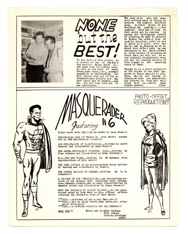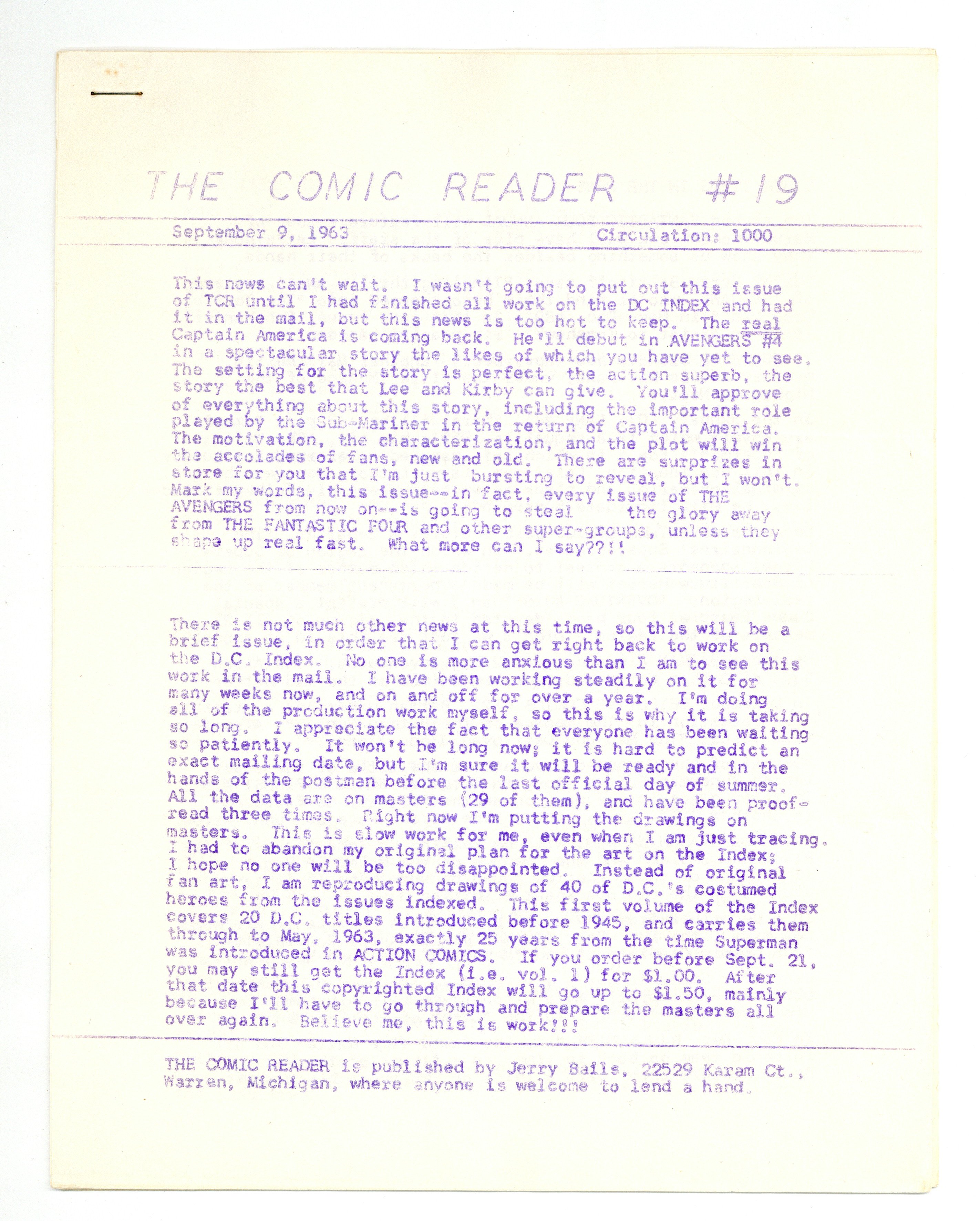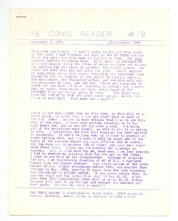 Issue #19 - Sept. 9, 1963. Free fanzine published and edited by Jerry Bails. Current comic news and opinions by Jerry Bails. He is ecstatic about Captain America's return in Avengers #4, for instance. News about the Alley Awards. Ads from Bails and others. Includes a full-page ad for Star-Studded Comics #2 from Larry Herndon, Howard Keltner and our own Buddy Saunders. Upon seeing the ad, Buddy says he did not lay the ad out or do the artwork and believes it was Howard Keltner. Single-page photo-offset ad for Mike Vosburg's Masquerader #6. 8 1/2-in. x 11-in., loose pages bound with staples, B&W, 12 pages. Circulation 1,000.