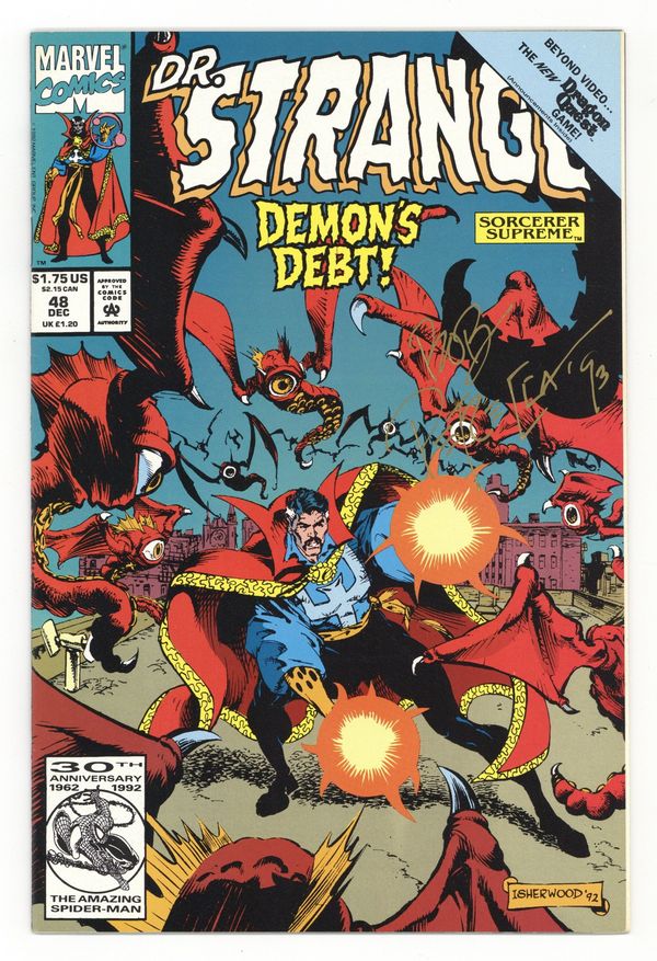 Cover art by Geof Isherwood. To Serve in Heaven, script by Len Kaminski, pencils by Geof Isherwood, inks by Bob Petrecca, Barnett, and Don Hudson; Clea deposes Umar and Baron Mordo, only to unleash Dormammu; Meanwhile Doc has to call upon the Vishanti to save him from destruction, and they demand he accompany them for a 5000 year war. 36 pgs. $1.75. Cover price $1.75.