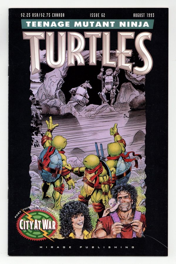 Published Aug 1993 by Mirage Studios.$105.00City At War, Part 13. In the aftermath of the battle with the Elite, the Turtles reunite with April and Casey. Story by Kevin Eastman, Peter Laird and Jim Lawson; art by Lawson. Final issue of Volume 1; Volume 2 debuted two months later in October 1993. Black and white; 32 pages. Cover by A.C. Farley. Cover price $2.25. Cover price $2.25.