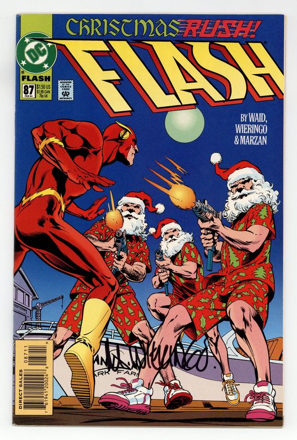 A heatwave and crimewave in Keystone at Christmas time means a very cranky Flash in "Christmas Rush". Script by Mark Waid, pencils by Mike Wieringo, inks by Jose Marzan, Jr. Letters column includes fan letter from comics columnist Augie De Blieck, Jr. Alan Davis/Mark Farmer cover. Cover price $1.50.