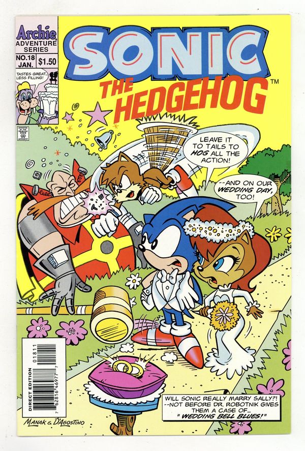 Direct Edition. Cover pencils by Dave Manak, inks by Jon D'Agostino. Wedding Bell Blues, script by Mike Kanterovich and Ken Penders, pencils by Dave Manak, inks by Harvey Mercadoocasio [as Harvey M.]; Dr. Robotnik launches an all-out attack on what looks like the wedding day of Sonic and Princess Sally. In The Still Of The Night, script by Mike Kanterovich and Ken Penders, pencils by Art Mawhinney, inks by Jon D'Agostino; Princess Sally is summoned to the deathbed of her governess, Julayla, in order to pass one final test. 36 pgs. $1.50. Cover price $1.50.