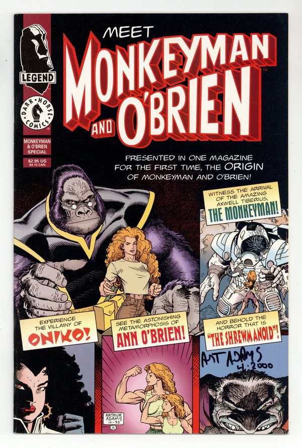 Story and art by Arthur Adams. She's the beautiful daughter of a brilliant scientist. He's a super-intelligent gorilla from another dimension. Together they're Monkeyman & O'Brien -- two rays of hope in a world gone mad! Join Art Adams for 32 pages of non-stop, eye-popping action in this science-fiction adventure which originally appeared in Mike Mignola's Hellboy: Seed of Destruction. 32 pages, FC. Cover price $2.50.