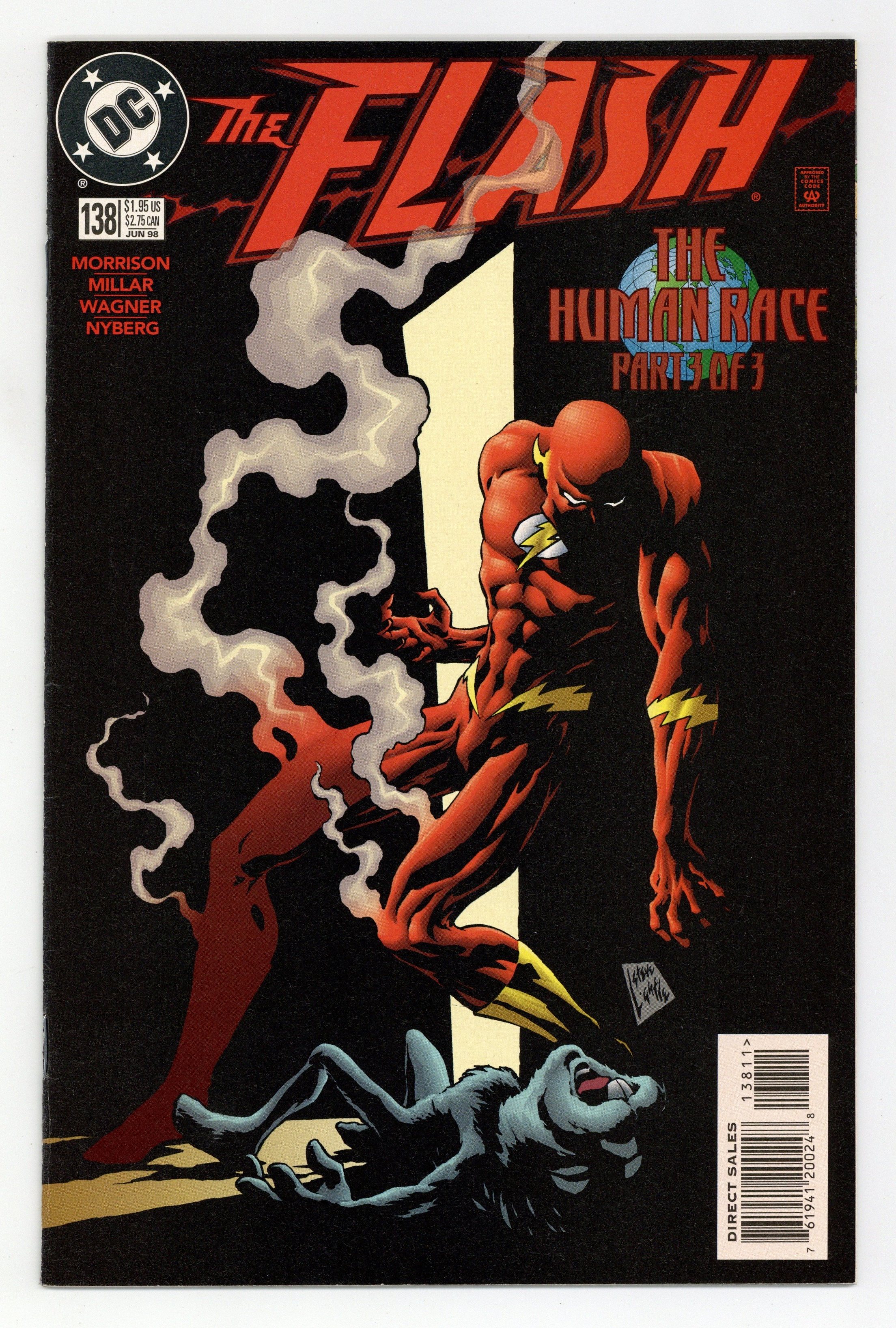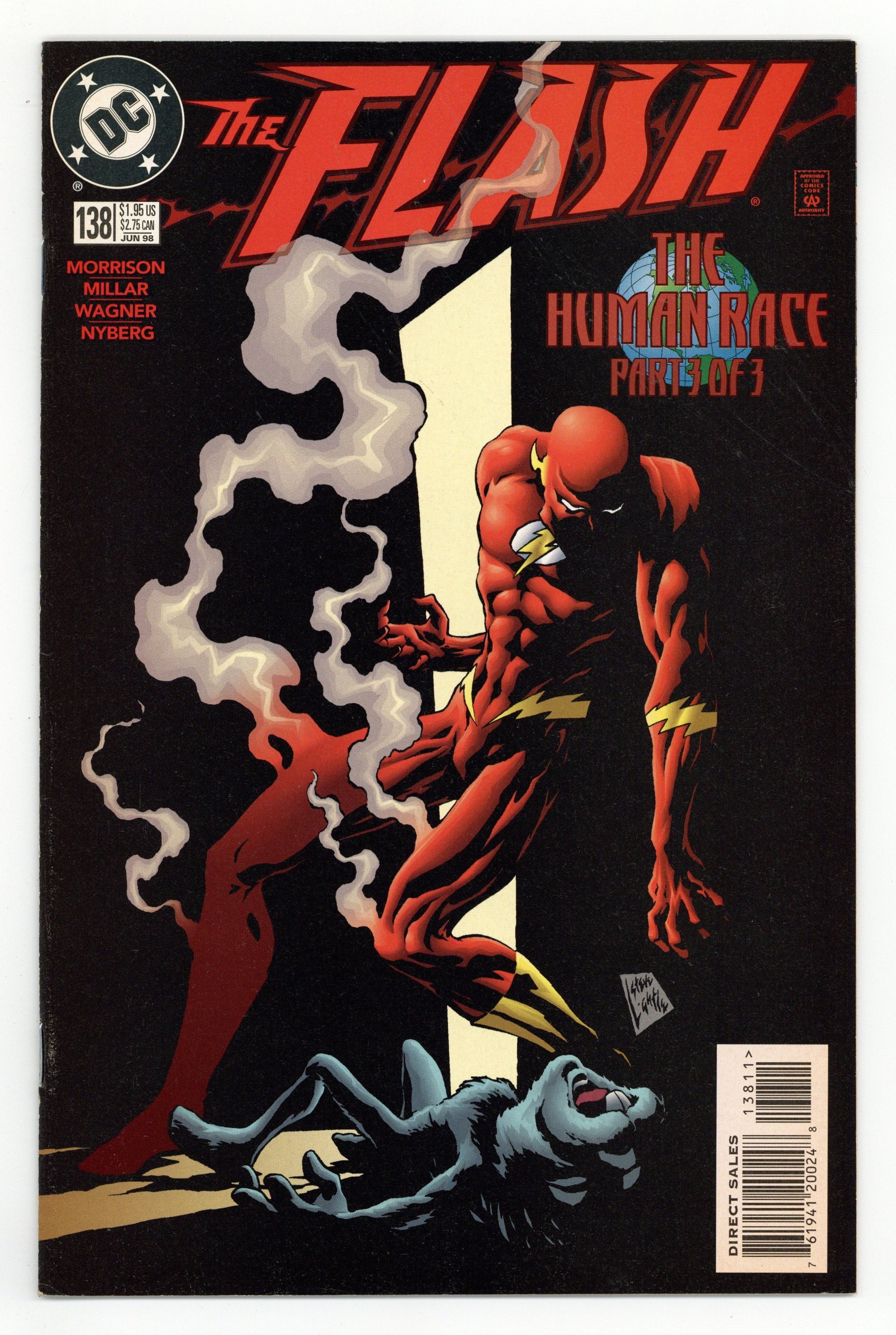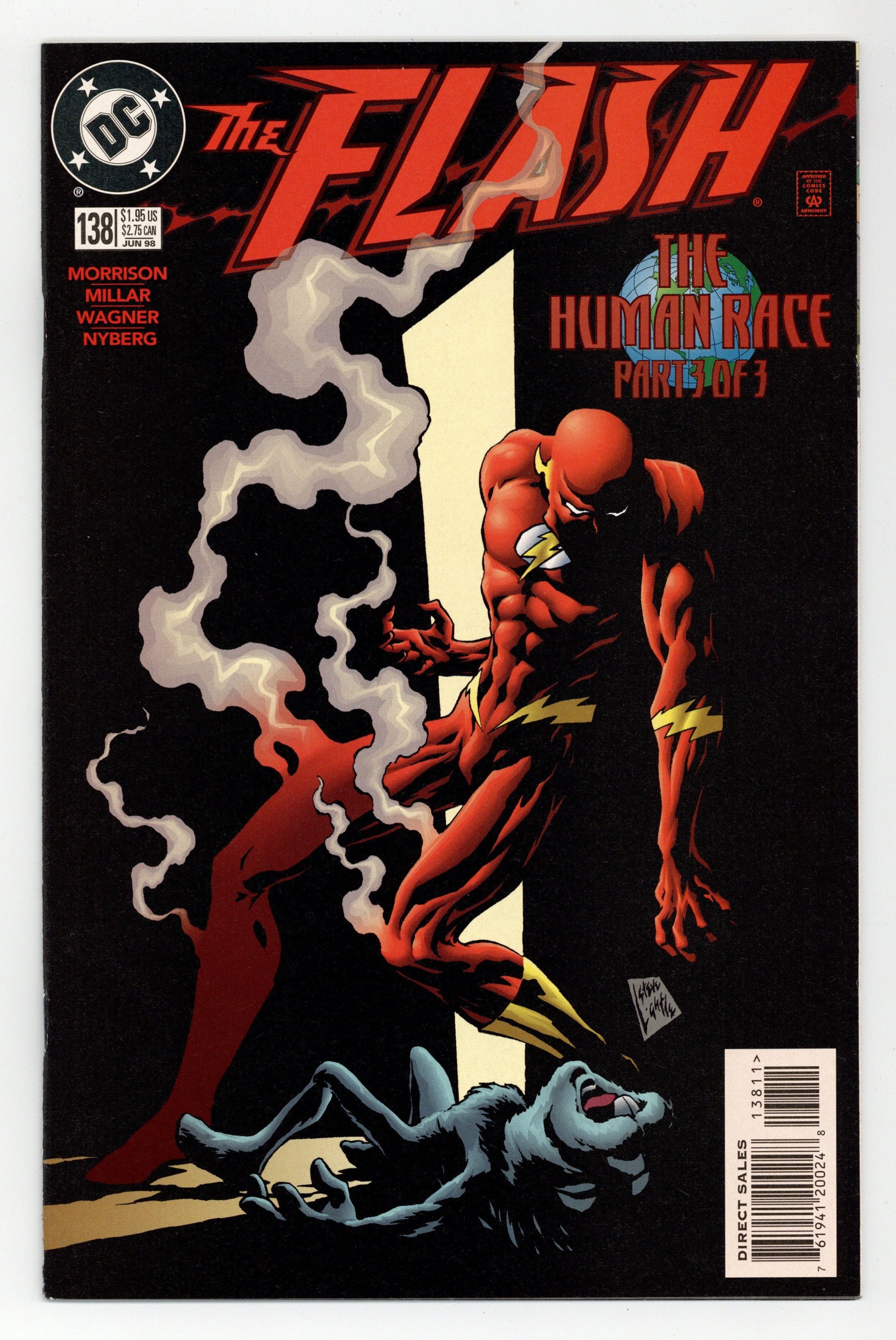 Tags: Flash$19.00"The Human Race Part Three: Home Run." Script by Grant Morrison and Mark Millar, pencils by Ron Wagner, inks by John Nyberg. People of the world help Wally West in his race against Kwyzz, a strange energy creature who came through the radio from another world and was Wally's childhood friend. Cover art by Steve Lightle. Cover price $1.95.