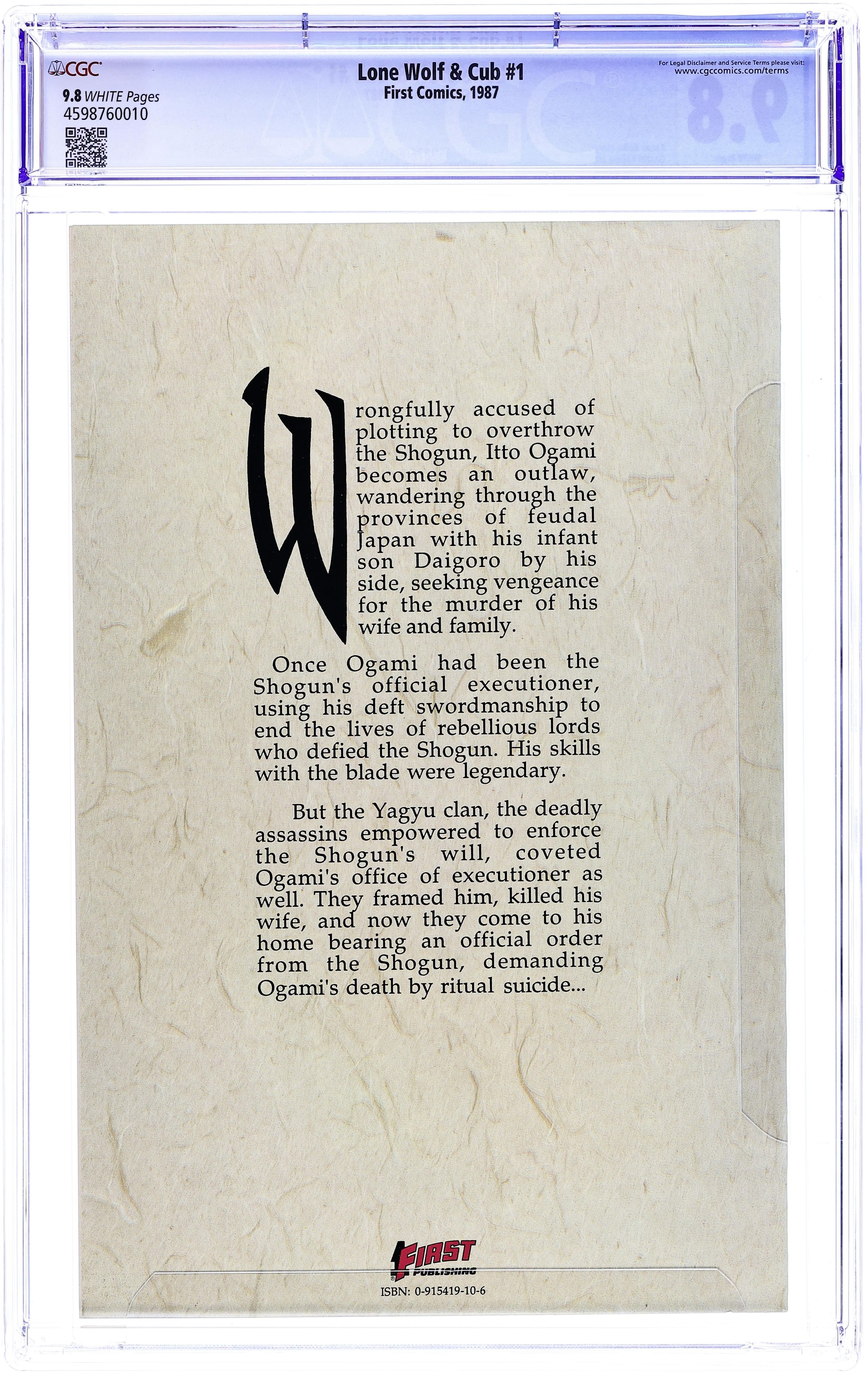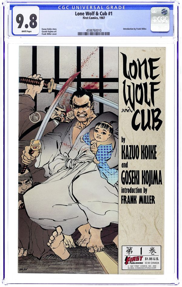 First printing. Frank Miller introduction and cover. Wrongfully accused of plotting to overthrow the Shogun, Itto Ogami becomes an outlaw, wandering through the provinces of feudal Japan, seeking vengeance for the murder of his wife and family. Awesome stories by Kazuo Koike and Goseki Kojma, presented in fantastic black and white art. Each issue in this series runs approximately 60 pages. Cover price $1.95.