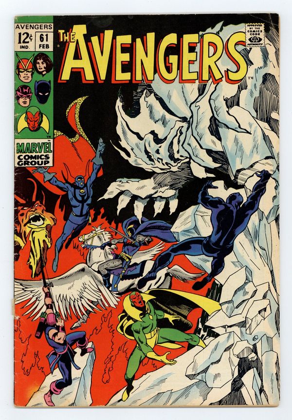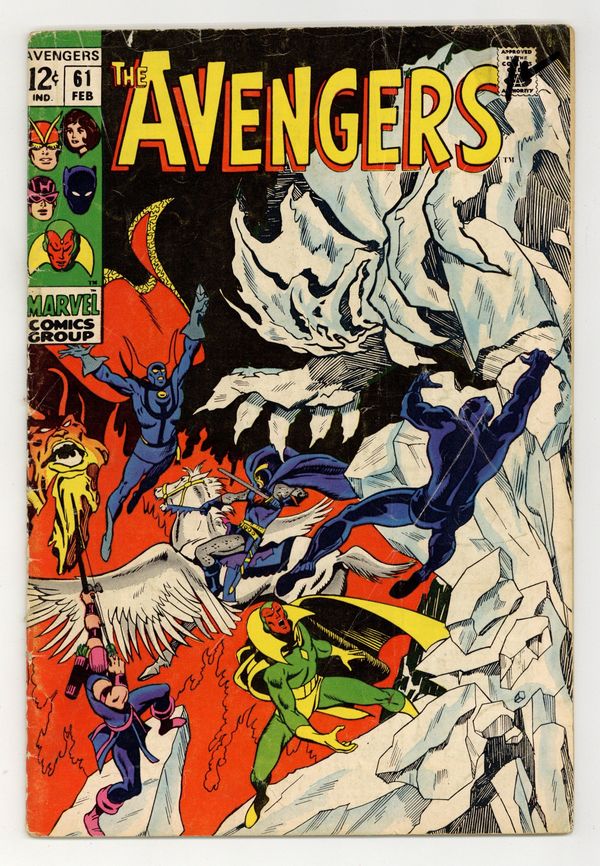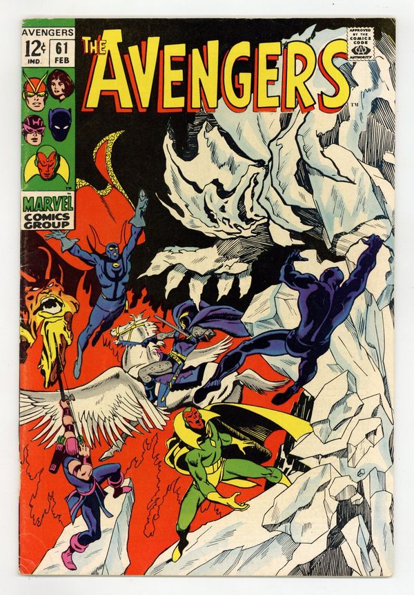 First appearance of the Avengers' Quinjet in "Some Say the World Will End in Fire, Some Say in Ice" Guest-starring Doctor Strange and the Black Knight. Script by Roy Thomas. Pencils by John Buscema. Inks by George Klein. Cover by John Buscema and George Klein. Story continues from Doctor Strange 178. A quiet night at Avengers Mansion is interrupted by the sudden arrival of the Master of the Mystic Arts! Dr. Strange warns that the Spell of Fire and Ice unleashed by the Sons of Satannish could destroy the world! And he requests immediate help from Earth's Mightiest Heroes! Without delay Hawkeye and the Black Knight rush to Antarctica to battle Surtur, while the Vision and T'Challa fly to Africa to fight Ymir! The Fire Demon and the Frost Giant are virtually indestructible! Does Doctor Strange have a magic ace up his sleeve (or perhaps cloak) to save the Earth? Avengers Lineup: Black Panther, Hawkeye, and the Vision. (Note: The letters page includes letters from comics editor Kim Metzger and Elfquest co-creator Richard Pini.) 36 pages. 12 cent cover price. Cover price $0.12.