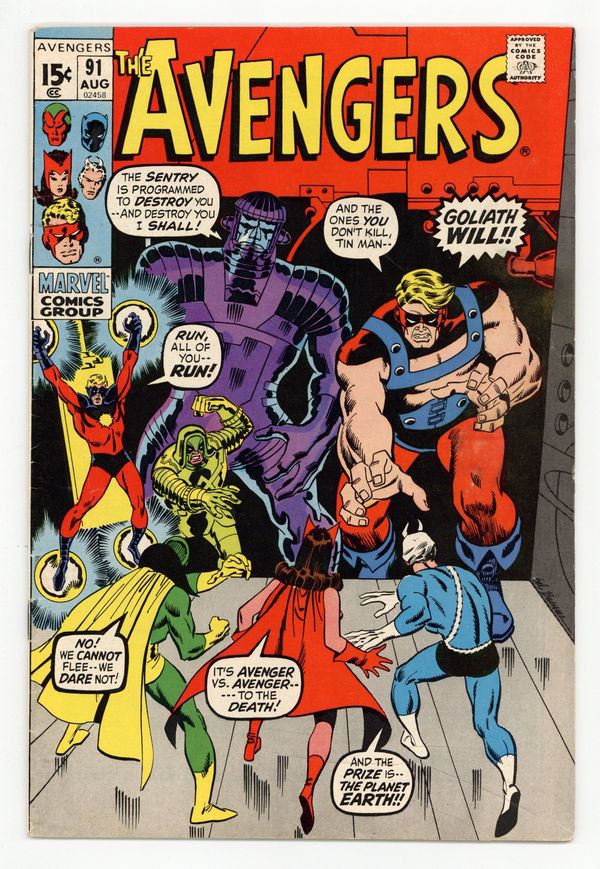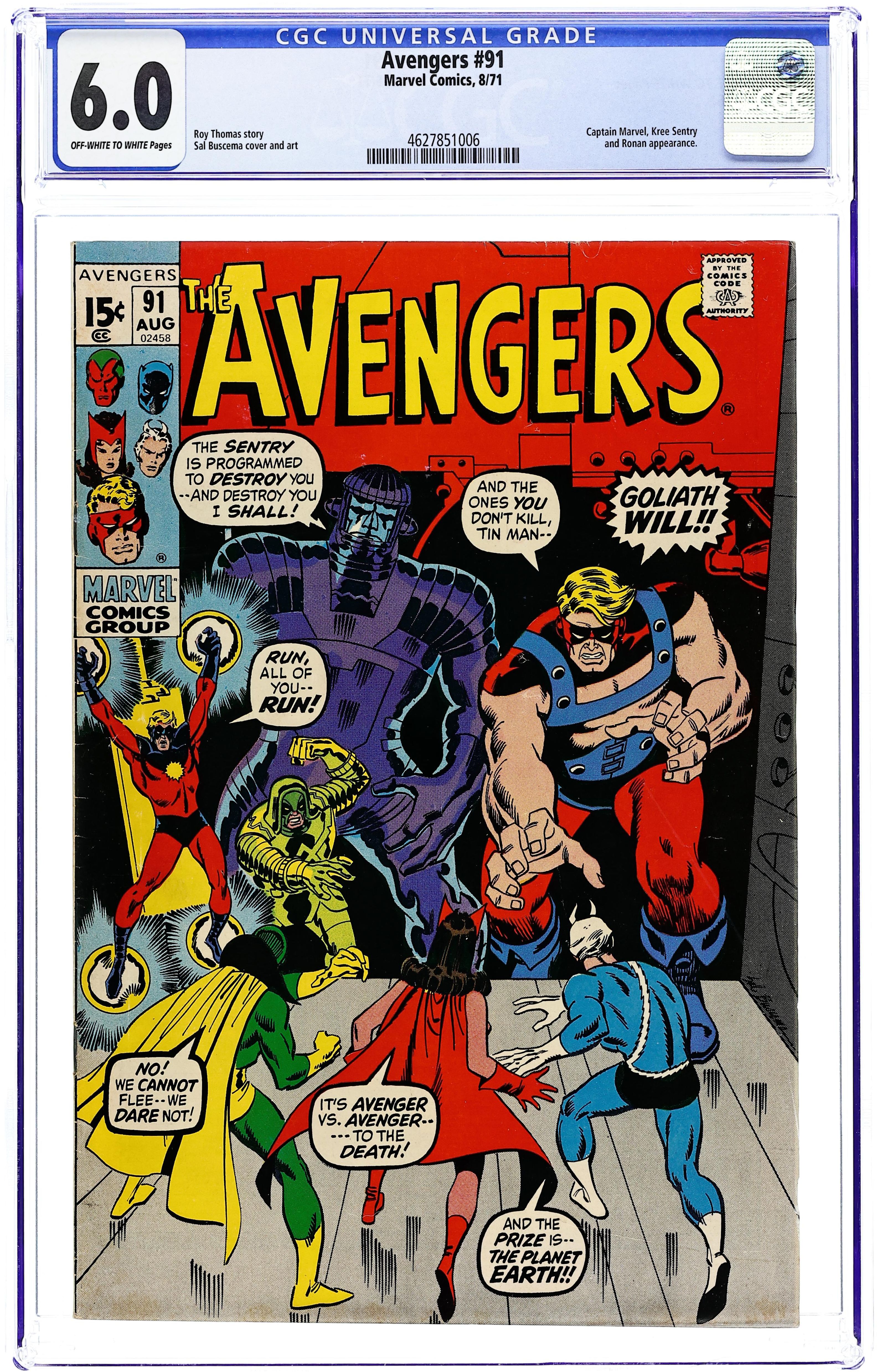 "Take One Giant Step -- Backward!" Part 3 of 9. Guest-starring Captain Marvel. Script by Roy Thomas. Pencils and Inks by Sal Buscema. Cover by Sal Buscema. Near the Arctic Circle, Ronan the Accuser implements the Kree's sinister plan to de-evolve mankind back to the stone age! And only the Mighty Avengers stand in his way! So, the battle lines are drawn to save the planet: Captain Marvel, Goliath, Quicksilver, Rick Jones, the Scarlet Witch, and the Vision vs. Sentry 459 and Ronan! But amid the life and death struggle at the top of the world, could love somehow blossom in the ranks of Earth's Mightiest? An outstanding issue! Cameo appearance by the Skrulls. Avengers Lineup: Goliath, Quicksilver, Scarlet Witch, Vision, Yellowjacket, and the Wasp. 36 pgs. Cover price $0.15.
