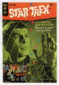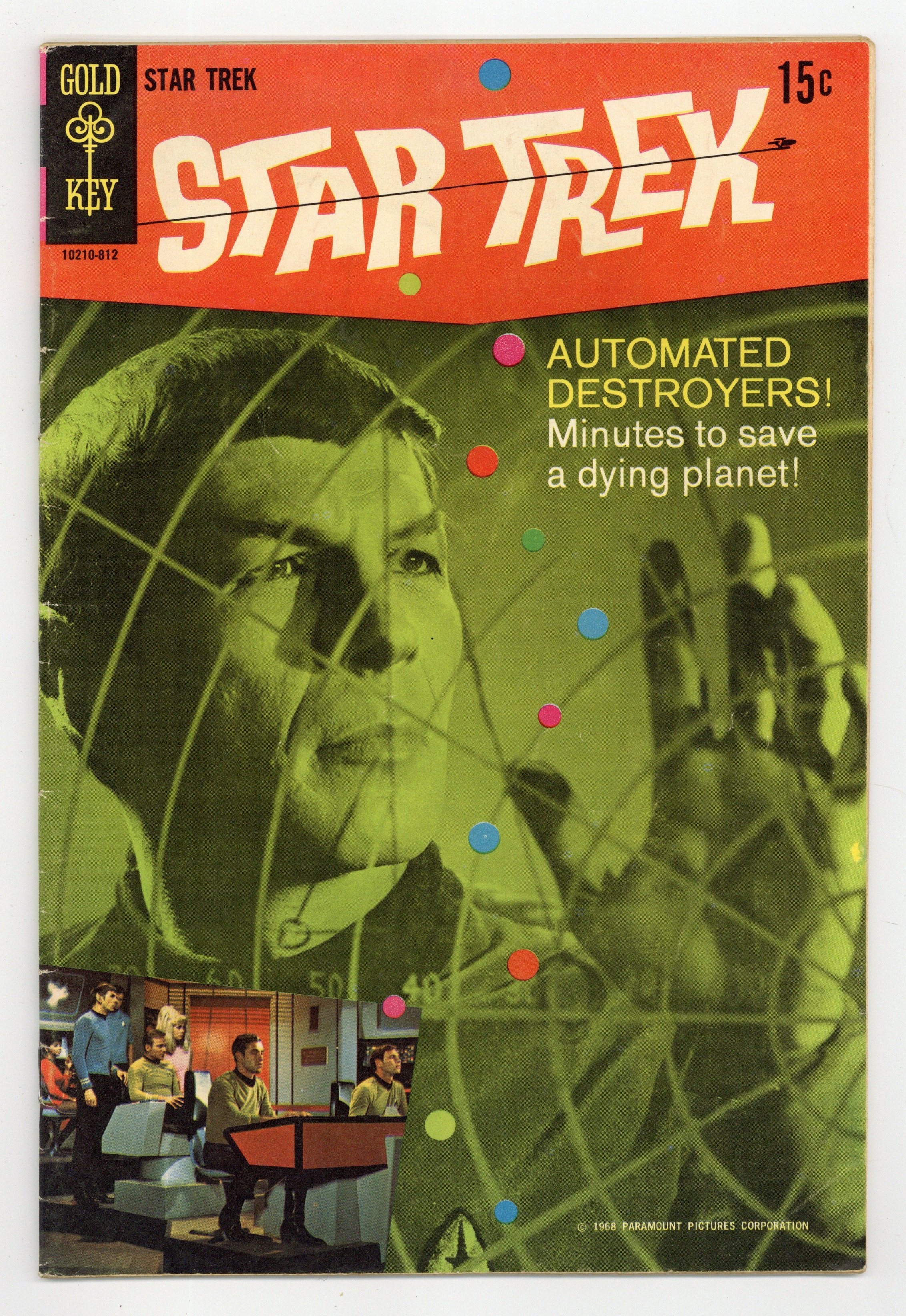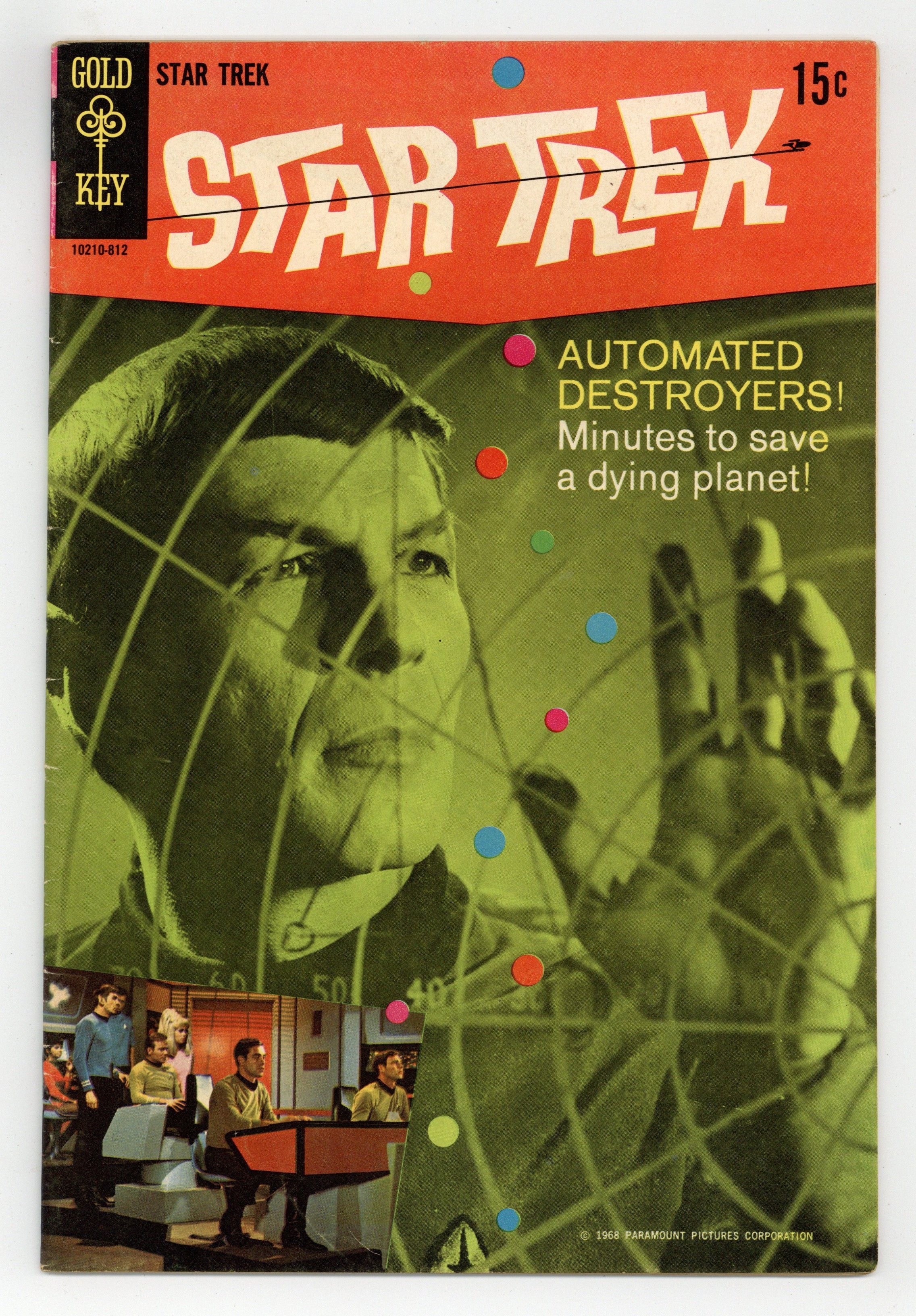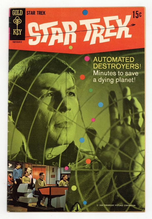 Comic book version of the original Star Trek TV series that starred William Shatner and Leonard Nimoy. Photo cover of Leonard Nimoy. NOTE: There are 2 versions of this comic. This version has an ad on the back cover. The other version has a photo back cover. "Part I: Invasion of the City Builders," script by Dick Wood, art by Alberto Giolitti; The planet Zarta has been taken over by their own technology; Machines that built their city have not stopped and have nearly filled the planet with one large vacant city. "Part II: The Bridge to Catastrophe," script by Dick Wood, art by Alberto Giolitti; When the Enterprise Crew show up they are quick to help the remaining people the best they can. 36 pgs., full color. $0.15. Cover price $0.15.