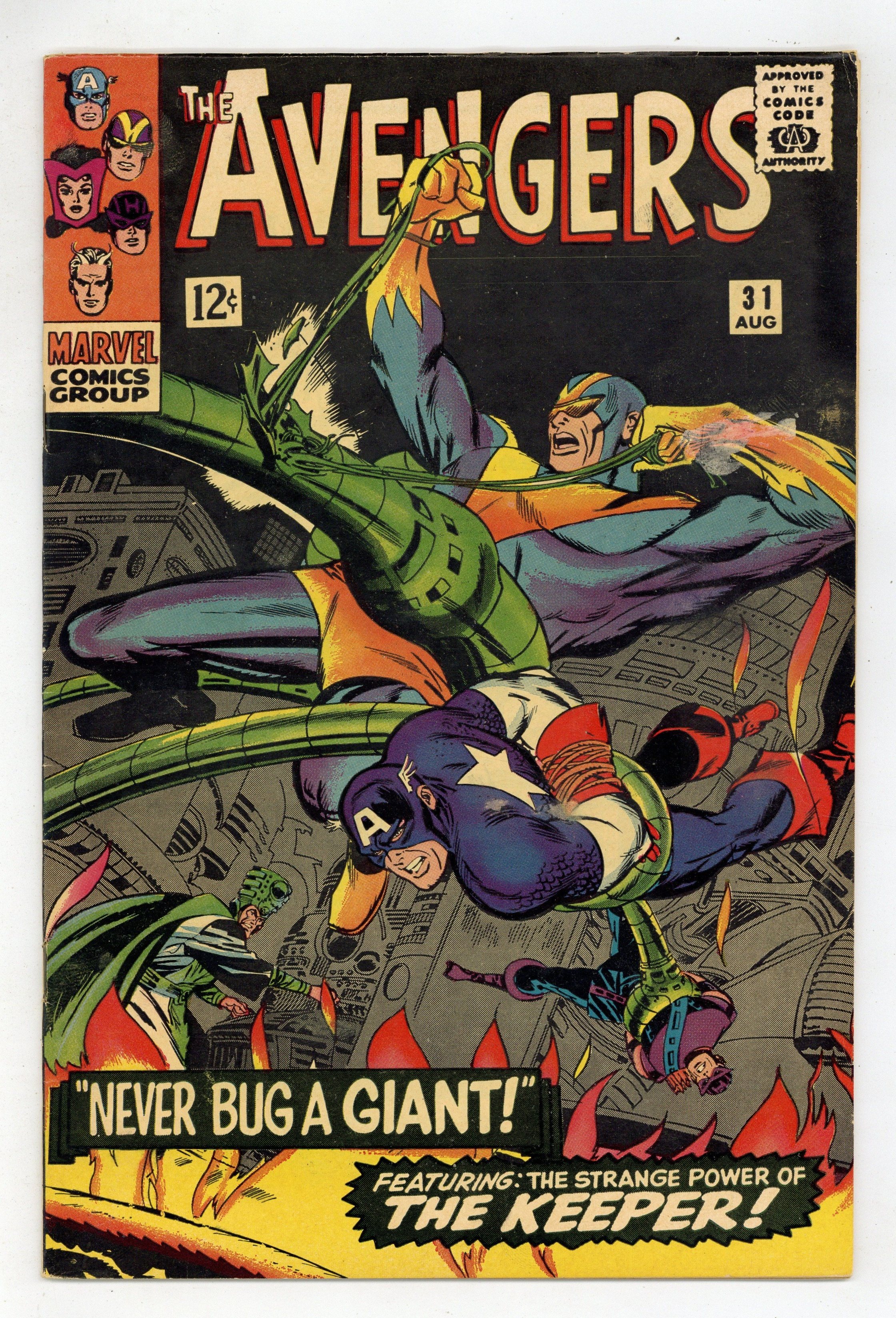 Tags: Marvel Legacy Numbering: Avengers (part 31), Avengers$22.50Cover by Don Heck. "Never Bug a Giant!", script by Stan Lee, pencils by Don Heck, inks by Frank Giacoia; Captain America, The Wasp and Hawkeye leave for South America to help Goliath; Meanwhile, Quicksilver and the Scarlet Witch realise how badly they like being Avengers and hope their powers return soon; Goliath and Prince Rey escape to Prince Rey's rebel hideout; He explains how the Keeper controls a powerful cobalt flame, capable of destroying the world; Goliath realizes Prince Rey only wants the flame for his own desires and leaves him; Goliath attacks the Keeper and gets captured; The other Avengers attack and also get captured with the exception of the Wasp; Prince Rey's forces attack the Keeper's, while at the same time, the Wasp frees all the Avengers; Hawkeye smothers the flame with explosive arrows, destroying it. Avengers roll call: Captain America, Hawkeye, Goliath, the Wasp, and, briefly, Quicksilver,and the Scarlet Witch. Reprinted in Giant-Size Marvel Triple Action #1. 36 pgs., full color. $0.12. Cover price $0.12.