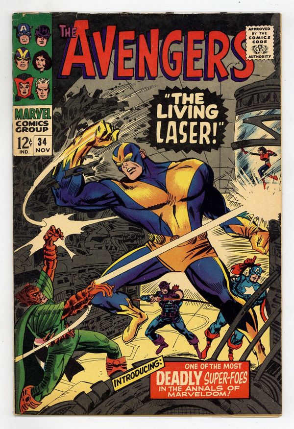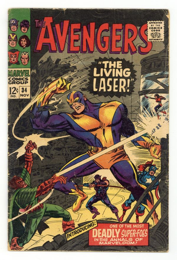 First appearance of the Living Laser in "The Living Laser!" Part 1 of 2. Script by Stan Lee. Art by Don Heck. Cover by Don Heck. A new super-villain bursts on the scene! And he's using -- light amplification by stimulated emission of radiation -- as his primary weapon! After robbing a bank, Arthur Parks (aka the Living Laser) has a chance encounter with Janet van Dyne...and he is immediately smitten by her beauty. But the Living Laser's attraction to the Wasp is twisted -- and he attacks Goliath in order to eliminate him from Jan's life! Hank Pym defeats the Living Laser, and itseems like the episode is over. However Arthur Parks escapes and begins a new crime spree across the city! So now the Avengers have to find and defeat the Living Laser again! Cameo appearance by Dr. Bill Foster. Avengers Lineup: Captain America, Goliath, Hawkeye, and the Wasp. (Notes: This story completes Stan Lee's excellent scripting run on the Avengers title -- which began with issue #1 in 1963. This story was reprinted in Marvel Triple Action #26.) 36 pages. Cover price $0.12.