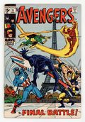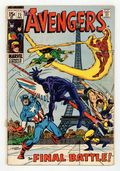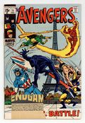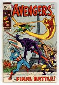 Tags: Marvel Legacy Numbering: Avengers (part 71), Avengers$51.00"Endgame!" Part 3 of 3. Guest-starring the Invaders (first appearance). Script by Roy Thomas. Pencils by Sal Buscema. Inks by Sam Grainger. Cover by Buscema and Grainger. The Avengers battle the Invaders in 1941 occupied France! Cameo appearances by Ravonna and the original 6th century Black Knight (aka Sir Percy). Notes: The plot of Avengers 71 overlaps with Invaders Annual 1 published eight years later in 1977. The last page is a pin-up featuring the Avengers. Kang returns in Incredible Hulk 135. This is the second appearance of the original Human Torch in Silver Age/Bronze Age continuity. This issue was reprinted in Marvel Super Action 32 and Giant Size (2008) Avengers Invaders. 36 pages. Cover price $0.15.