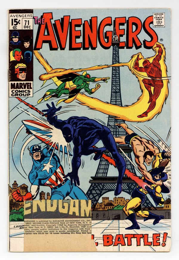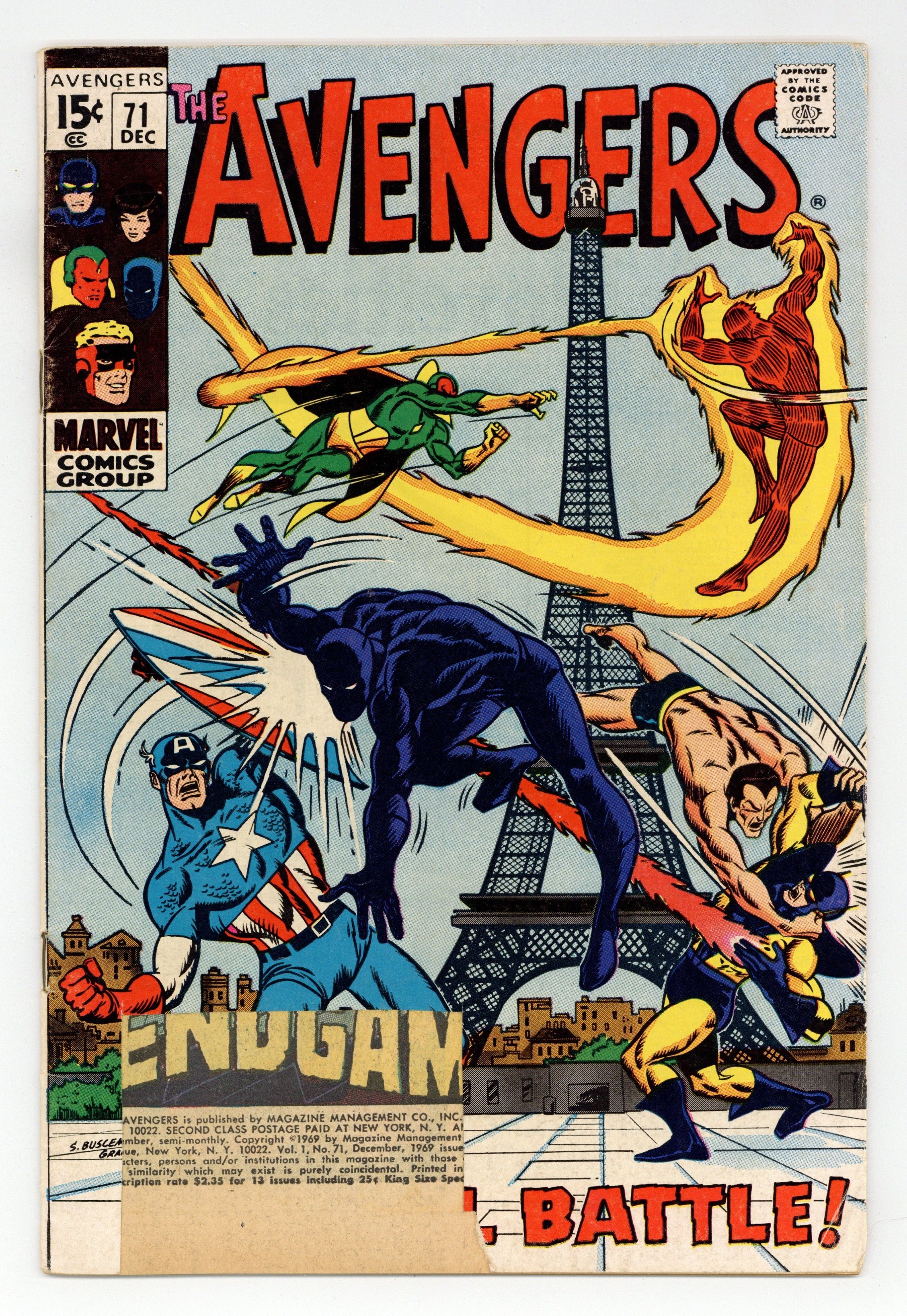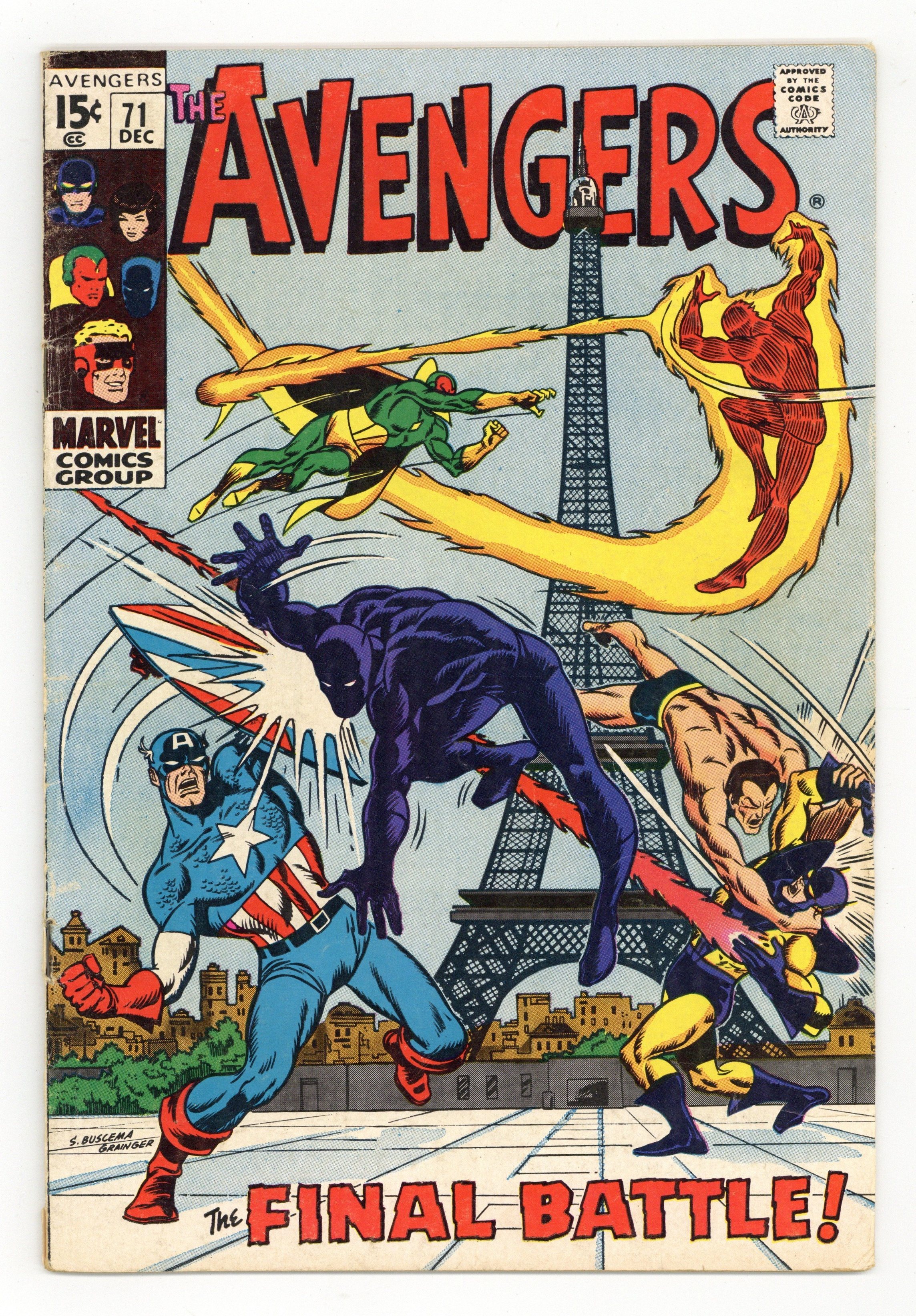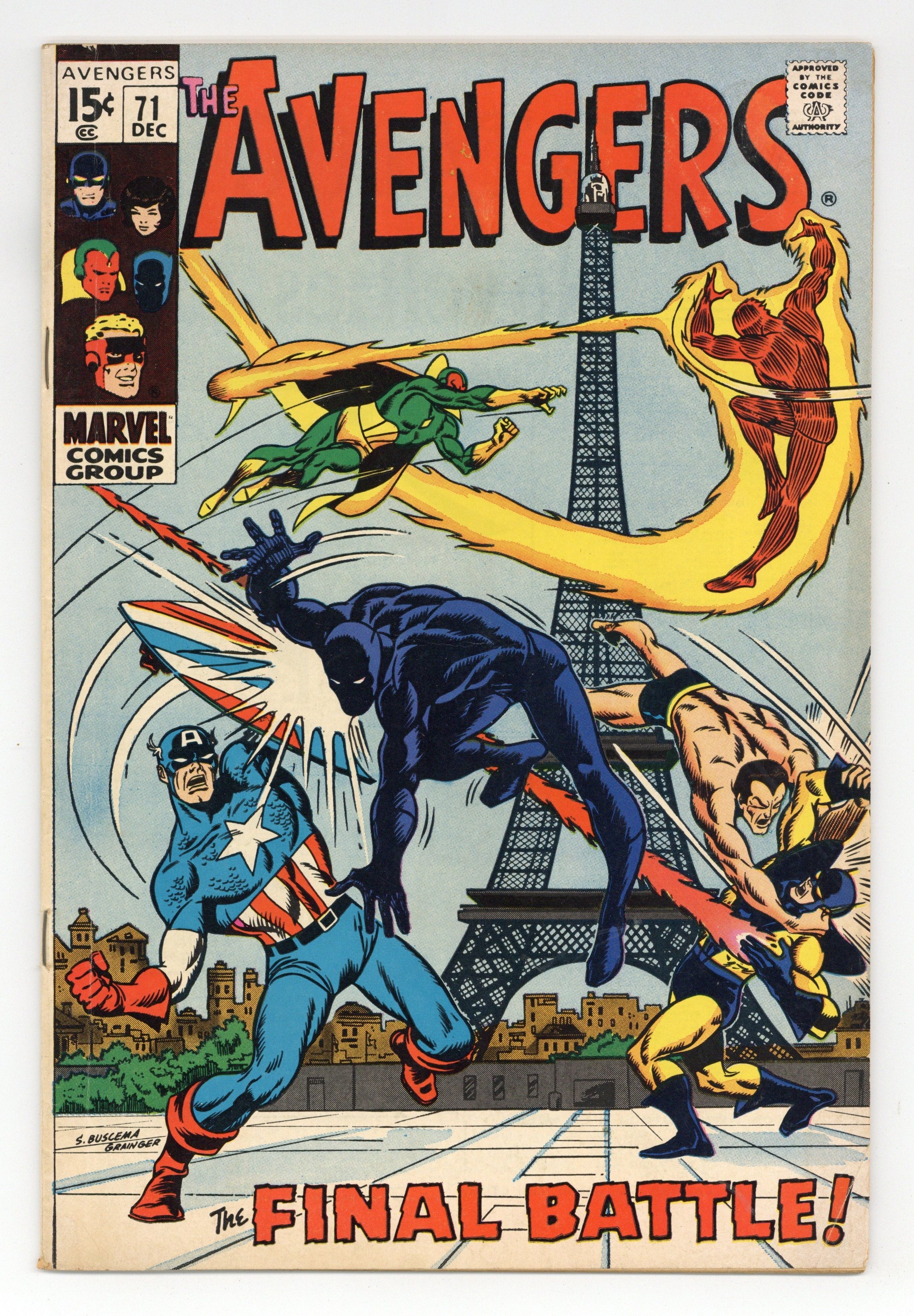 "Endgame!" Part 3 of 3. Guest-starring the Invaders (first appearance). Script by Roy Thomas. Pencils by Sal Buscema. Inks by Sam Grainger. Cover by Buscema and Grainger. The Avengers battle the Invaders in 1941 occupied France! Cameo appearances by Ravonna and the original 6th century Black Knight (aka Sir Percy). Notes: The plot of Avengers 71 overlaps with Invaders Annual 1 published eight years later in 1977. The last page is a pin-up featuring the Avengers. Kang returns in Incredible Hulk 135. This is the second appearance of the original Human Torch in Silver Age/Bronze Age continuity. This issue was reprinted in Marvel Super Action 32 and Giant Size (2008) Avengers Invaders. 36 pages. Cover price $0.15.