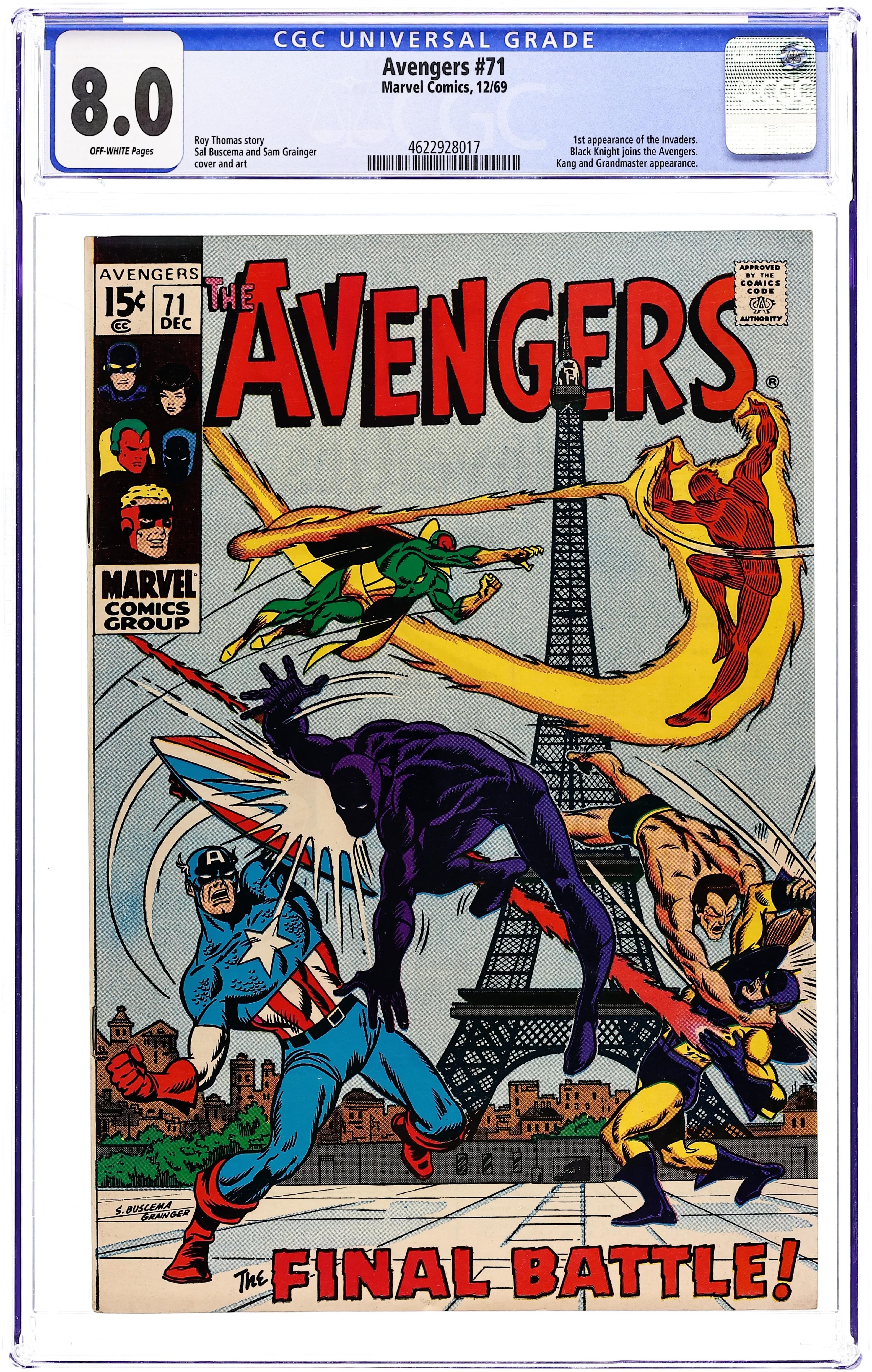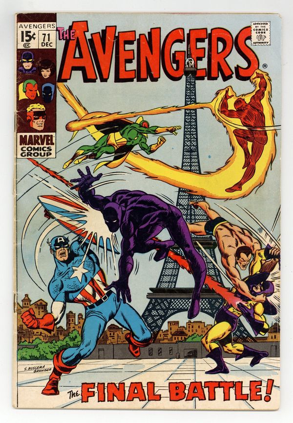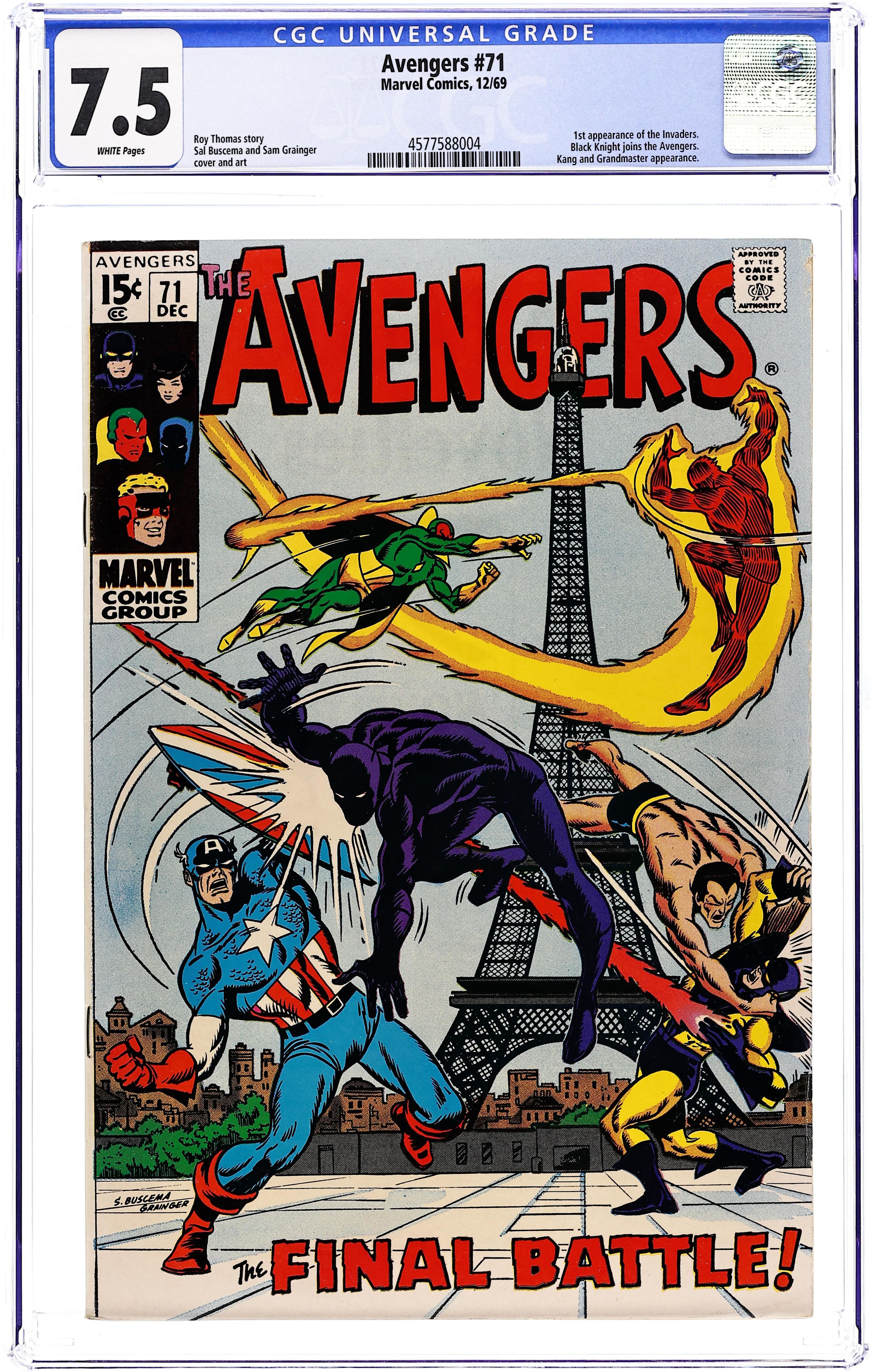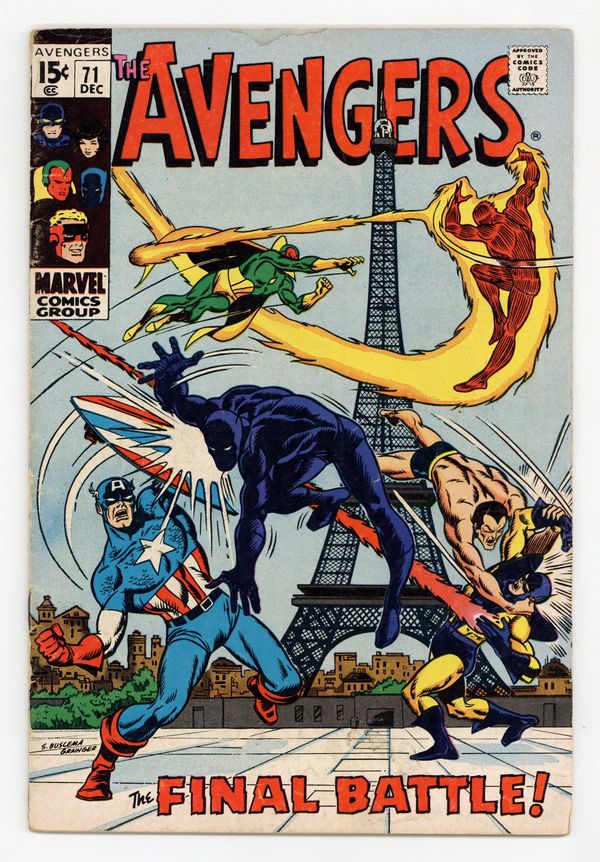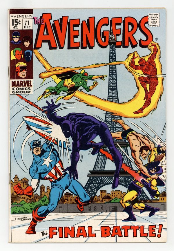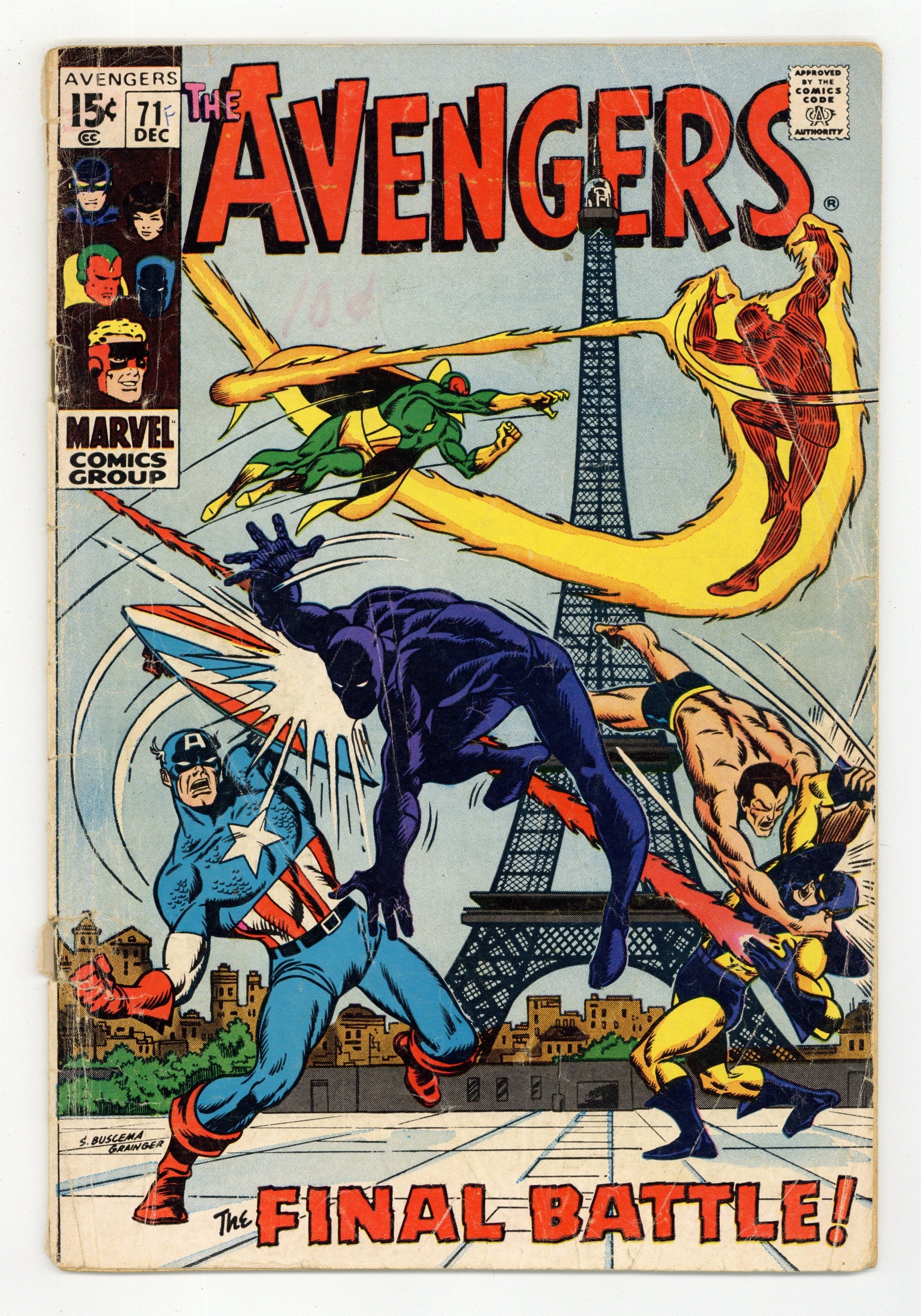 "Endgame!" Part 3 of 3. Guest-starring the Invaders (first appearance). Script by Roy Thomas. Pencils by Sal Buscema. Inks by Sam Grainger. Cover by Buscema and Grainger. The Avengers battle the Invaders in 1941 occupied France! Cameo appearances by Ravonna and the original 6th century Black Knight (aka Sir Percy). Notes: The plot of Avengers 71 overlaps with Invaders Annual 1 published eight years later in 1977. The last page is a pin-up featuring the Avengers. Kang returns in Incredible Hulk 135. This is the second appearance of the original Human Torch in Silver Age/Bronze Age continuity. This issue was reprinted in Marvel Super Action 32 and Giant Size (2008) Avengers Invaders. 36 pages. Cover price $0.15.