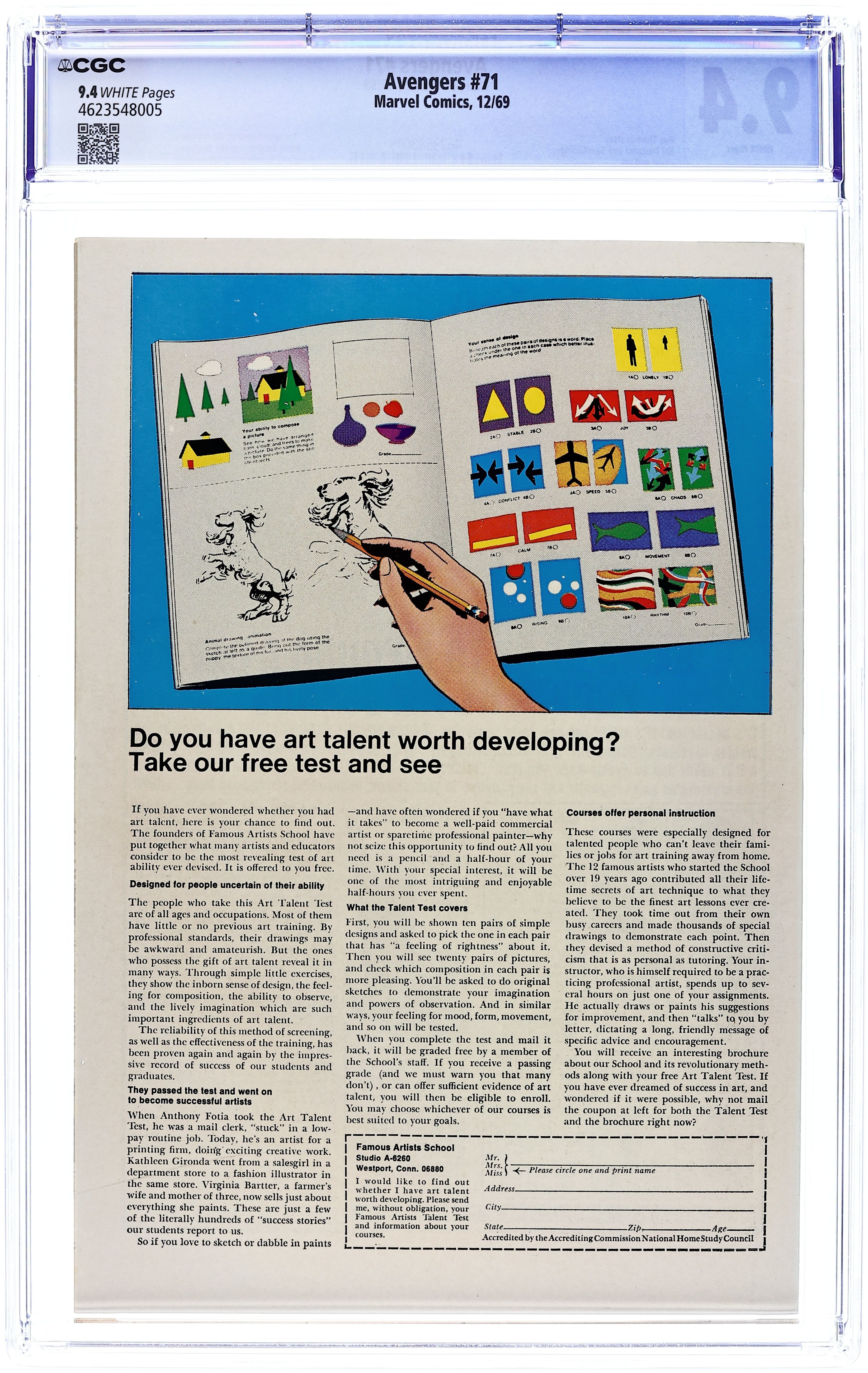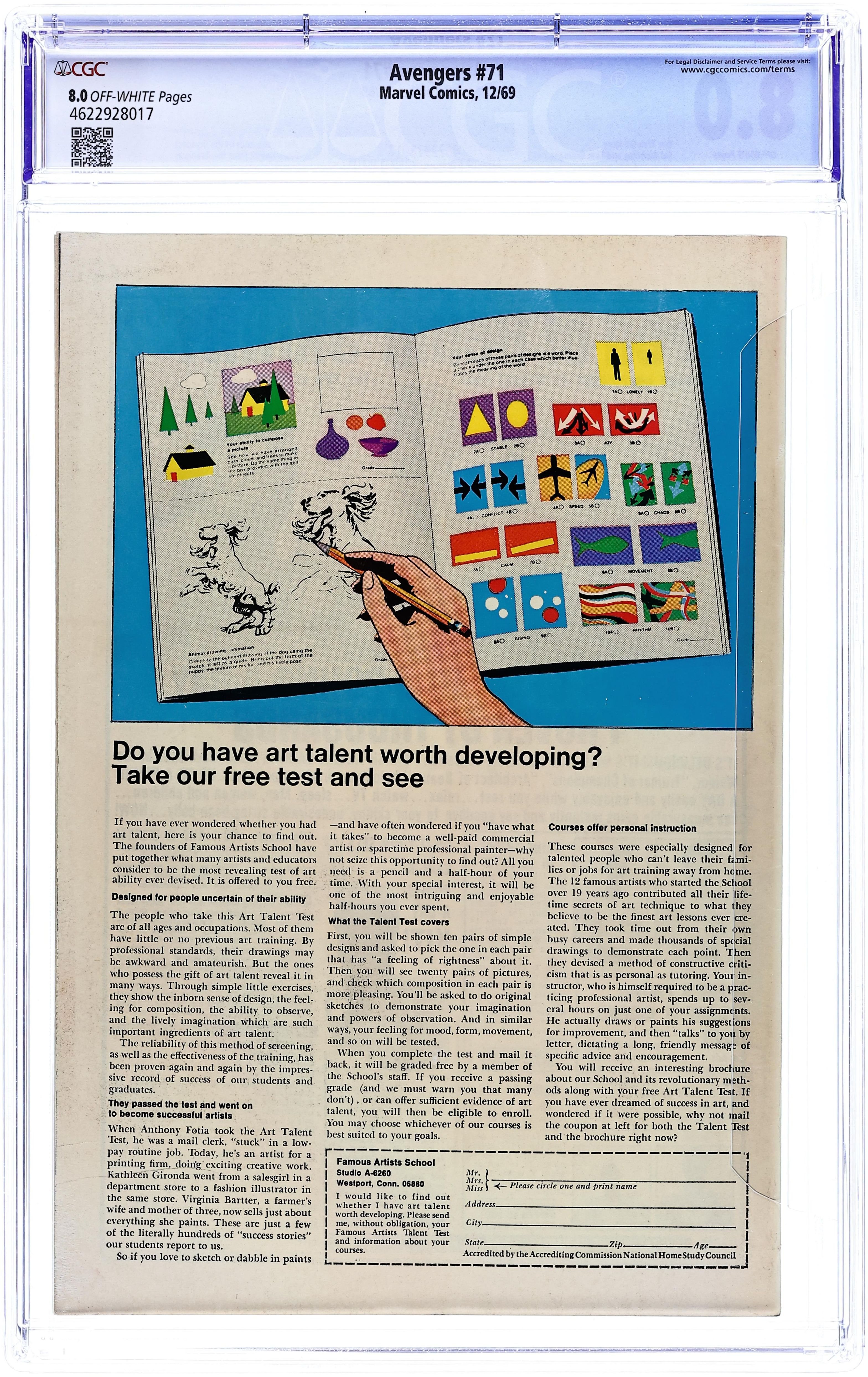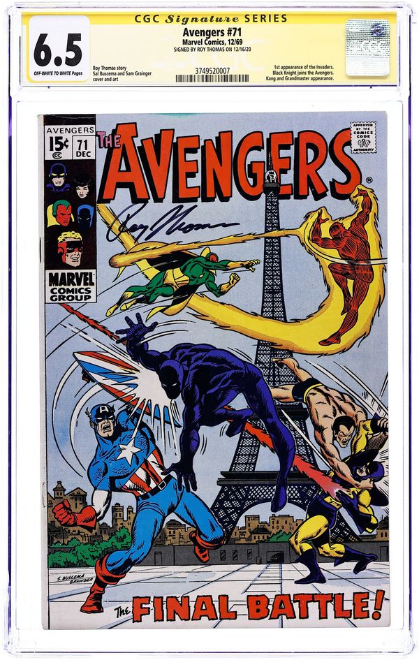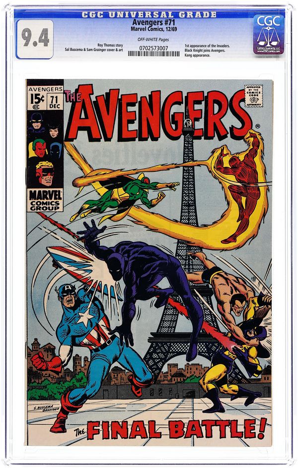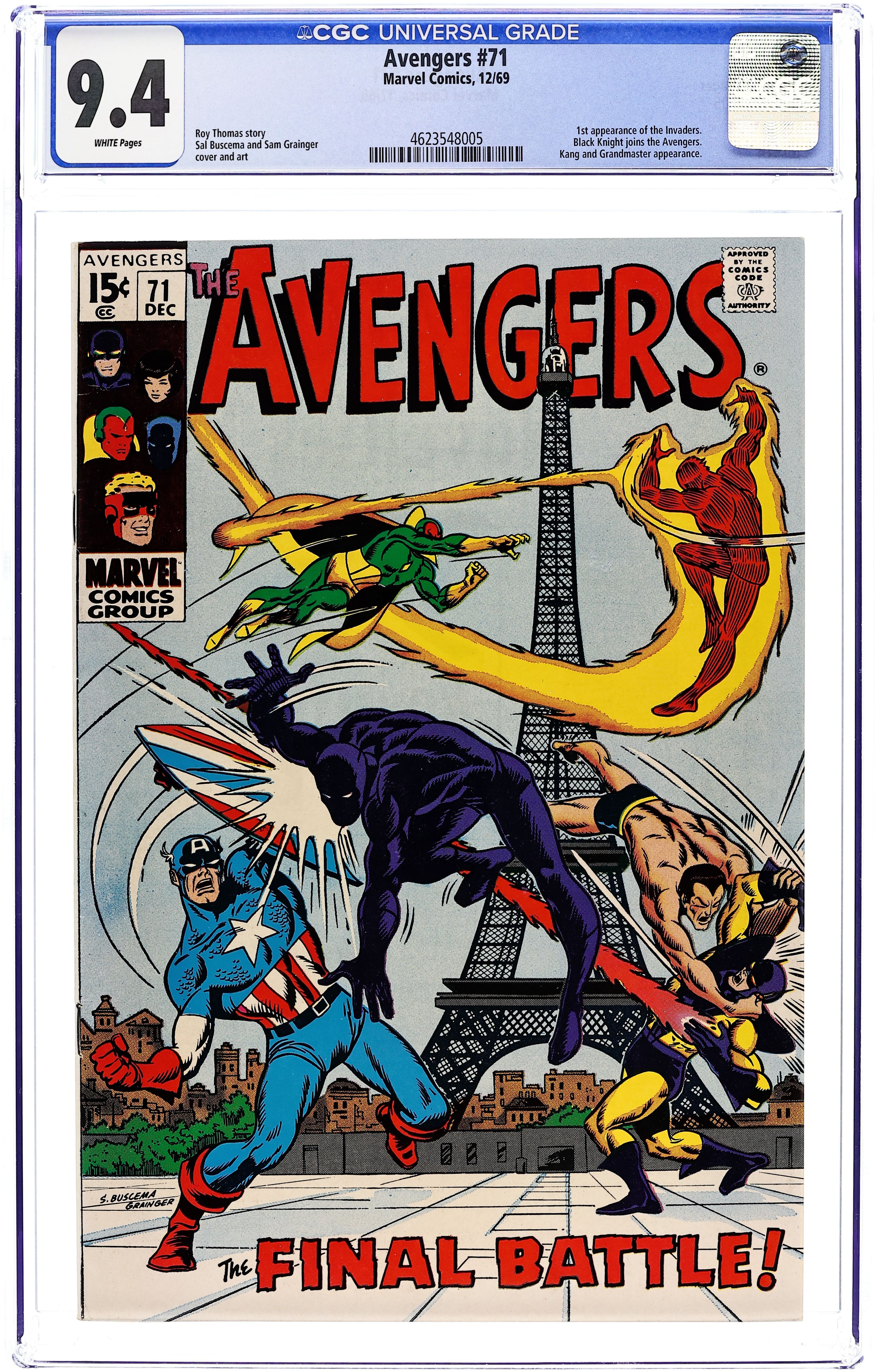 "Endgame!" Part 3 of 3. Guest-starring the Invaders (first appearance). Script by Roy Thomas. Pencils by Sal Buscema. Inks by Sam Grainger. Cover by Buscema and Grainger. The Avengers battle the Invaders in 1941 occupied France! Cameo appearances by Ravonna and the original 6th century Black Knight (aka Sir Percy). Notes: The plot of Avengers 71 overlaps with Invaders Annual 1 published eight years later in 1977. The last page is a pin-up featuring the Avengers. Kang returns in Incredible Hulk 135. This is the second appearance of the original Human Torch in Silver Age/Bronze Age continuity. This issue was reprinted in Marvel Super Action 32 and Giant Size (2008) Avengers Invaders. 36 pages. Cover price $0.15.