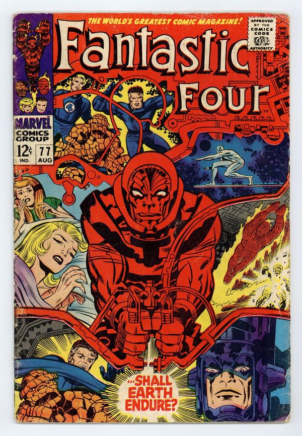 Tags: Fantastic Four$12.00Cover pencils by Jack Kirby, inks by Joe Sinnott. Shall Earth Endure?, script by Stan Lee and Jack Kirby (co-plot), pencils by Jack Kirby, inks by Joe Sinnott; Reed, Ben, and Johnny battle Psycho-Man in the Microverse. Letter to the editor from comics writer Tony Isabella. Reprinted in Marvel's Greatest Comics # 59. 36 pgs. $0.12. Cover price $0.12.